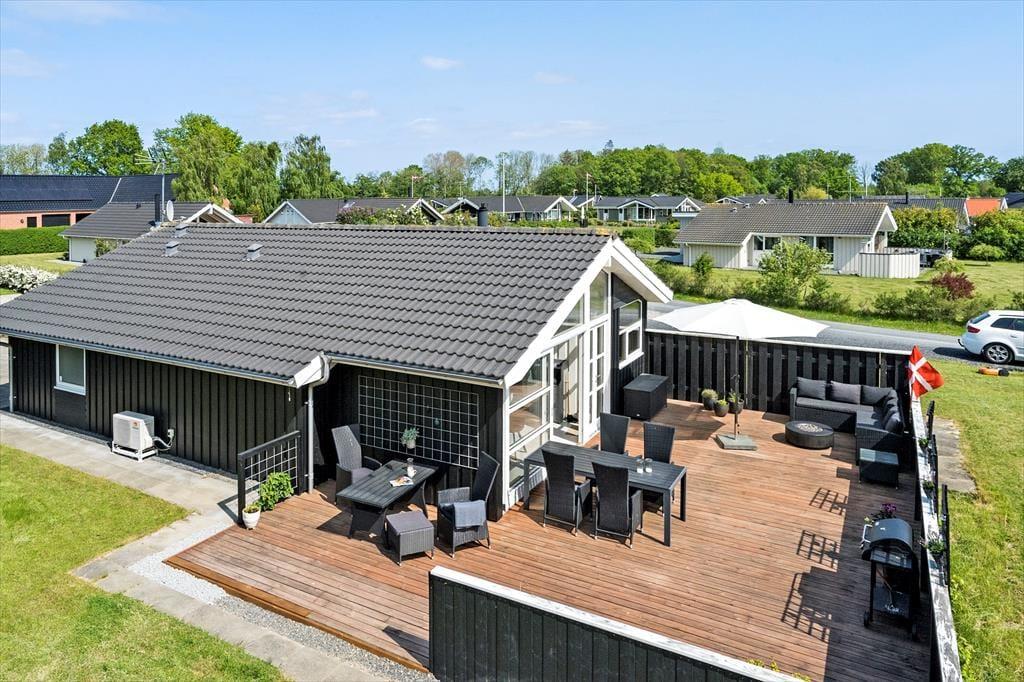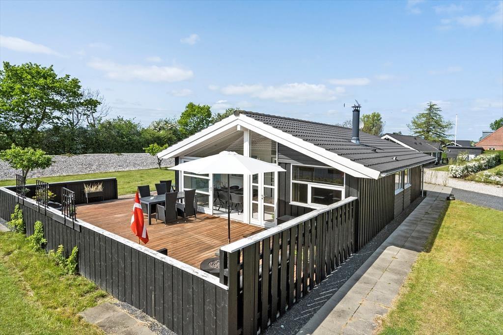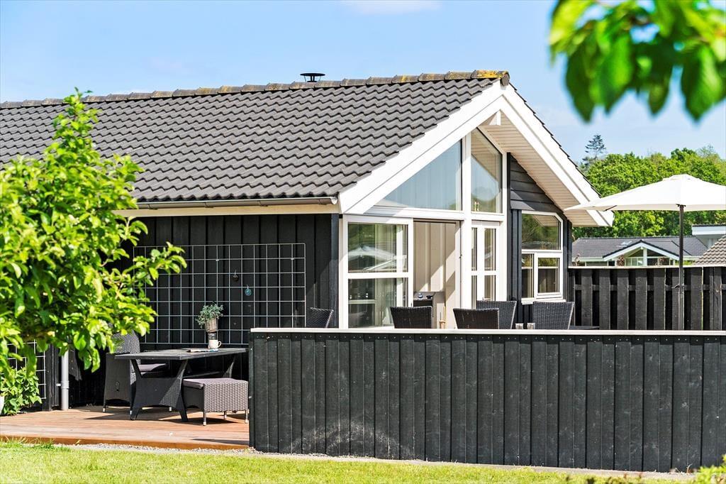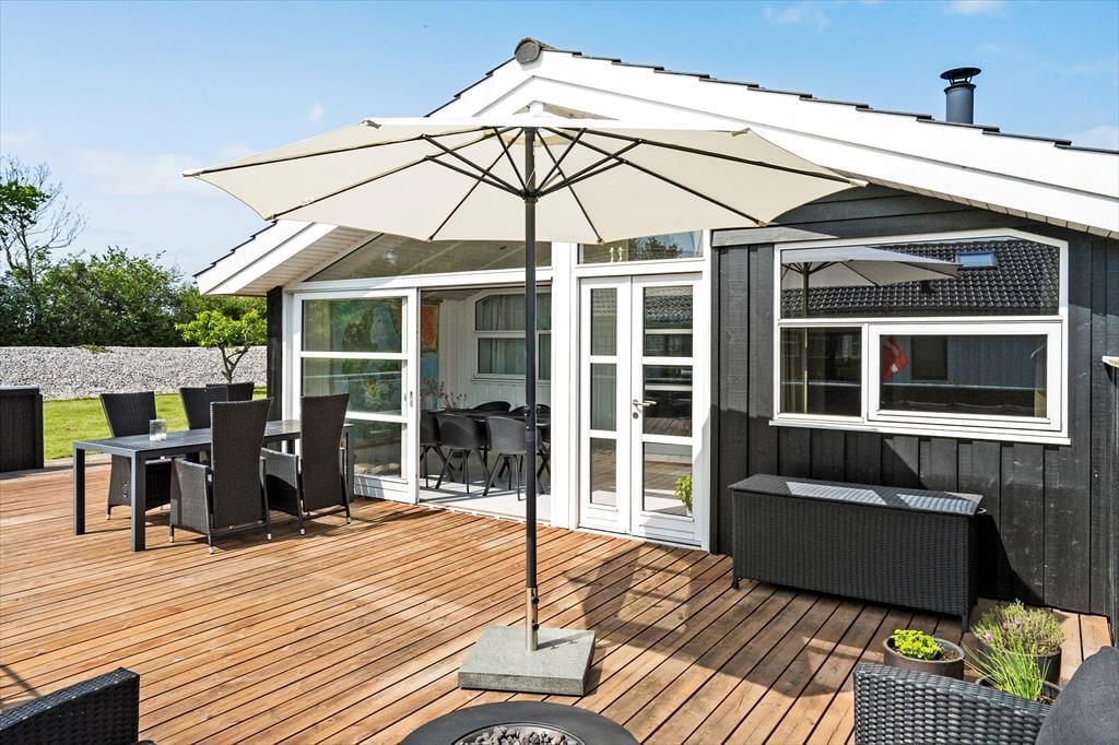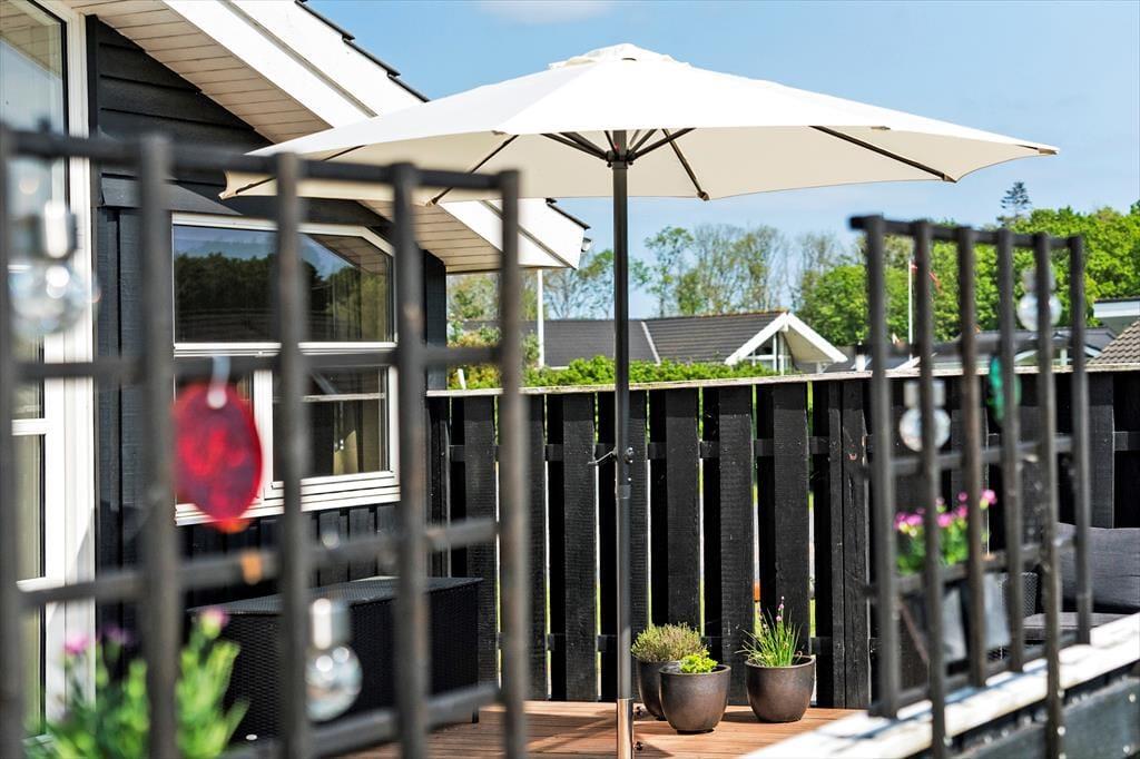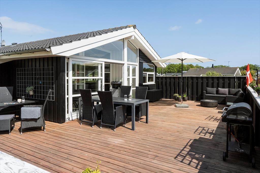 Den rummelige og åbne træterrasse er perfekt at opholde sig på i fint vejr. Her er god plads til, at alle kan samles og slappe af i havemøblerne eller under parasollen. Aftensmåltidet kan også fint tilberedes på husets gasgrill. Terrassen er fint afskærmet af et stakit, så her har man både overblik og privatliv.