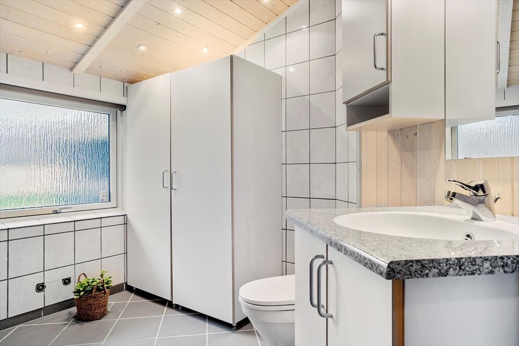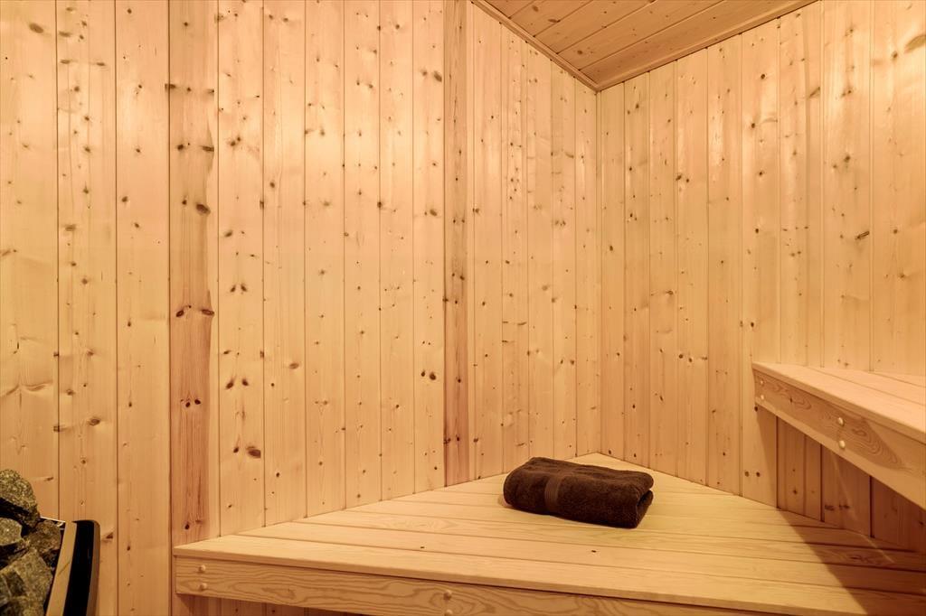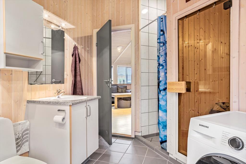 Husets badeværelse er centralt placeret og har udover brusebad også en kombineret vaskemaskine og tørretumbler. Fra badeværelset er der adgang til saunaen, der er fint og klassisk indrettet med god siddeplads.