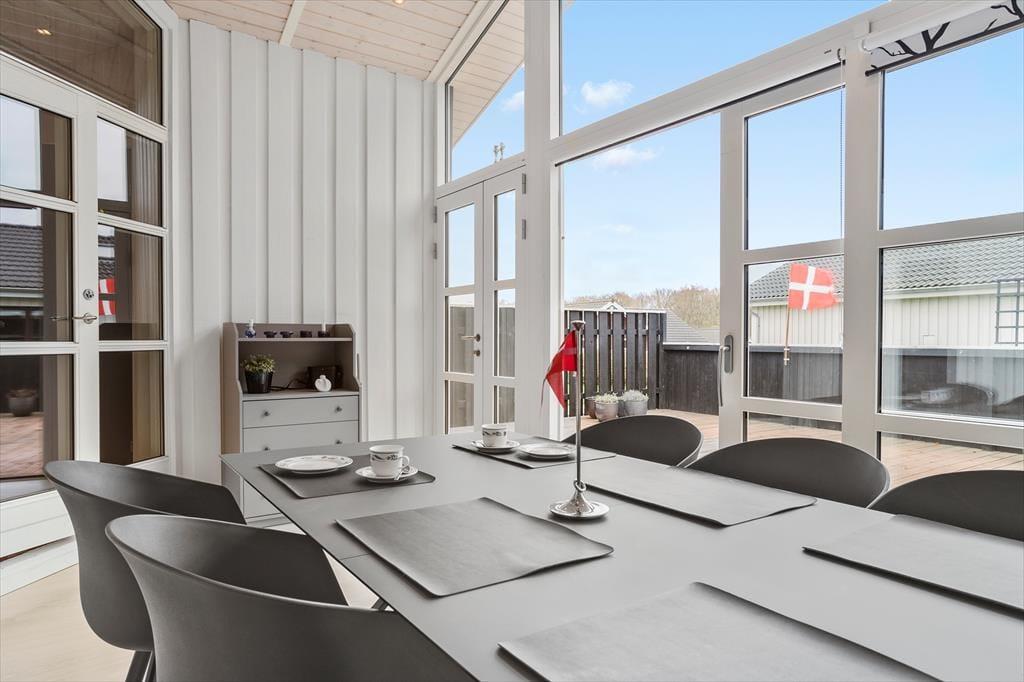 I forlængelse af stuen er en skøn havestue, hvor dagens måltider kan nydes. De store vinduer giver et dejligt lysindfald ved spisebordet, så det er et lyst og hyggeligt sted at samles.