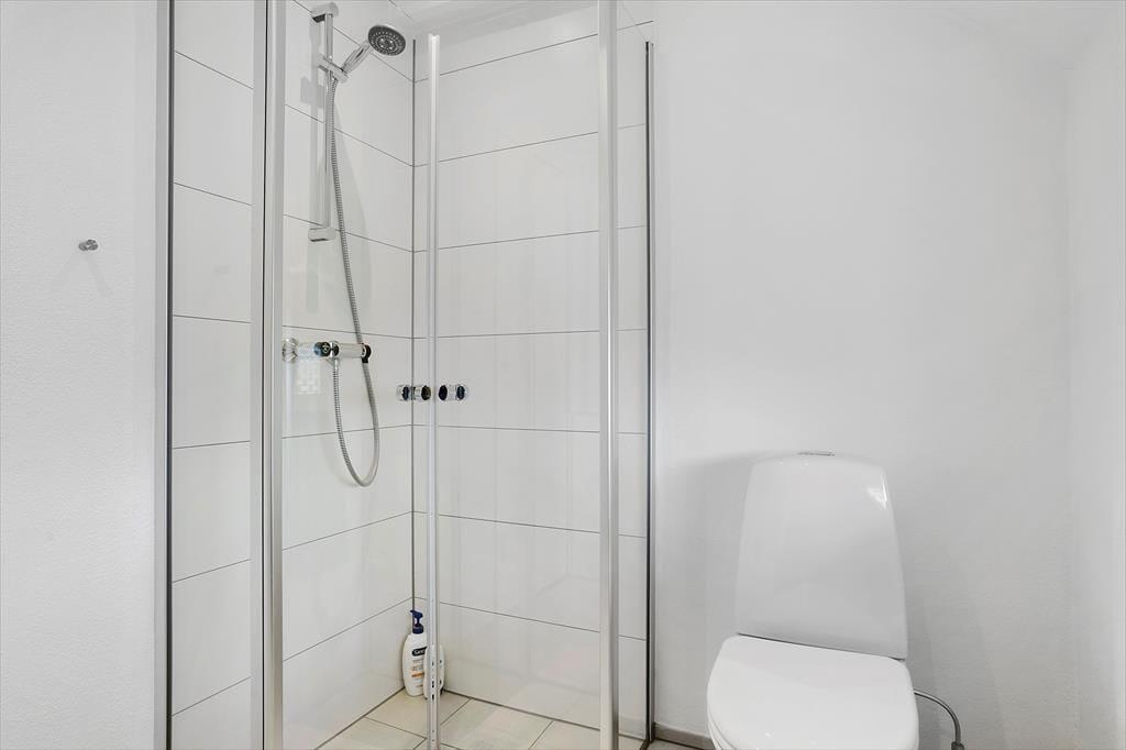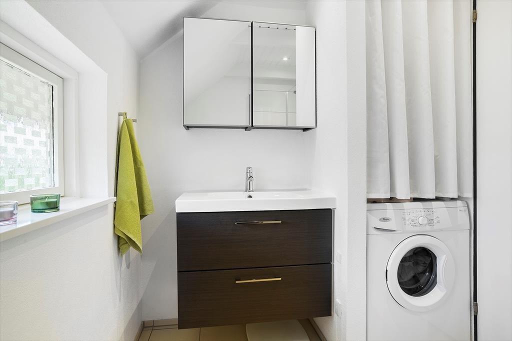 Ved værelserne er også husets badeværelse, der fremstår moderne med bruser og vaskemaskine til rådighed. Badeværelset har gulvvarme, mens der er varmepumpe til opvarmning og nedkøling i resten af huset.