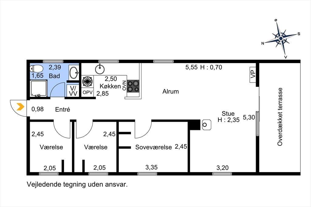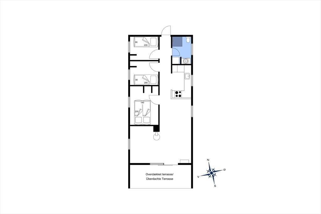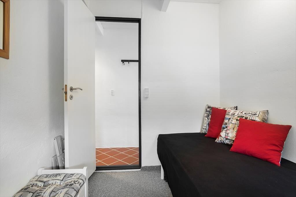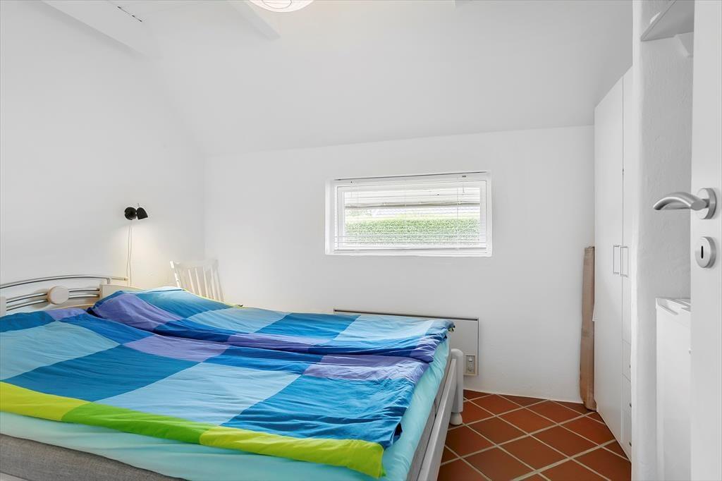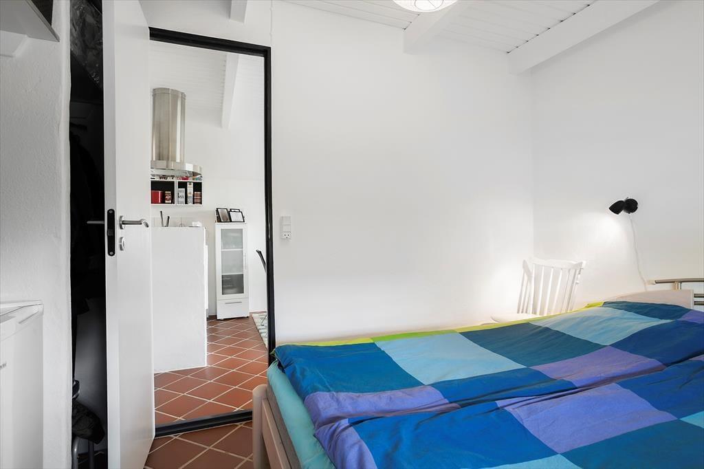 Fra entreen træder man ind i en mellemgang, hvor der er adgang til badeværelset og husets tre soveværelser. Det ene soveværelse har en fin dobbeltseng (160x200 cm), med god skabsplads og direkte udgang til køkkenet. De to mindre værelser har enkeltmandssenge og opbevaringsplads. Huset er altså ideelt til eksempelvis en familie med to voksne og to børn.