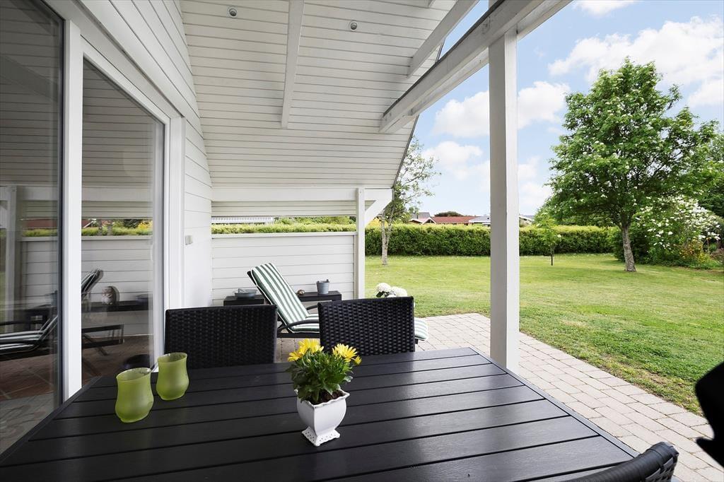 Den delvist overdækkede terrasse er en forlængelse af husets stue, hvorfra man kan nyde den dejlige have. Haven er grøn og omkranset af buske, så her er plads til at være privat og spille et spil på den store græsplæne.
