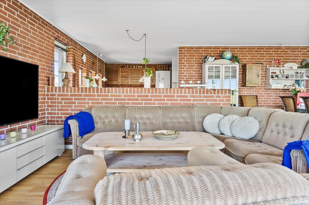 Husets centrale rum er en stor stue, hvor sofahjørnet indbyder til hygge med hele familien i de bløde møbler. Samtidig er der god sammenhæng med køkkenet og spisebordet, hvor der er god plads til, at alle kan opholde sig og tilberede og selvfølgelig nyde dagens måltider.