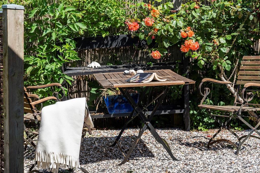 Terrassen er hyggeligt indrammet af buske, stakit og krukker, så den gode udsigt kan nydes i den velholdte have. Her er også lavet et hyggeligt træshelter, der står fint afskærmet af buske, men samtidig med den fantastiske havudsigt, som man kan nyde i fulde drag herfra.