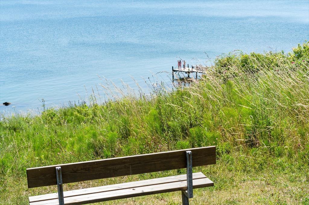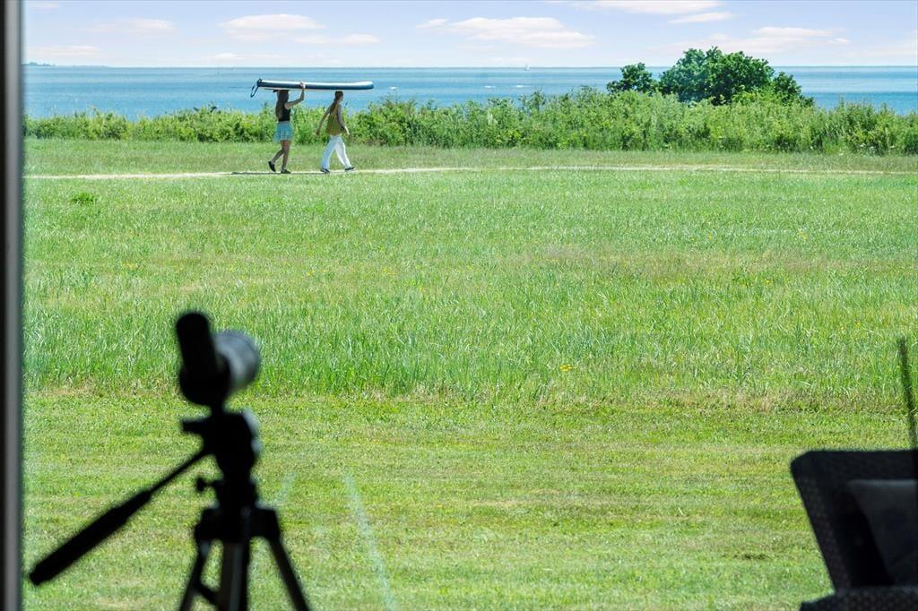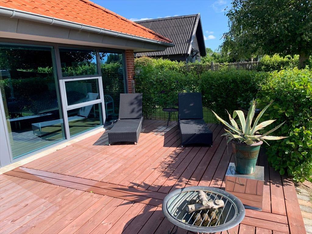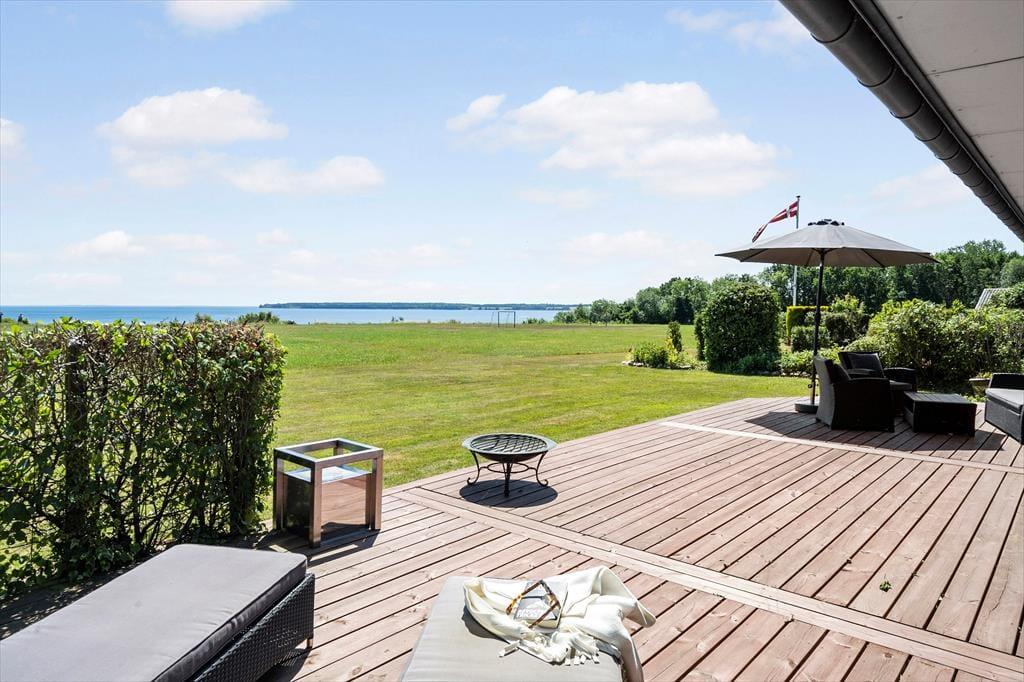 Foran huset er en dejlig træterrasse der både er øst- og sydvendt. Her findes gode havemøbler, liggestole, grill og et bålfad, så terrassen bliver naturligt en forlængelse af husets opholdsrum. Fra stuen er der direkte udgang til terrassen, og fortsætter man på gåben kan man gå over græsplænen, hvor der er en sti direkte ned til vandet, der ligger kun 50 meter fra huset.