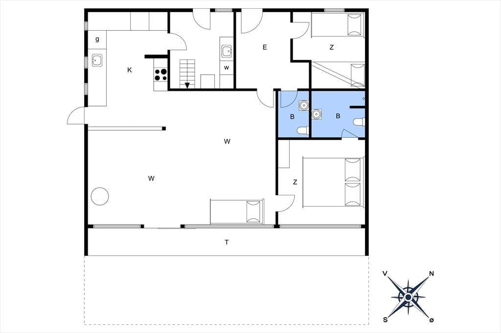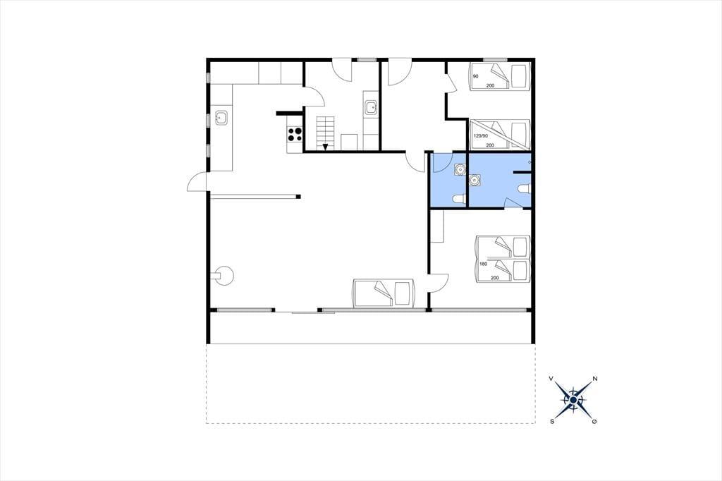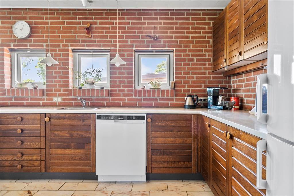 Køkkenet er i direkte forbindelse med stuen/alrummet, hvor en halvmur gør det muligt at lave mad og samtidig deltage i snakken ved spisebordet. Køkkenet har gode faciliteter, og alt hvad du skal bruge til feriens måltider. Her er blandt andet komfur, køle/fryseskab, kaffemaskine og opvaskemaskine.