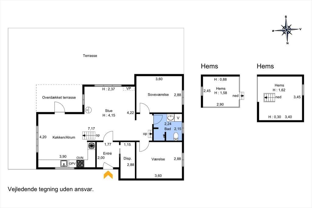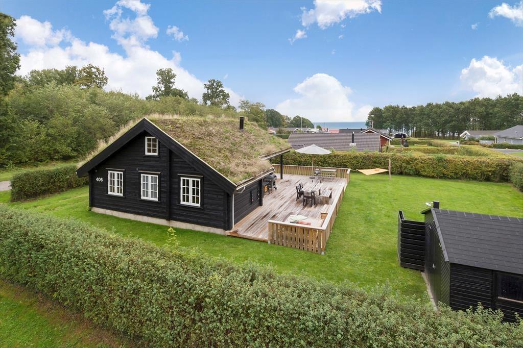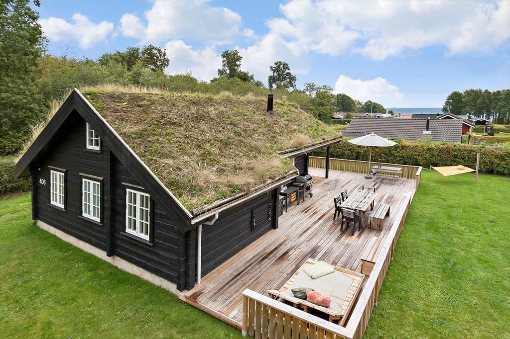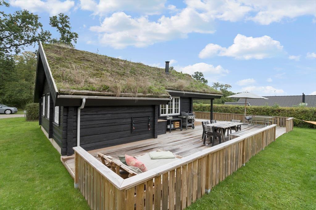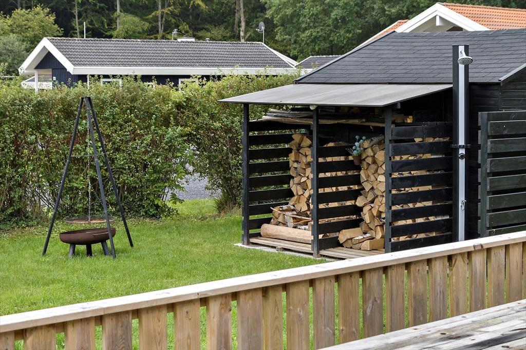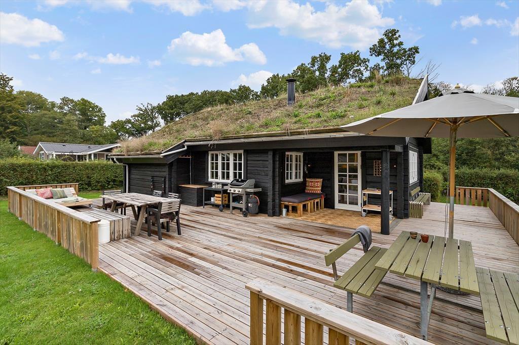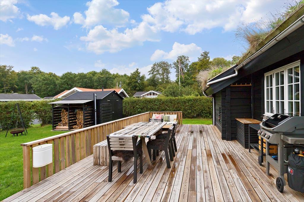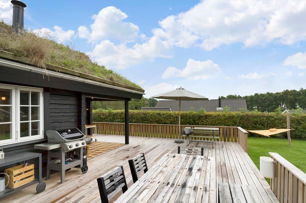 Fra køkken/alrummet er der udgang til den store træterrasse, som går halvvejs rundt om hytten. Her er plads til samvær, afslapning med en god bog i solens stråler og ikke mindst hyggelige grillaftener. Terrassen er desuden delvist overdækket og er helt perfekt at forlænge de danske sommeraftener. Hytten har også en stor have med plads til både, leg, boldspil og bålhygge. I kan også nyde godt af udebruseren efter en tur i vandet.