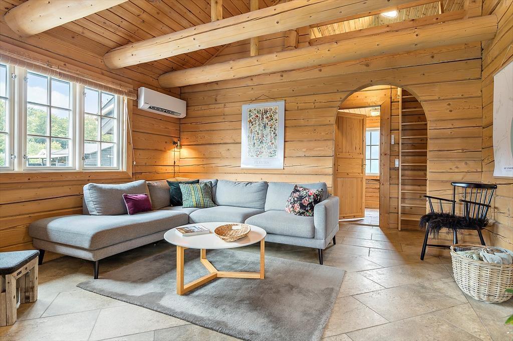 Bjælkehytten opvarmes med gulvvarme, som suppleres med varmepumpe med køl samt brændeovn.