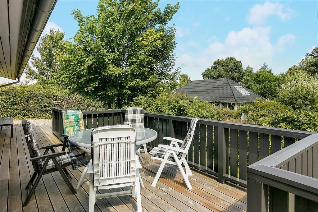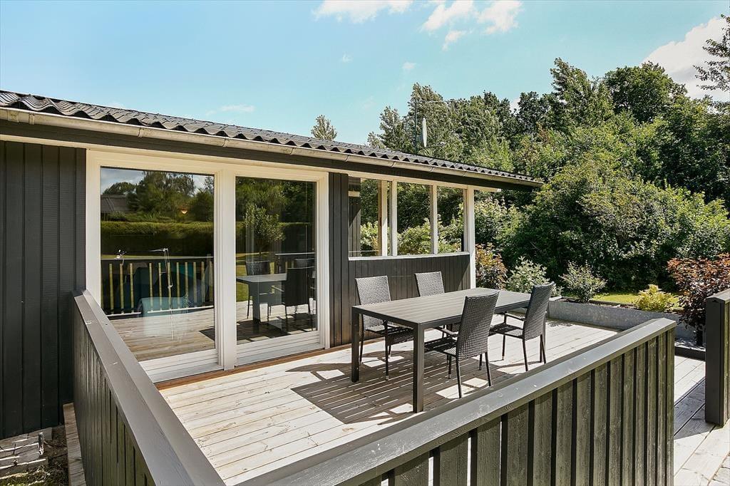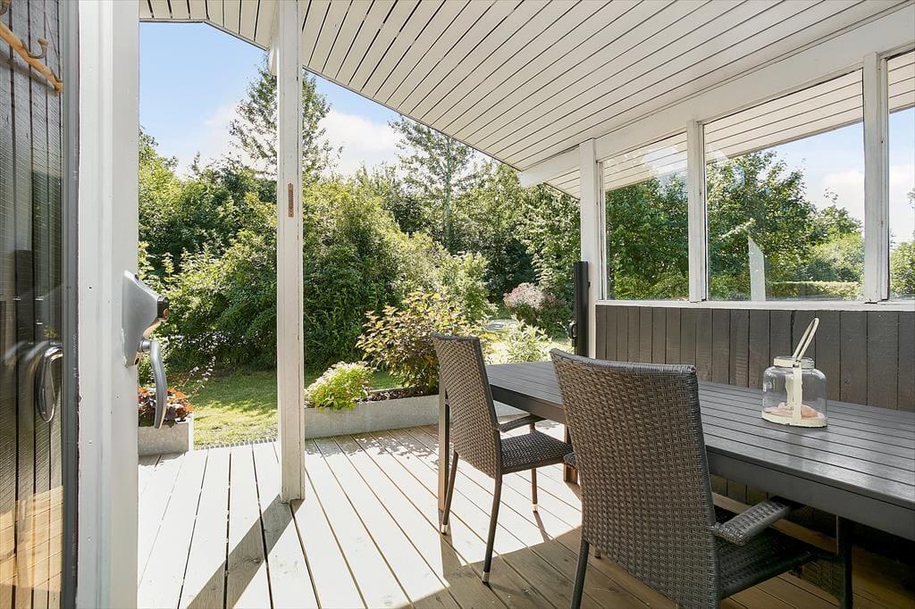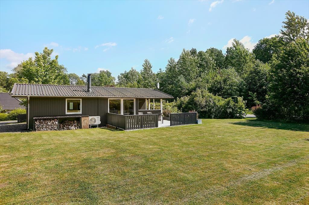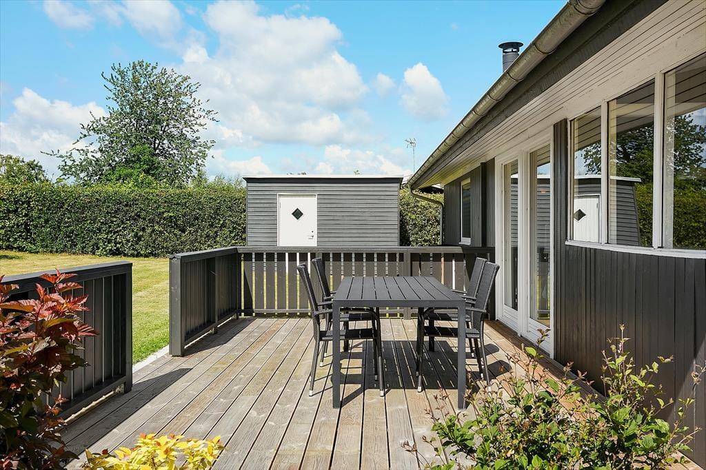 Beliggenheden er også fantastisk, da sommerhuset kun er 250 meter fra stranden. Her kan I tage en forfriskende svømmetur, gå ture langs stranden eller bare nyde den smukke udsigt. En dejlig terrasse omkranser huset og her er det både muligt at sidde ude og nyde solen eller gå i skyggen i den overdækkede del af terrassen.