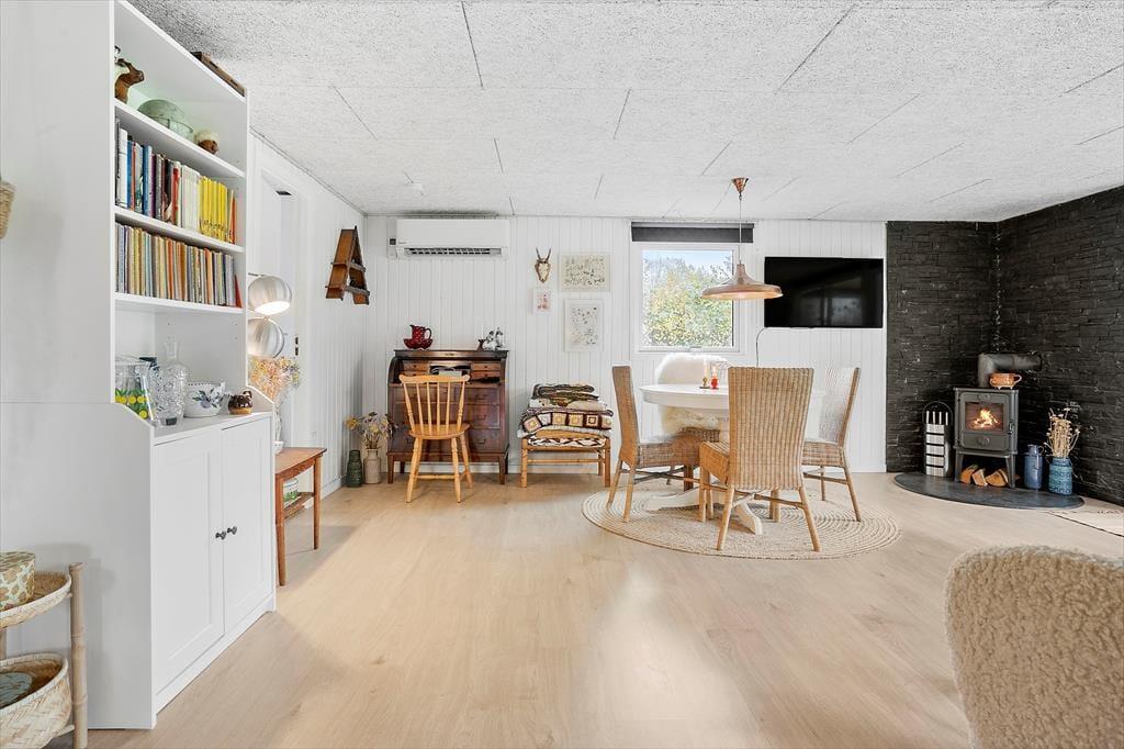I det åbne køkken finder I alt, hvad I behøver til at lave lækker mad, herunder en komfur, køleskab, kaffemaskine, elkedel og mikroovn. Når I ønsker at nyde hyggen ved brændeovnen, er der også mulighed for det.
