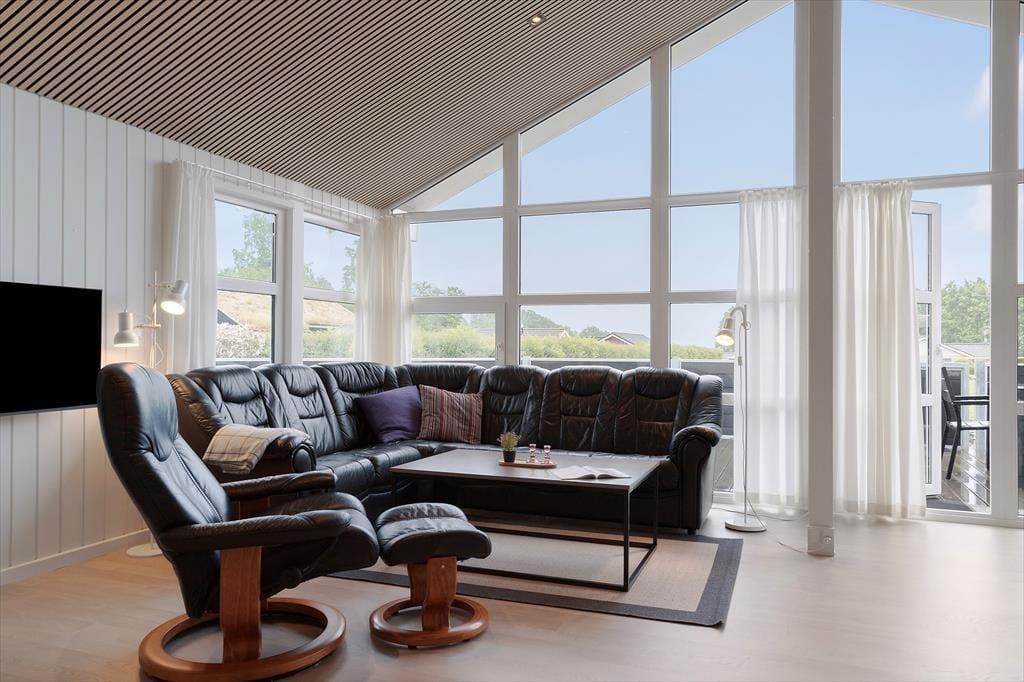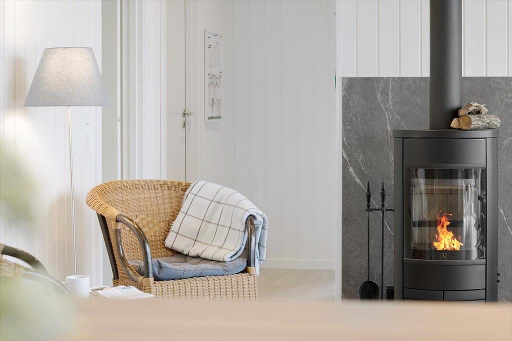 I sofahjørnet mod det store østvendte vinduesparti skaber brændeovnen en varm og hyggelig sommerhusstemning. Det er helt perfekt at sidde her med en bog eller tænde for en god film. Her kan I virkelig slappe af, og nyde at være på ferie. Om aftenen kan i koble fra og benytte jer af sommerhuset mange TV kanaler.