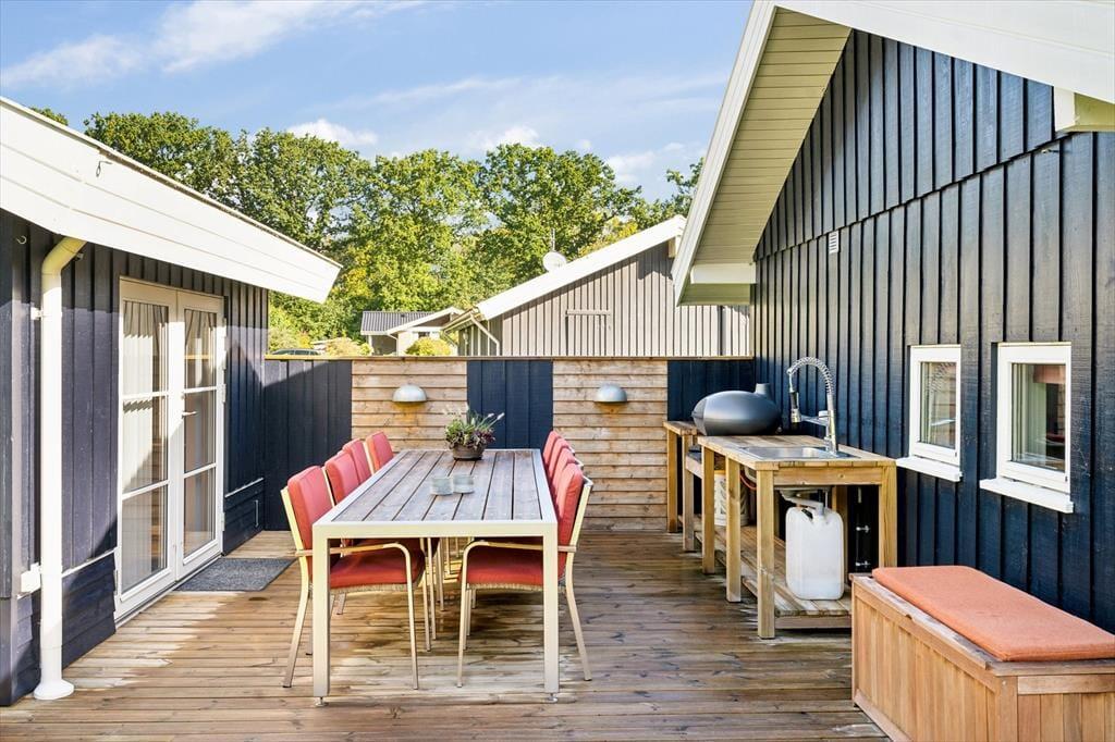Husets samlingspunkt er den kombinerede stue og køkken. Det åbne køkken gør det nemt at forberede måltider, mens I samtidig kan tale om dagens oplevelser med dem, der hygger sig i stuen. Køkkenet er både funktionelt og moderne med alle nødvendige faciliteter lige ved hånden – og en dejlig udsigt til omgivelserne. Spisebordet, der står i forlængelse af køkkenet, indbyder til fælles måltider eller brætspil. Fra spiseområdet kan I træde ud på den sydvendte terrasse gennem havedøren og nyde jeres måltider under åben himmel med udsigt til haven og naturen.