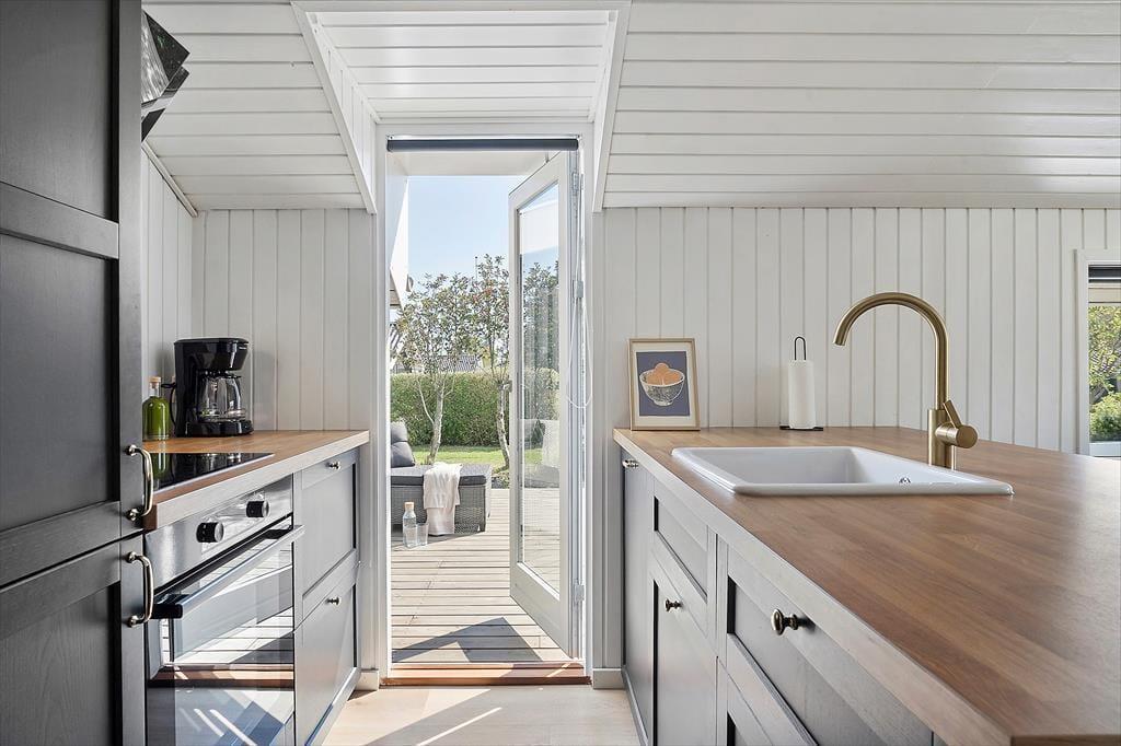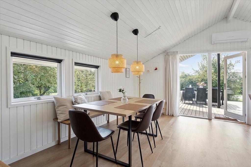 Dette indbydende, klassiske sommerhus byder på ren ferieoplevelse med et charmerende køkken, komfortable værelser, et badeværelse og en indbydende stue. De store vinduer i stuen lader det naturlige lys strømme ind og skaber en lys og luftig atmosfære, der indbyder til ro og afslapning. Her kan du fordybe dig i en god bog med benene oppe og en skøn kop kaffe i hånden. I den hyggelige overdækkede terrasse kan man også nyde sine måltider. Alle rum er designet til at skabe en følelse af hjemlig hygge og ferieafslapning, så du kan sænke skuldrene og lade hverdagens stress forsvinde i det fredfyldte miljø.