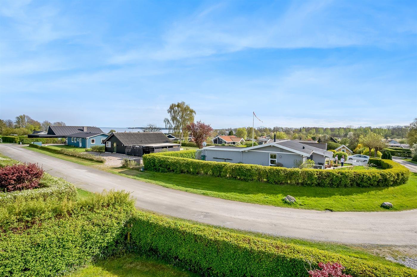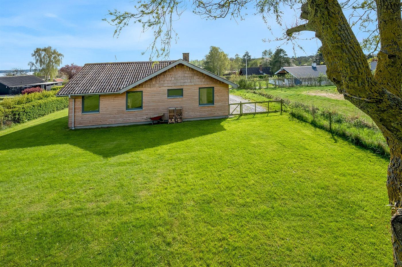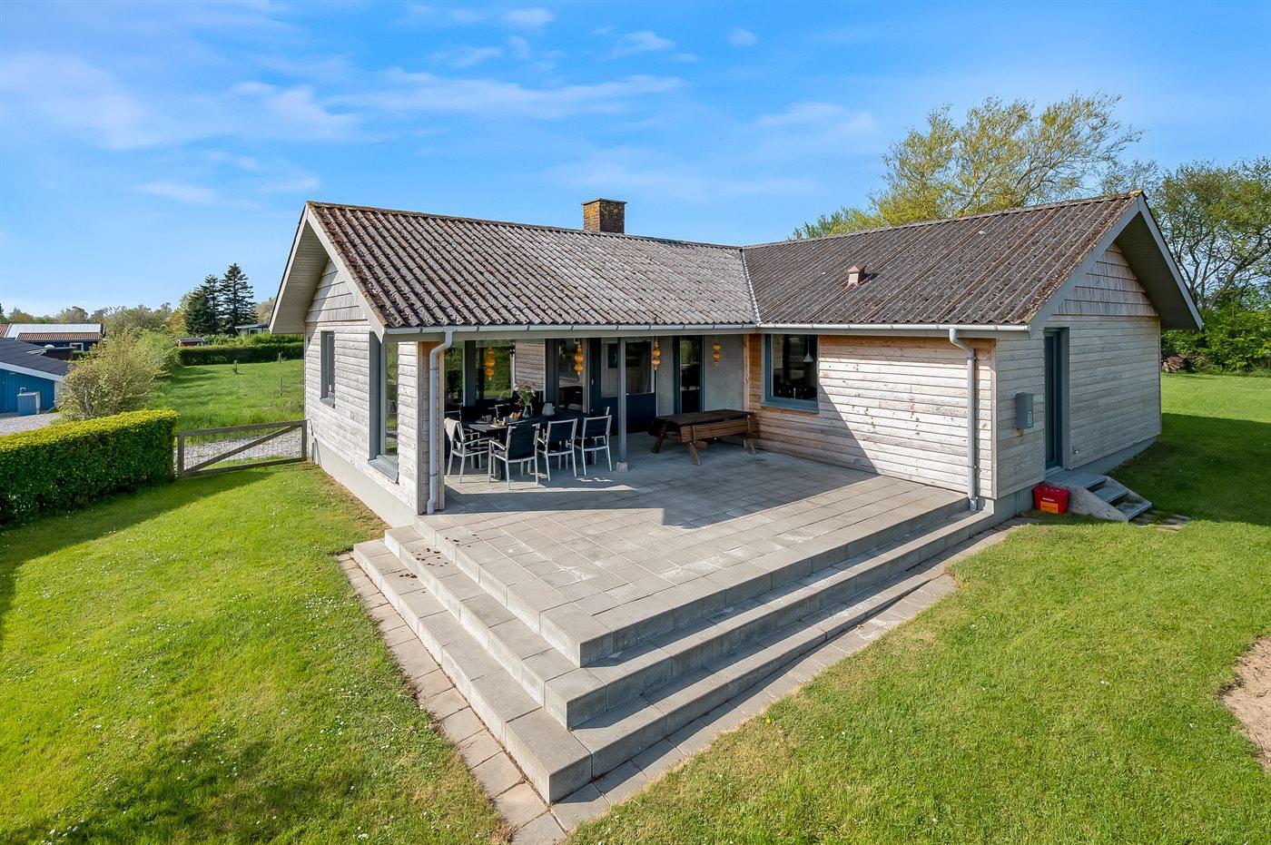 Sommerhuset er beliggende på en dejlig grund og med en overskuelig have. Der findes et dejligt, delvist overdækket terrasseareal - hvor det ofte er muligt at finde et hjørne i læ for vinden, og hvor du kan nyde solen og sidde med et glas vin eller en kop kaffe og slappe af i de fredelige og naturskønne omgivelser.