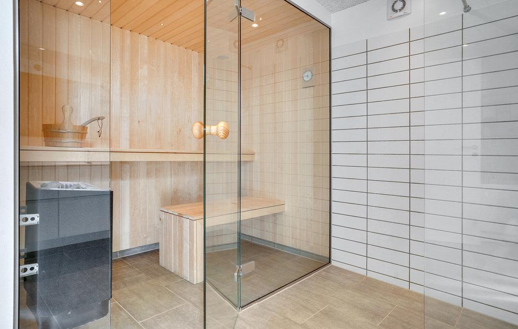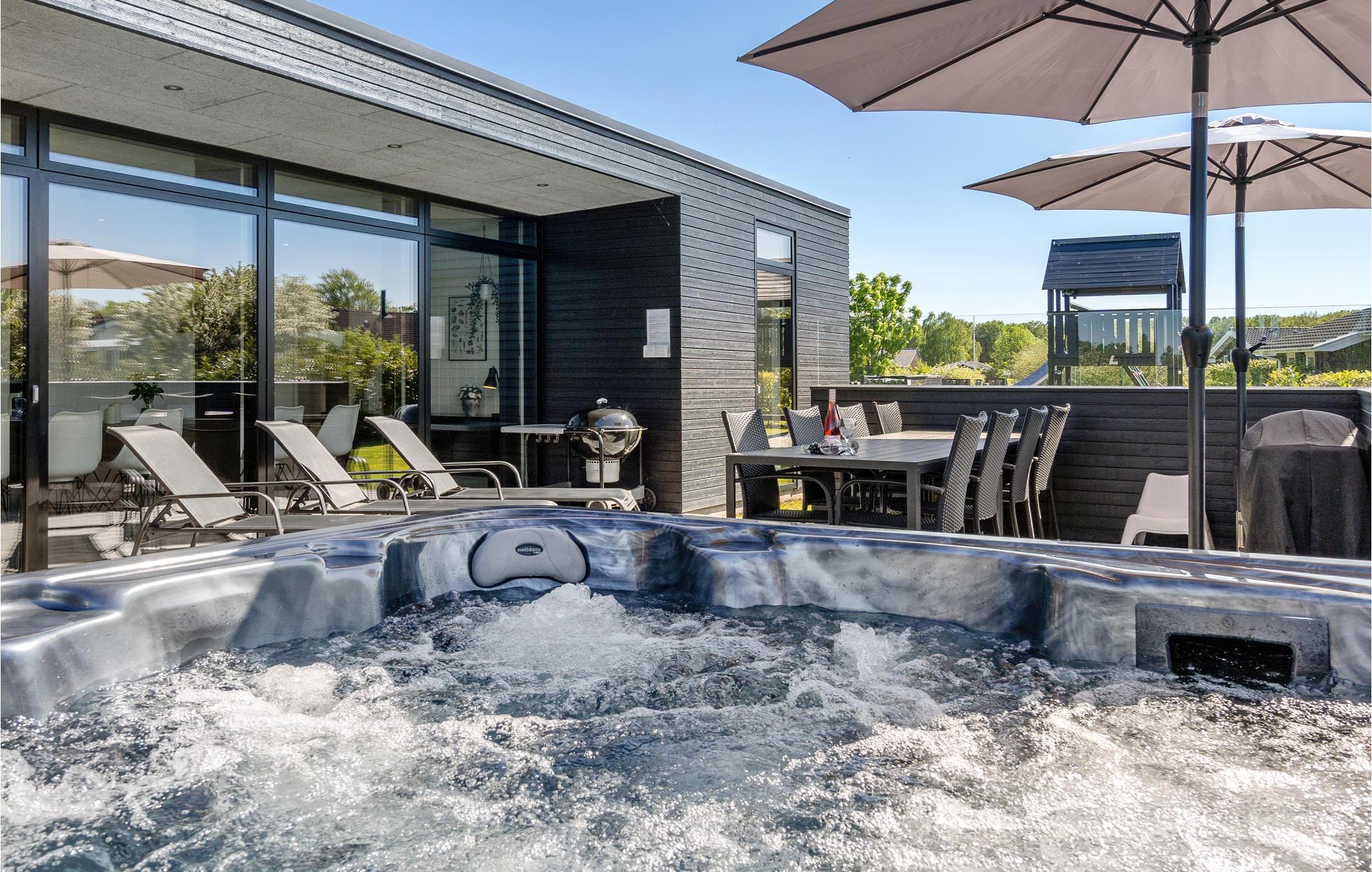 Moderne sommerhus med spabad, sauna og aktivitetsrum tæt på strand og naturskønne områder.