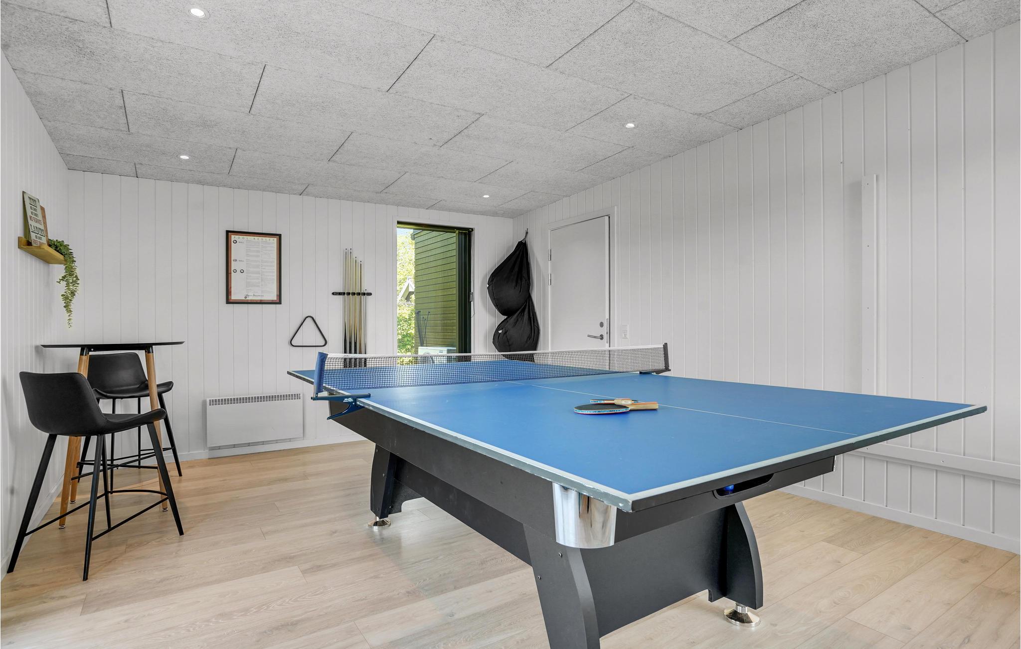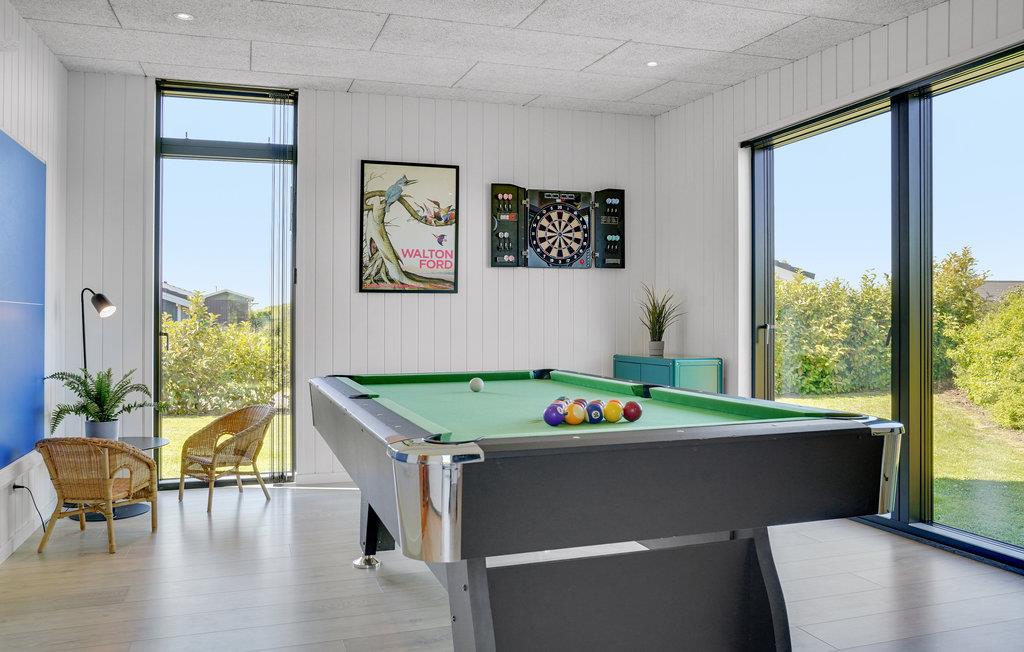 Huset er meget rummeligt med god plads til en stor familie, eller flere familier, der vil holde ferie sammen. De 4 værelser er fordelt med 2 rum i hver ende af huset. Det ene af husets badeværelser indbyder til afslapning efter en aktiv dag i det fri, med både spabad og sauna. Glæd jer til at samles om hyggelige filmaftener i opholdsstuen, hvor en 85” hjemmebiograf venter jer. Det store aktivitetsrum med både poolbord, billard og bordtennis, vil hurtigt blive stedet hvor I alle kan samles til sjov, spil og hygge med aktiviteter for alle aldre. Glæd jer til at nyde morgenkaffen på en af de to dejlige terrasser, som begge er indrettet med kvalitetshavemøbler. En terrasse vender mod øst og en mod vest, så I kan nyde udelivet hele dagen. På husets terrasse mod vest finder I et stort udendørs spabad - forestil jer en vinteraften med familien eller gode venner, hvor stjernehimlen kan nydes fra det varme spabad.