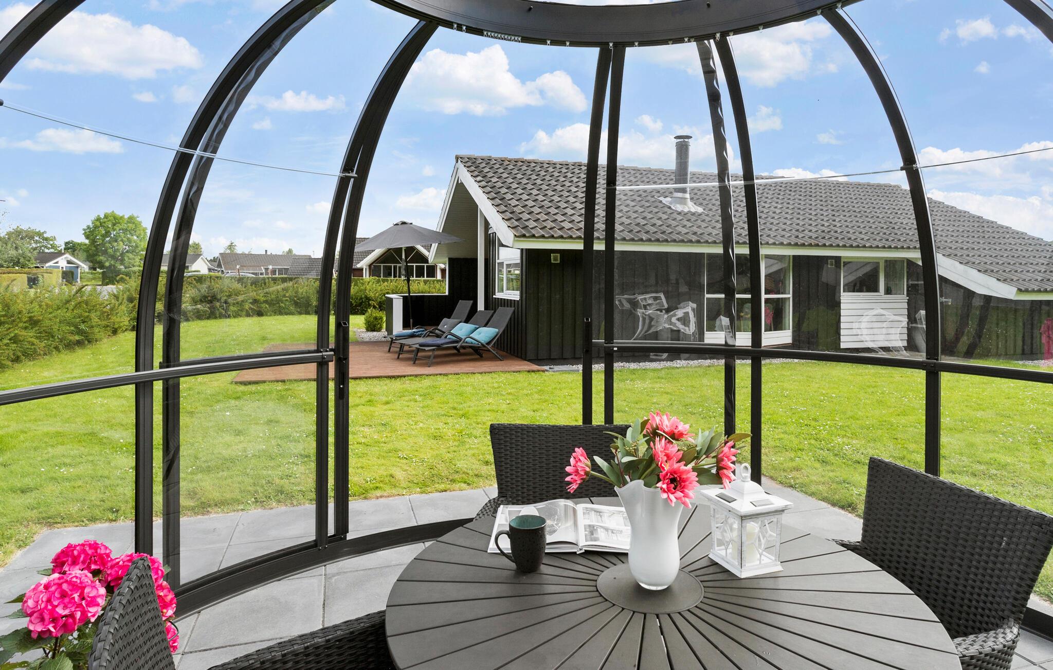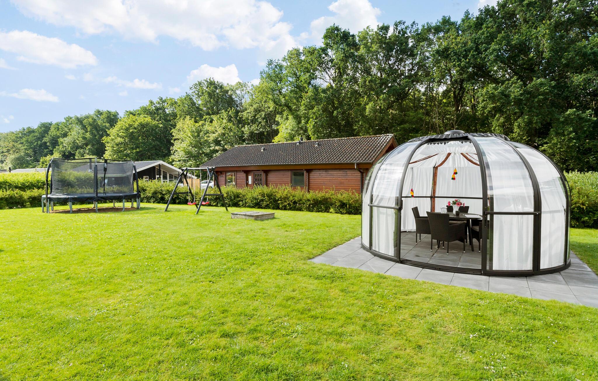 I børnene kan børnene nyde den friske luft, hoppe en tur på trampolinen eller gynge højt, mens I slapper af i liggestolene. Det kuppelformede drivhus skaber en herlig ramme om en solskinsstund på en kølig dag i forårs- eller efterårssæsonen. Her sidder I omgivet af den grønne have og kan nyde en kop kaffe eller et glas vin.