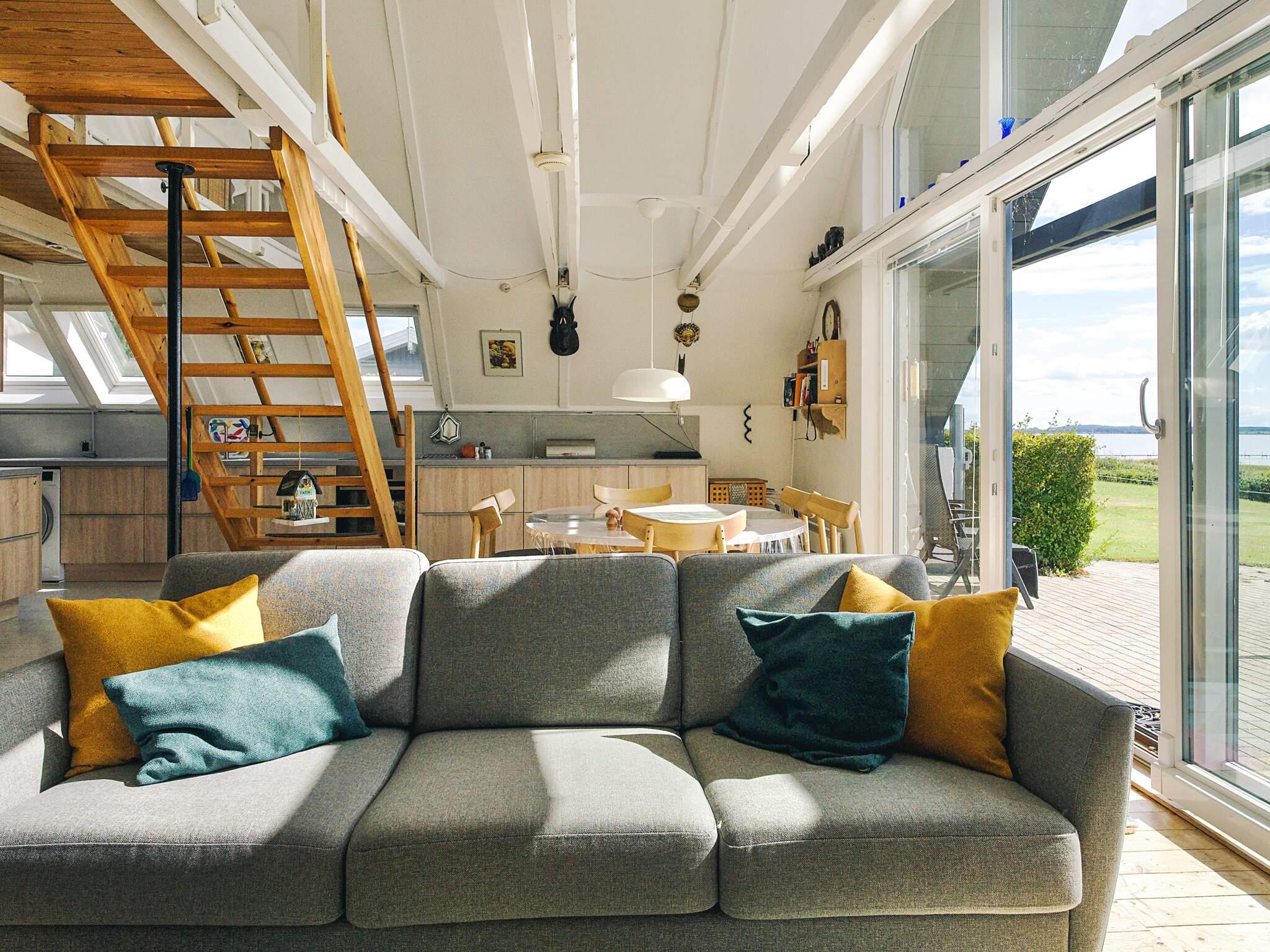 Dette enestående feriehus på 108 m² har en førsteklasses beliggenhed i første række med en betagende panoramaudsigt over fjorden. Husets hjerte er det rummelige og lyse åbne køkken-, spise- og opholdsområde, hvor store vinduer indrammer det fantastiske landskab ved vandet. En trappe fører op til en stor hems med en dobbeltseng og sin egen smukke udsigt over vandet - perfekt til fredelige morgener eller stjerneklare nætter.