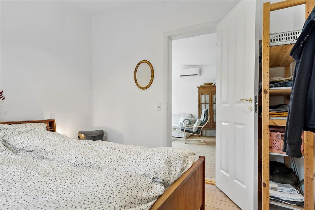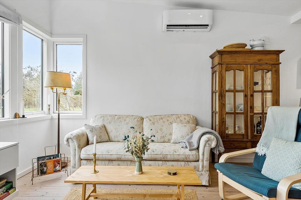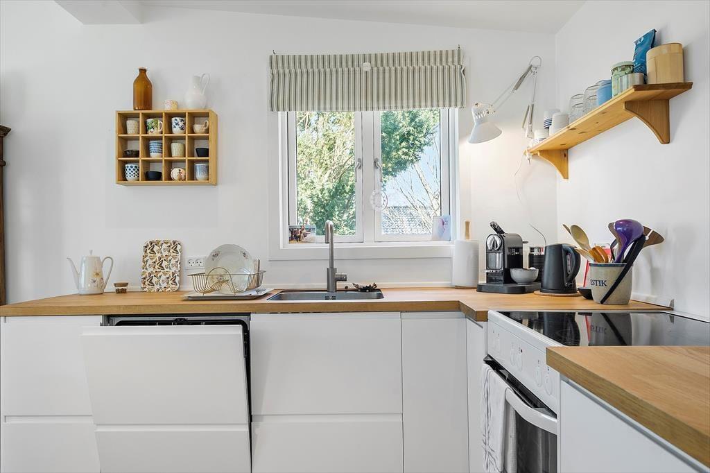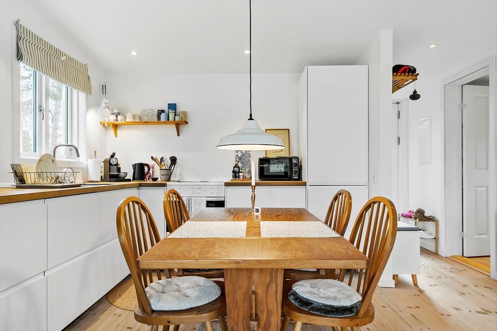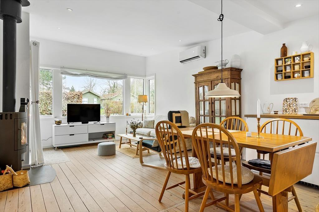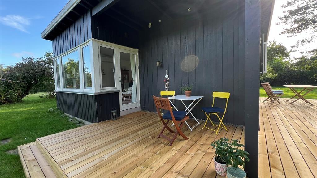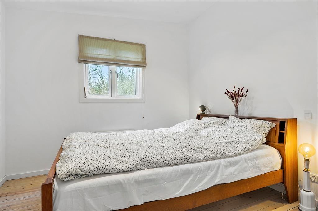 Huset er lyst og indbydende med lyse afhøvlede gulve og man føler sig straks velkommen. Køkkenet, som er nyt, og stue er ud i et og her kan I sammen nyde dagens måltider, imens I planlægger dagens eller næste dags oplevelser. På køligere dage kan I samles i stuen, omkring brændeovnen, læse en god bog eller se en film og nyde en kop kaffe eller et glas vin. Her er desuden et dejligt soveværelse med dobbeltseng, og endnu et værelse med en udtræksseng til 2 personer. Her kan man nemt trække sig tilbage og tage en lur. Badeværelset er af nyere dato og har toilet, håndvask og bruseniche.