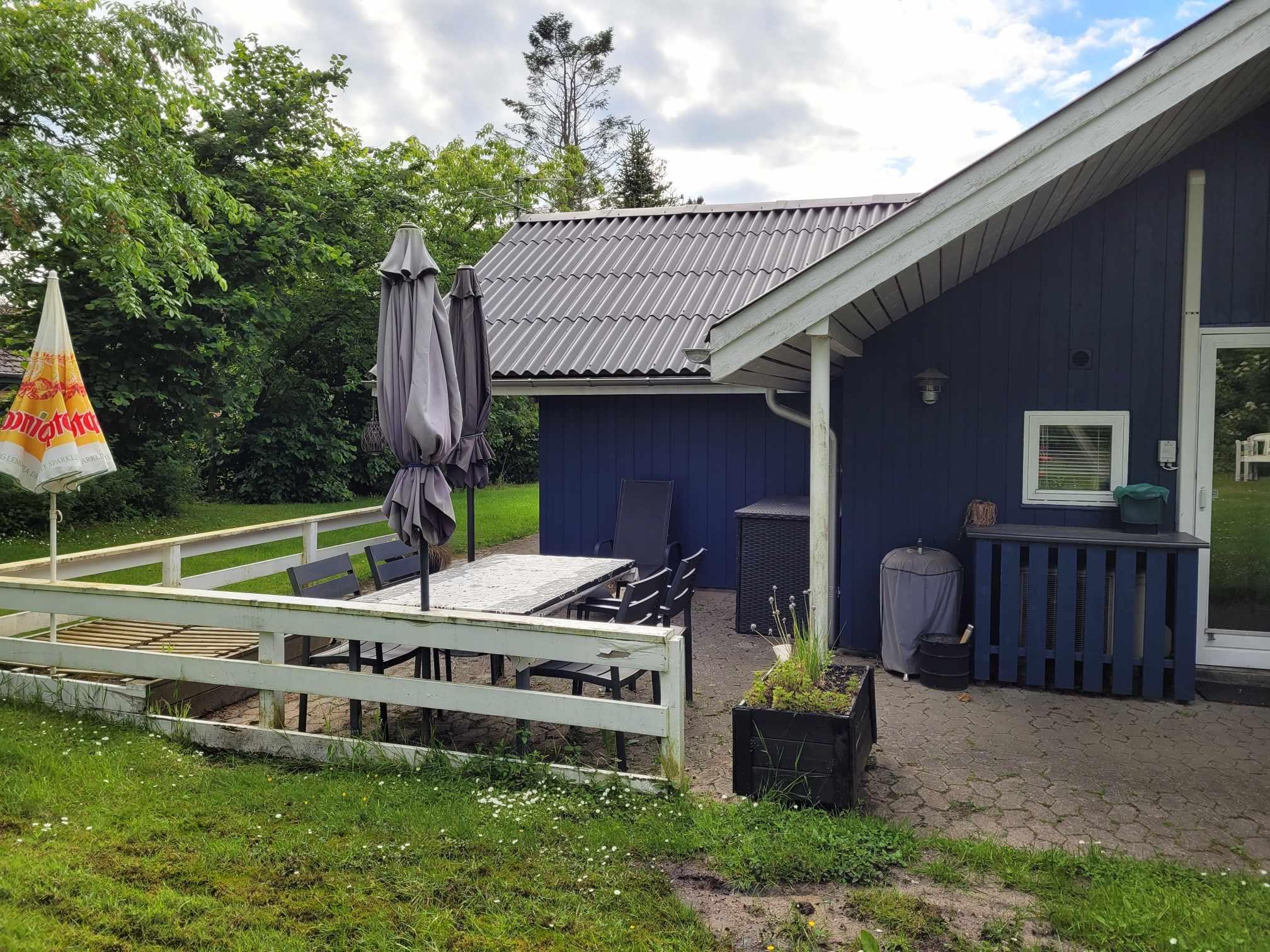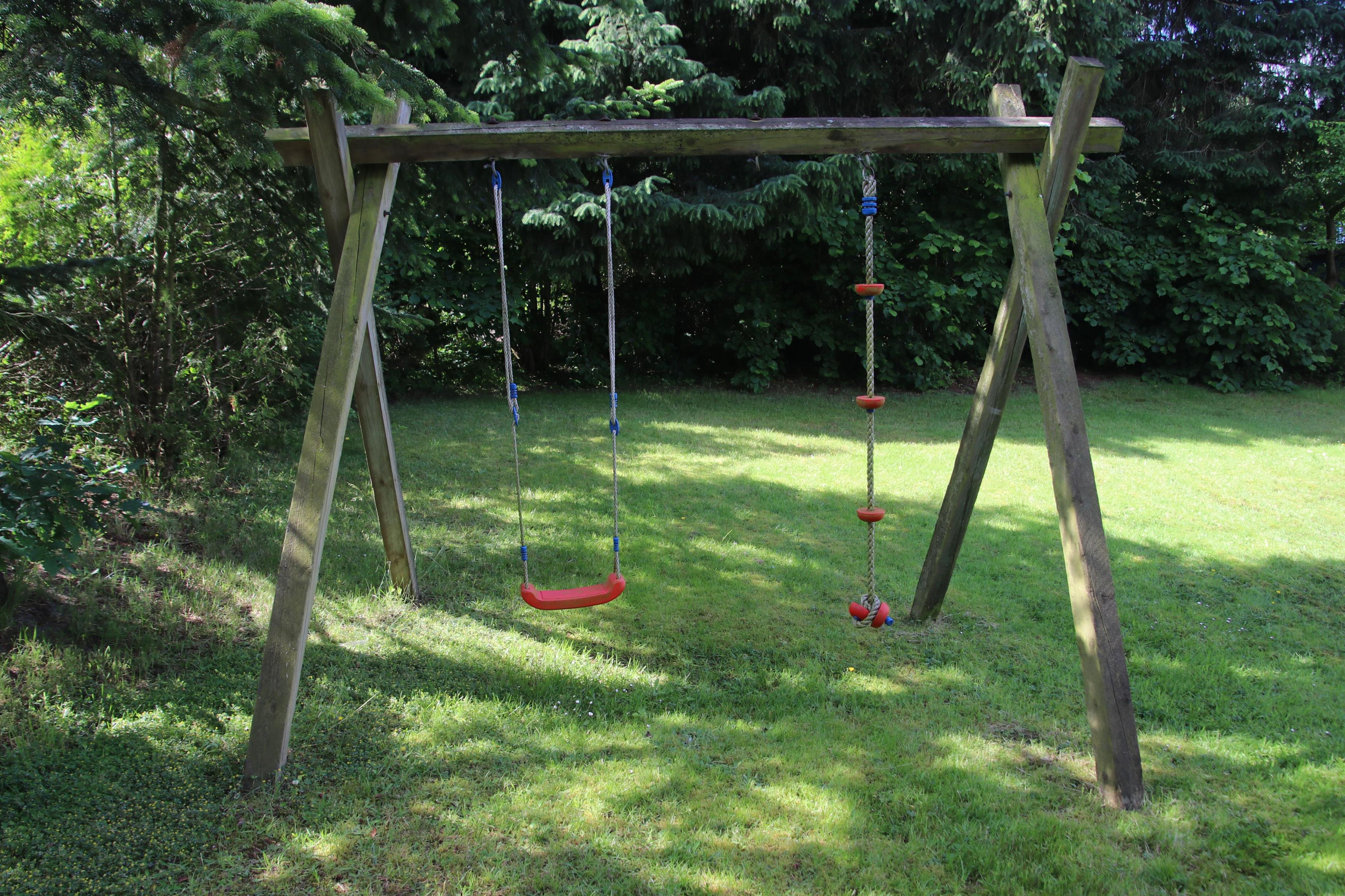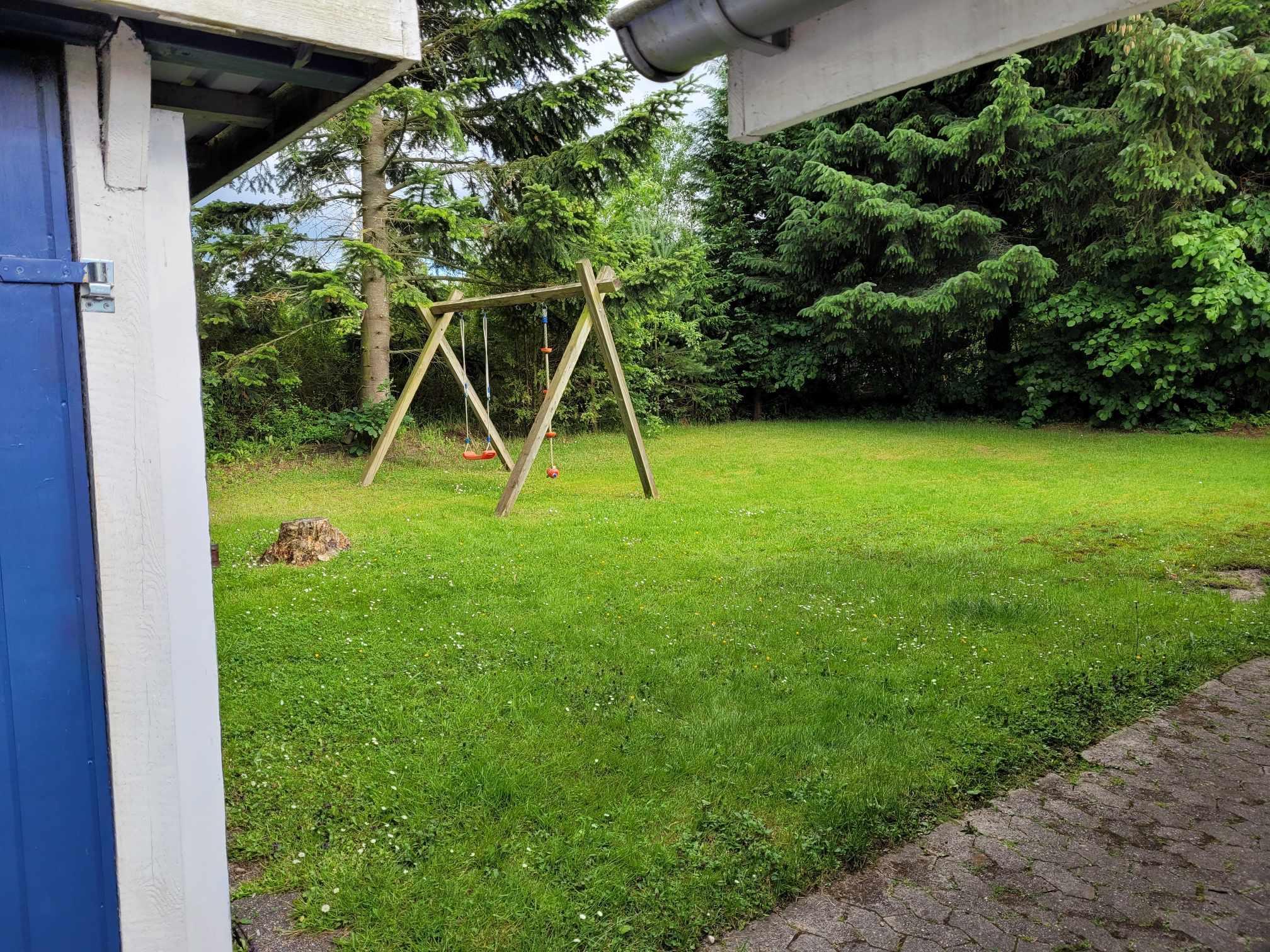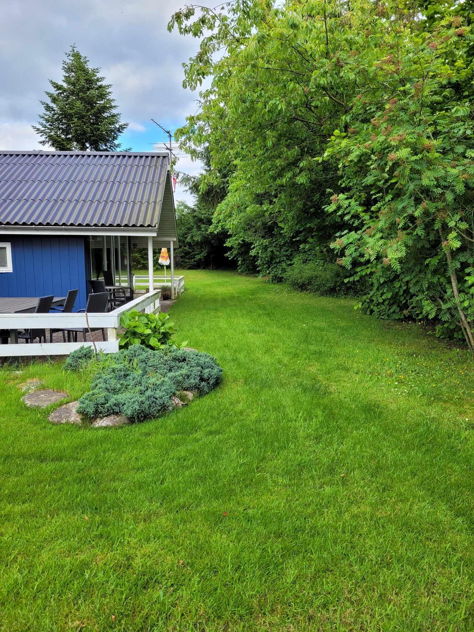 Hyggeligt sommerhus med terrasse og stor græsplæne med gyngestativ.