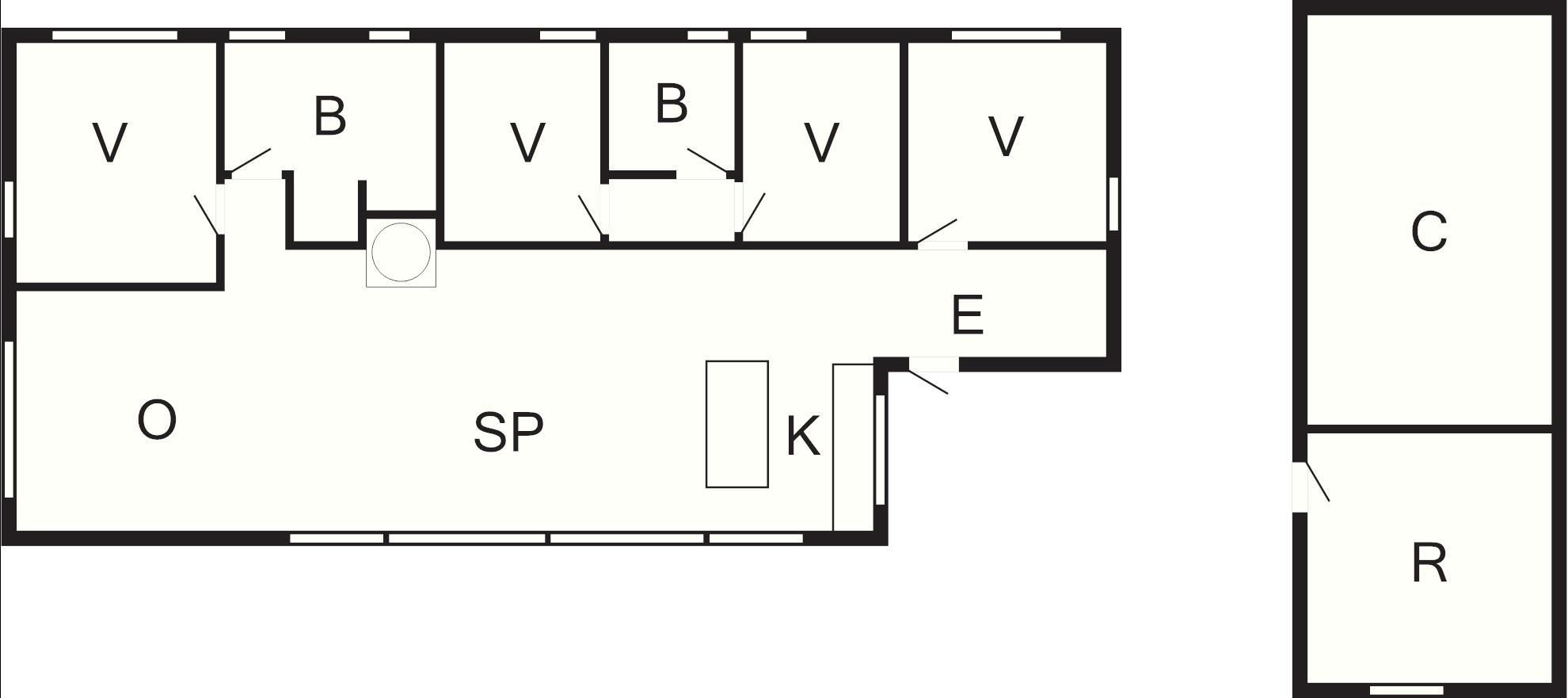 Sommerhuset har fire soveværelser med komfortable senge, fordelt på to værelser med dobbeltsenge, to værelser med to køjesenge og en udtræksseng samt to enkeltsenge på hemsen. Der er desuden to gode badeværelser.