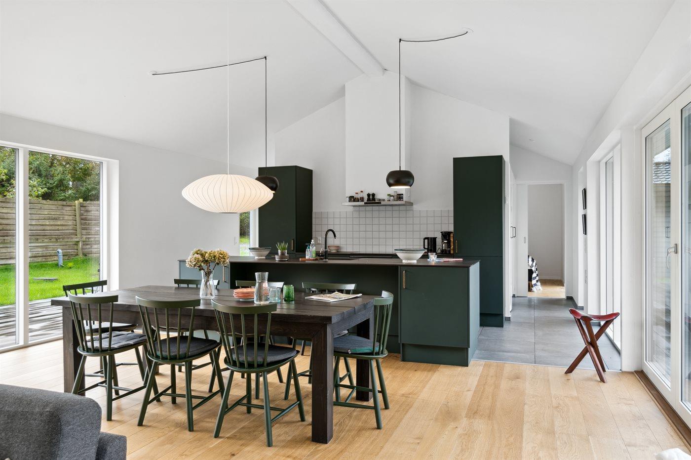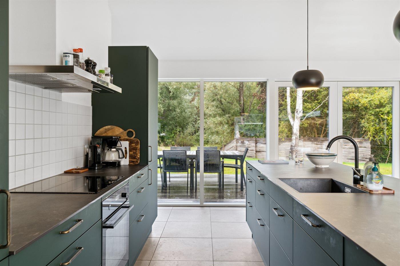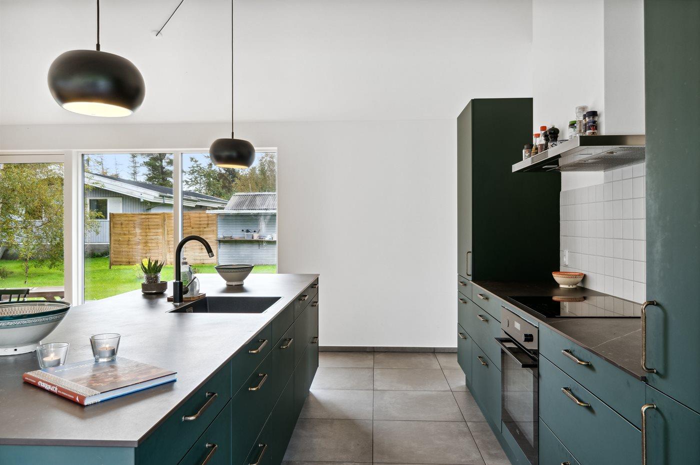Køkkenet er udstyret med 1 køleskab. Der er 4 induktionskogeplader, varmluftovn samt opvaskemaskine.