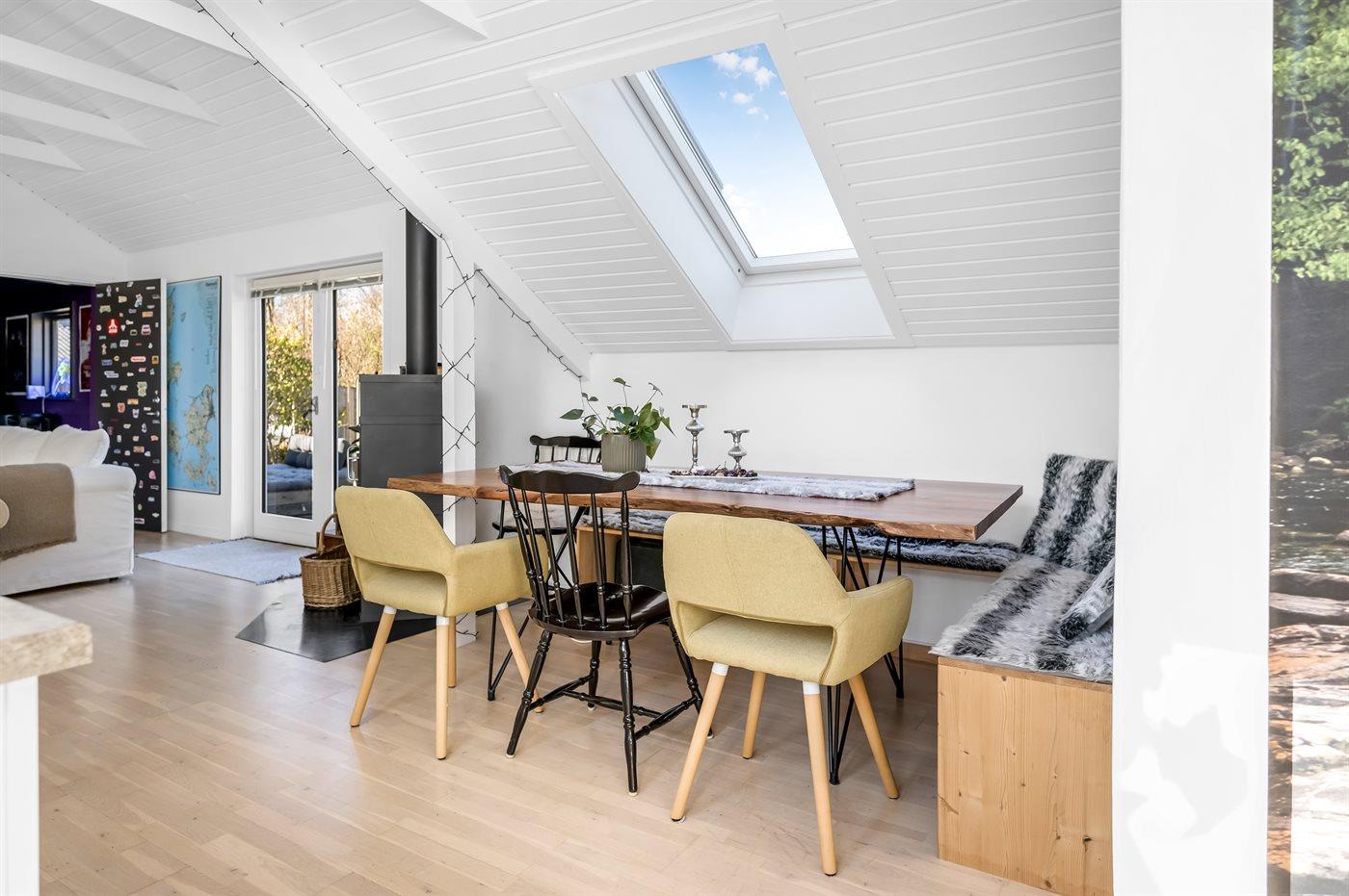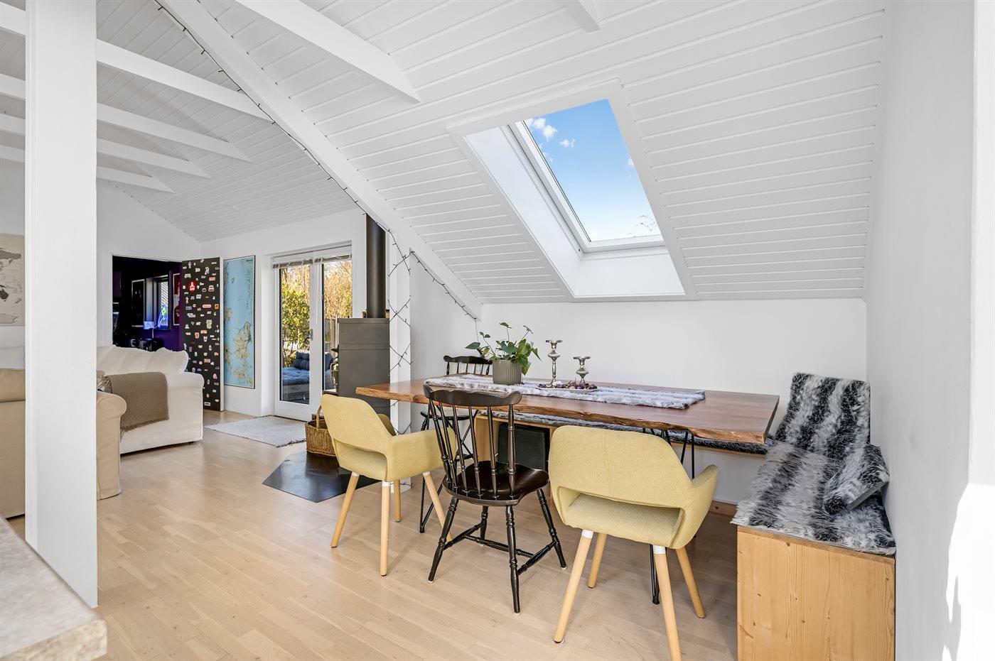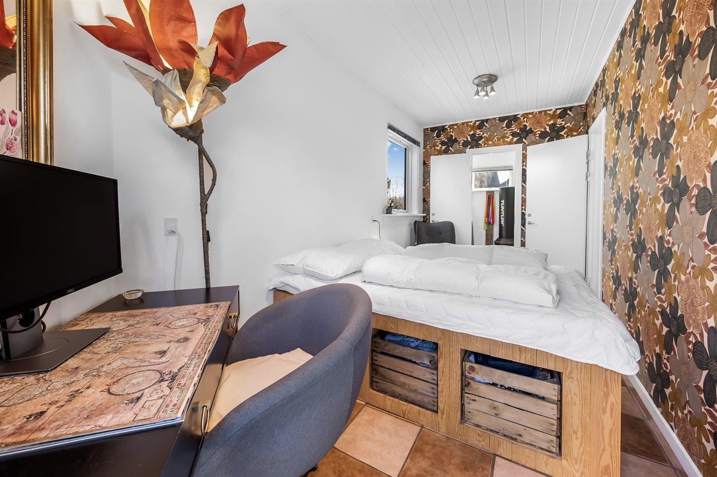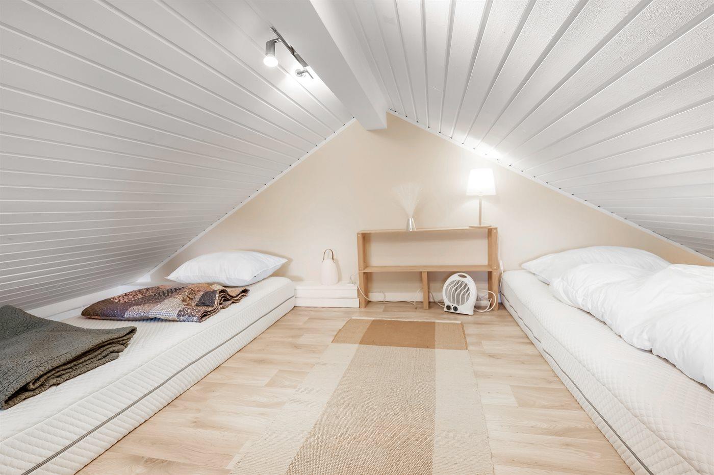 Der er i alt 2 soveværelser. Sovepladserne fordeler sig på: 2 sovepladser i dobbeltseng. 2 sovepladser i enkeltsenge.1 soveplads i køjeseng. 1 soveplads i sovesofa (enkelt). 2 af disse sovepladser befinder sig på husets hems.
