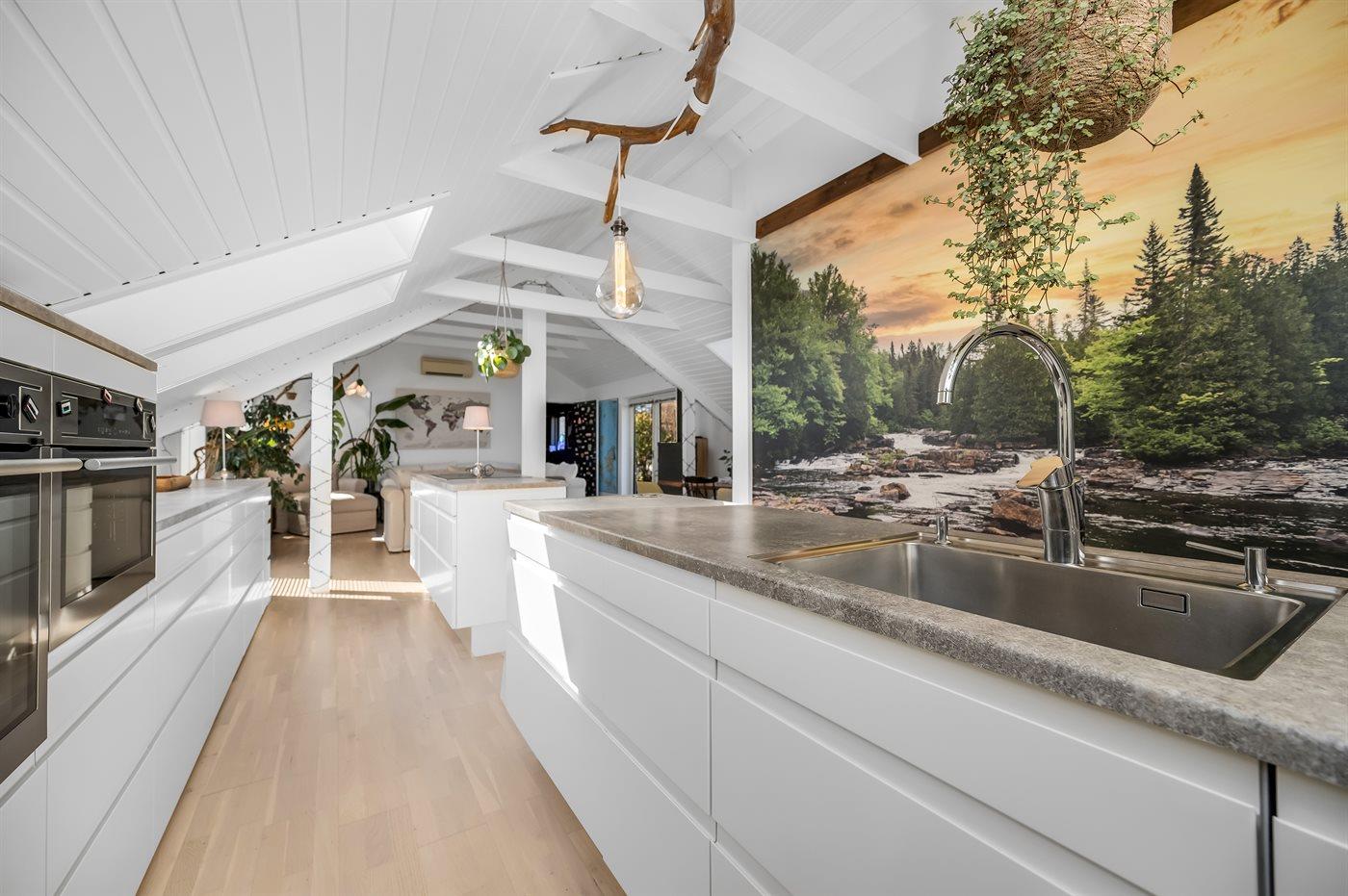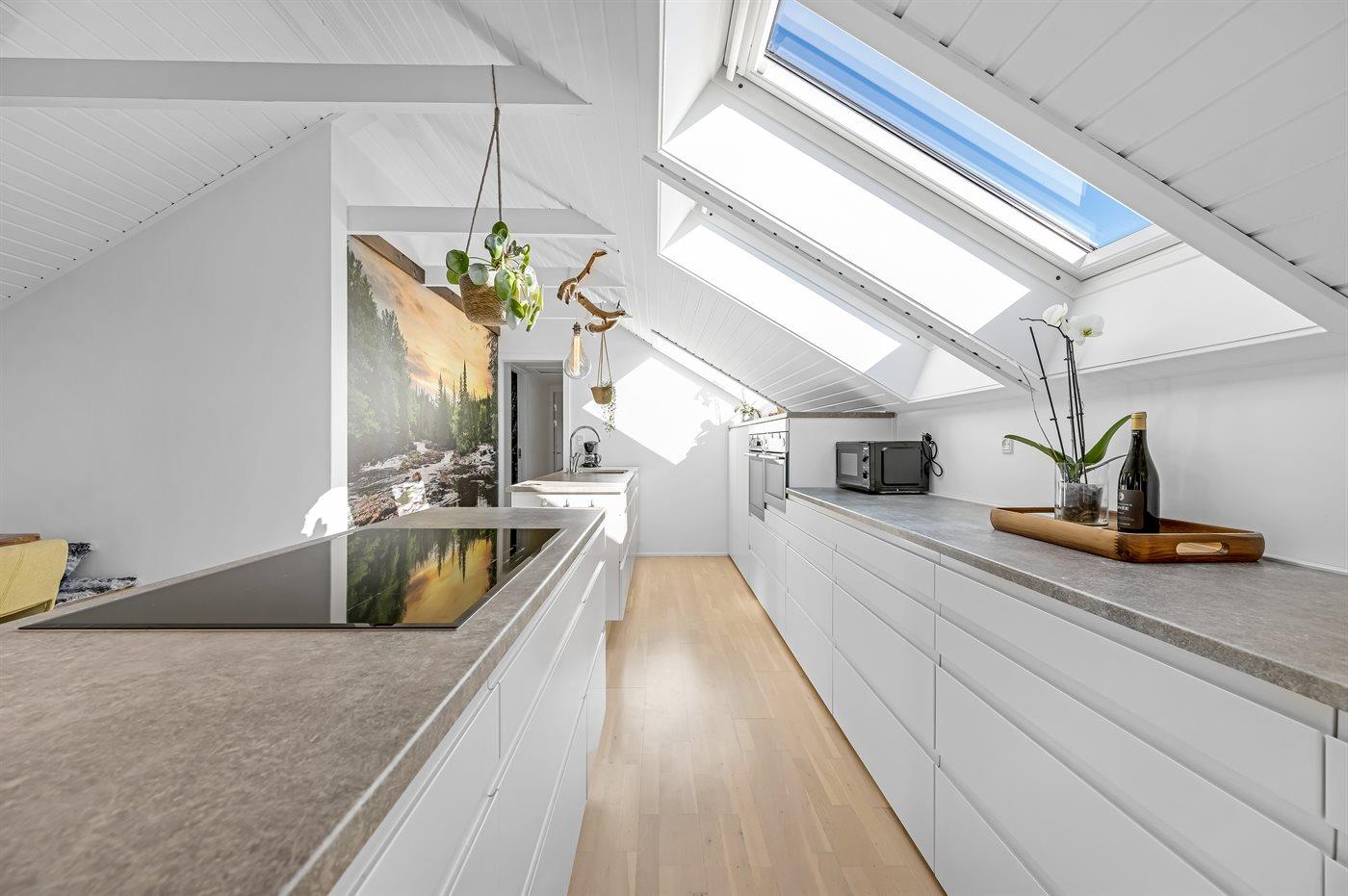 Køkkenet er udstyret med 1 køleskab. Der er 4 induktionskogeplader, 2 varmluftovne, mikrobølgeovn samt opvaskemaskine.