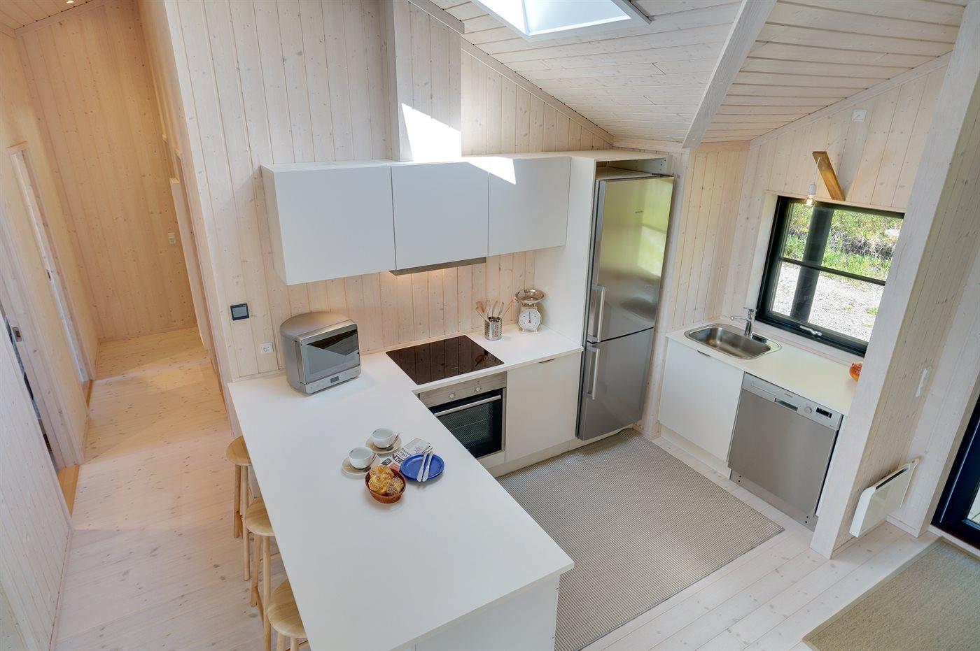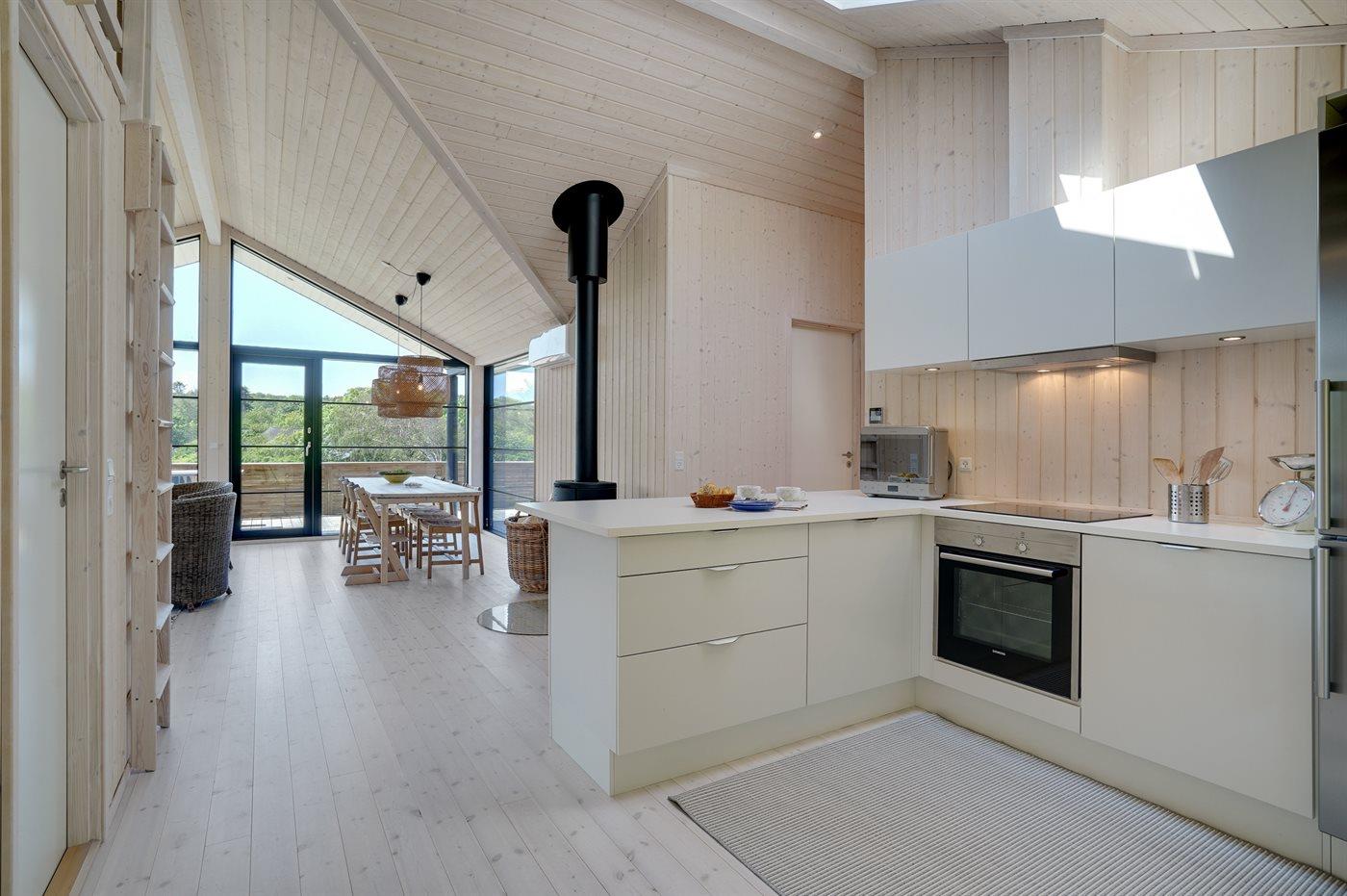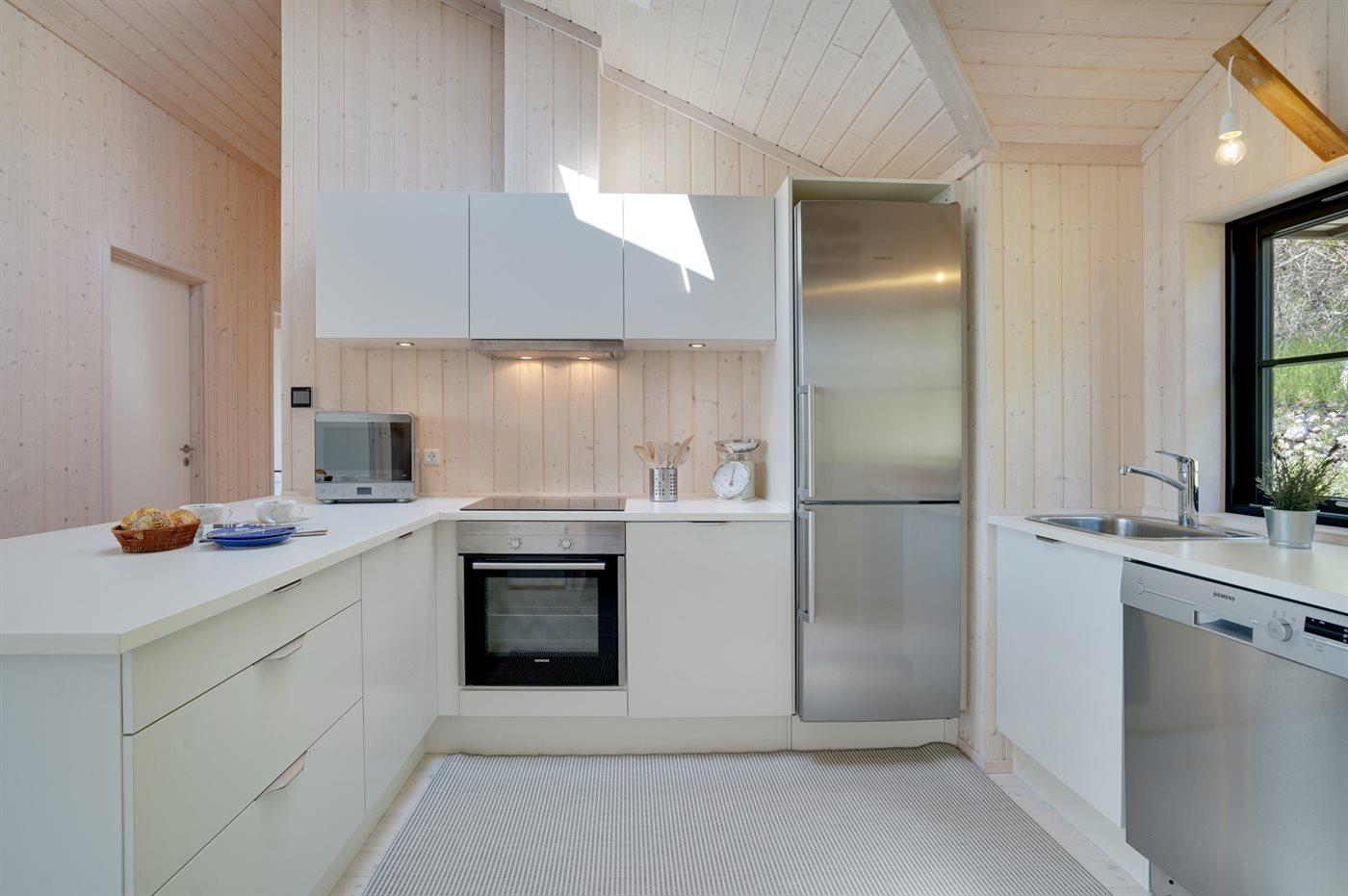 Køkkenet er udstyret med 1 køleskab. Der er 4 induktionskogeplader, varmluftovn, mikrobølgeovn samt opvaskemaskine.