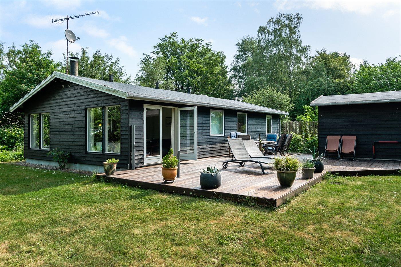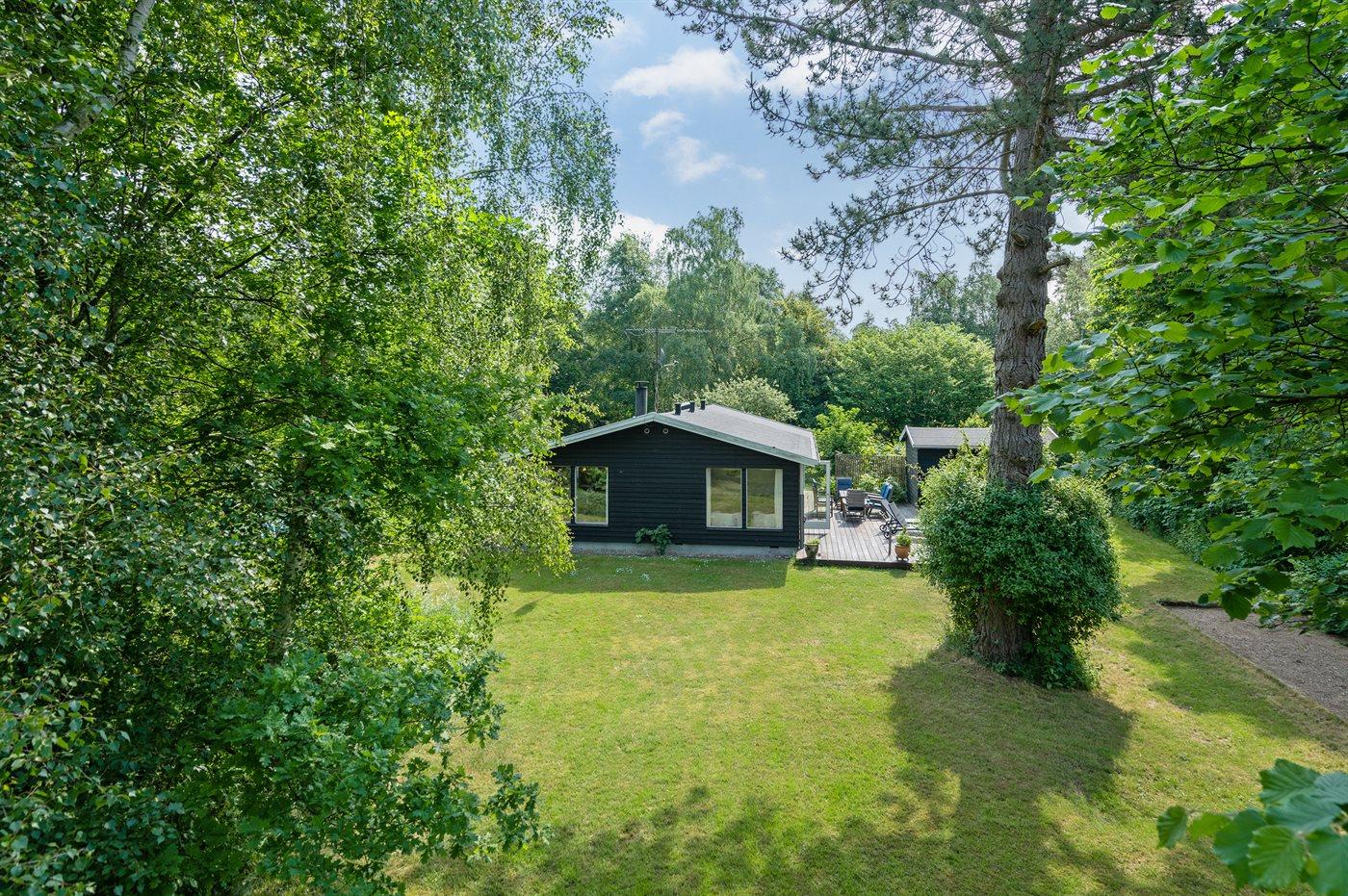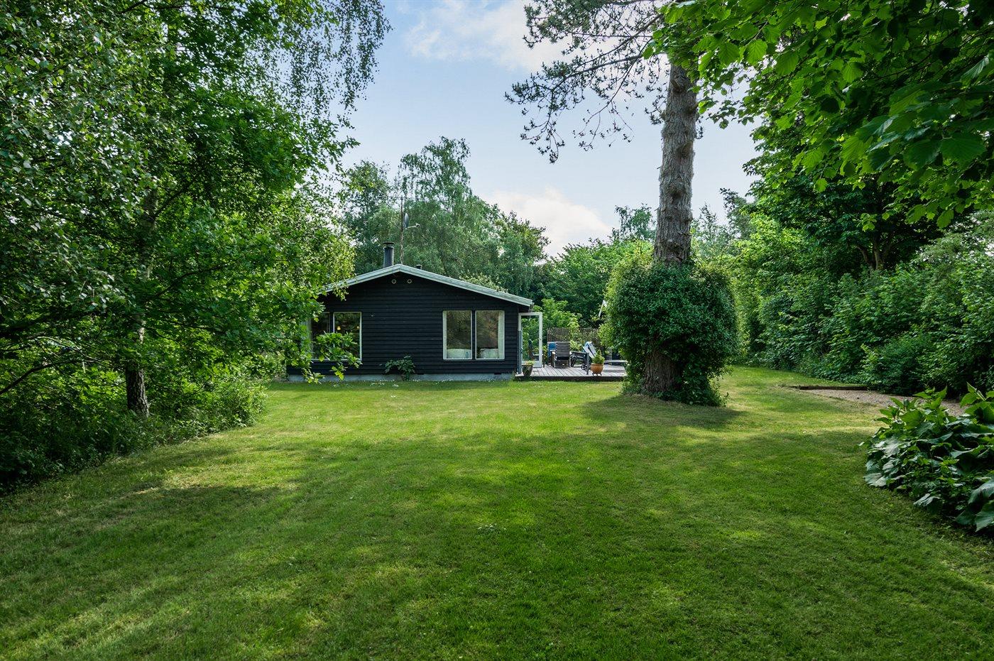 Hyggeligt sommerhus beliggende på en stor, idyllisk og beplantet grund med åløb i baghaven samt petanquebane ved huset.