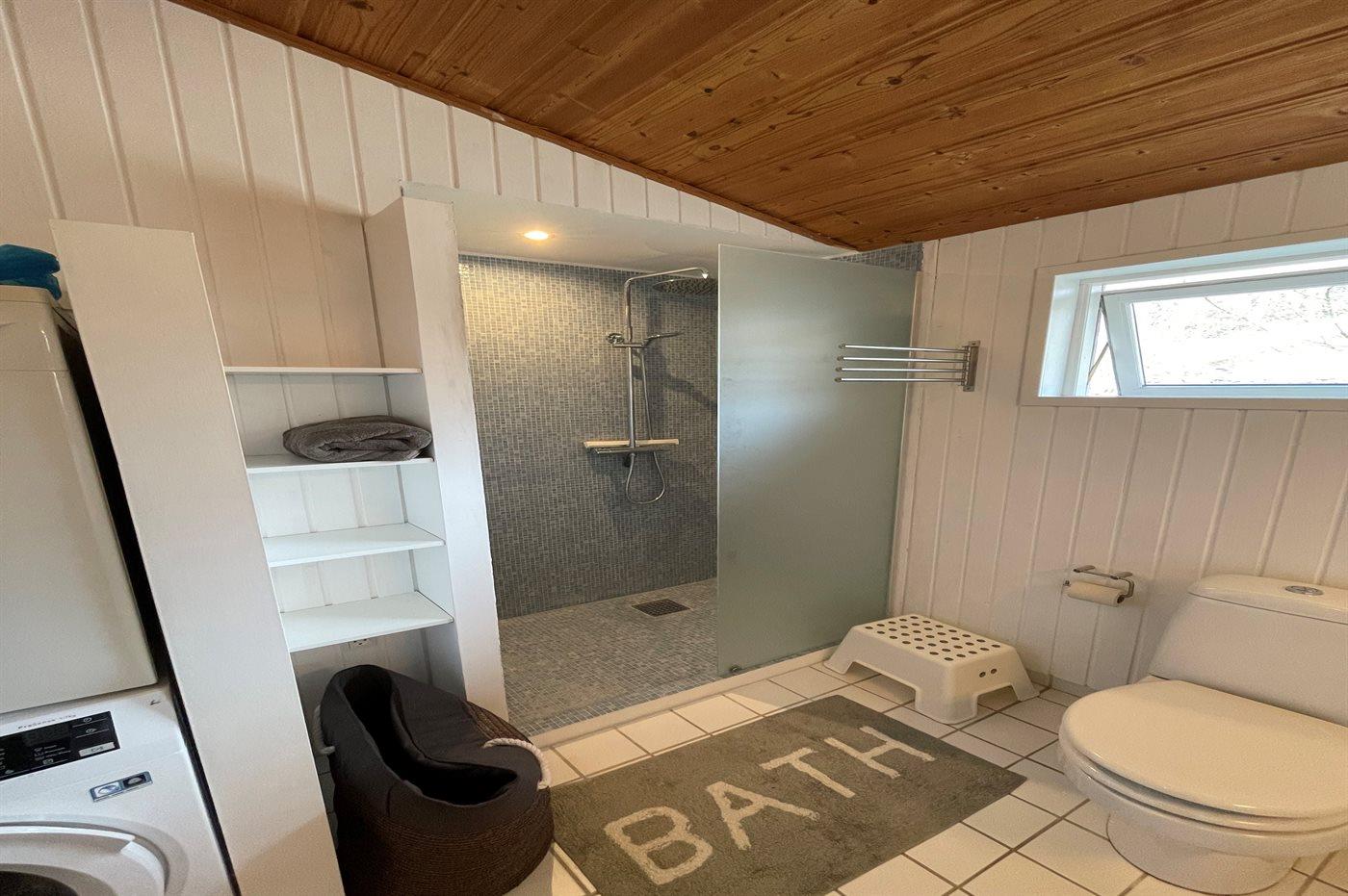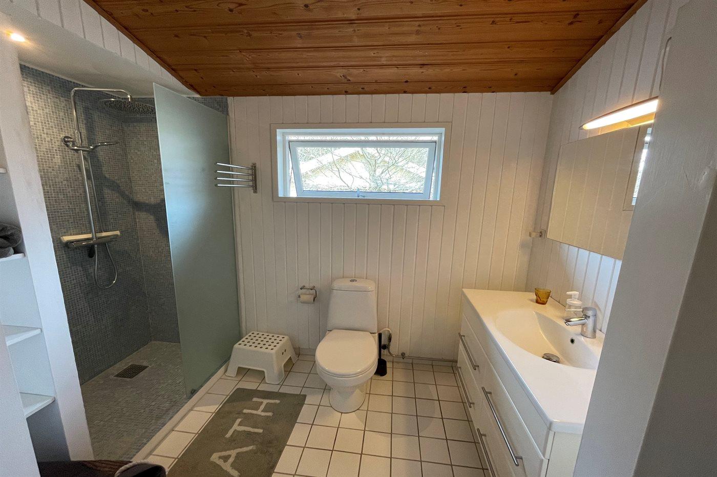 Der er 1 badeværelse med bruseniche og 2 toiletter, heraf 1 gæstetoilet. Der er gulvvarme på 1 badeværelse.