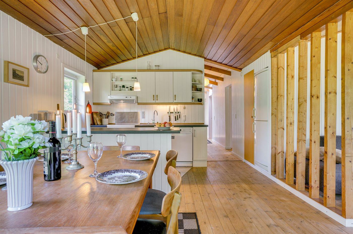 Køkkenet er udstyret med 1 køleskab. Der er 4 keramiske kogeplader, bageovn, mikrobølgeovn samt opvaskemaskine.