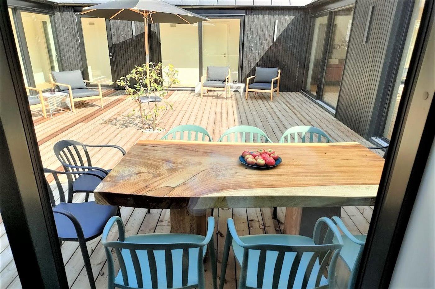 Dette nyopførte og unikke sommerhus i Rågeleje rummer al den luksus, man kan ønske sig til en uforglemmelig ferie. Sommerhuset er arkitekttegnet og indtil videre er der kun opført dette ene sommerhus. Huset er tegnet af den prisvindende arkitekt MAA Søren Rasmussen. Huset er beliggende på en lille vej i rolige og ugenerte omgivelse kun 275 meter fra Rågeleje Strand med de karakteristiske stribede badehuse og den flotte sandstrand. Huset er opført med 4 længer, som omkranser den fantastiske solgård i midten, hvor det altid er muligt at finde læ. Huset er opført i gode materialer og byder på masser af luksus i form af energivenlig luft til vand gulvvarme overalt, sauna og masser af lys og luft i kraft af de store vinduespartier og den store højde til loftet. Overalt er huset indrettet moderne og stilfuldt. Der er separat aktivitetsrum og udendørs bordtennis. Her er rig mulighed for at nyde udelivet på de skønne terrasser med udebruser. Udebruseren er tilgængelig fra uge 13 til 43. Grunden er indhegnet, så også små børn kan færdes sikkert. Der er installeret stik til opladning af elbil (type 2 ) med 11 kW ladeeffekt. Husets kerne er køkkenalrum og stue ud i ét. Her kan alle samles til hygge og samvær. Der er 4 gode soveværelser med hver 2 sovepladser, og derudover er der 2 sovepladser i aktivitetsrummet og 2 på hemsen. Huset rummer 3 badeværelser med gulvvarme og bruseniche. Der er carport til rådighed. Huset er beliggende i hyggelige Rågeleje, som er en af de historiske badebyer på Nordkysten. Her er en fantastisk badestrand og gode betingelser for kite- og windsurfere, som ivrigt er på bølgerne, når vejret viser sig fra sin blæsende side. I området findes også det naturskønne Heatherhill, og i gåafstand er både spisesteder og indkøbsmulighed. Det er også oplagt at besøge de andre skønne badebyer på Nordkysten som blandt andet Tisvildeleje, Gilleleje og Hornbæk eller at tage et smut til København og besøge nogle af hovedstadens mange seværdigheder og attraktioner.