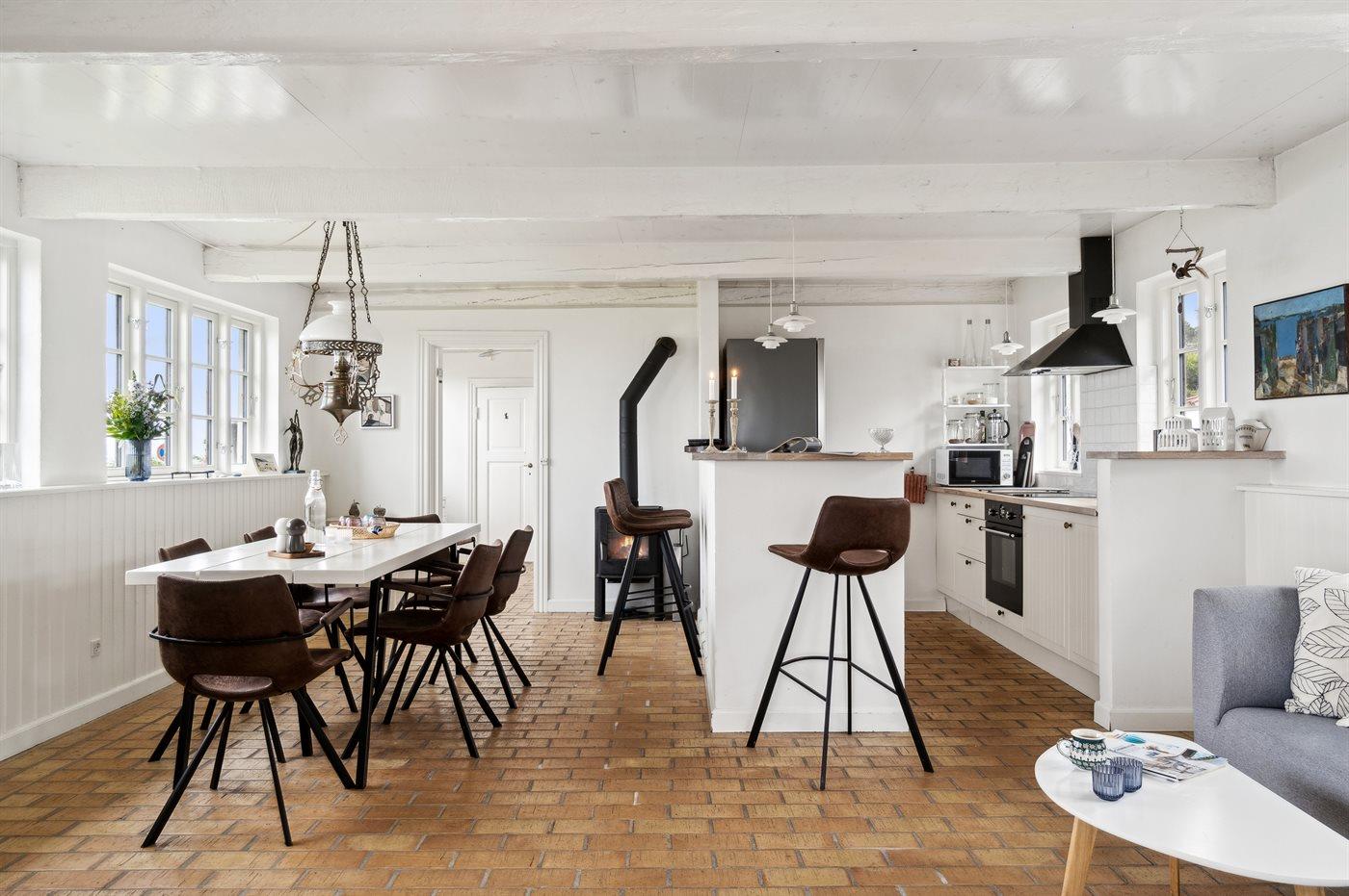 Køkkenet er udstyret med 1 køleskab. Der er 4 keramiske kogeplader, varmluftovn, mikrobølgeovn samt opvaskemaskine.