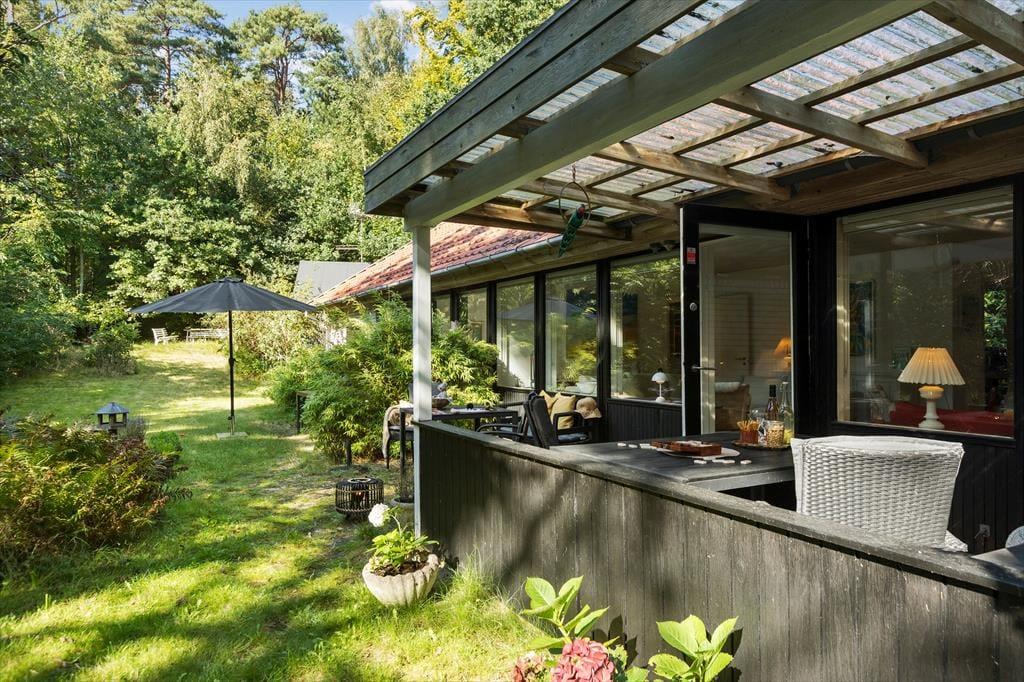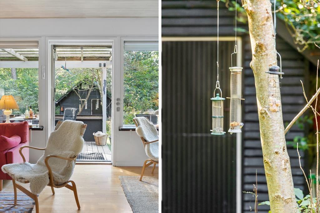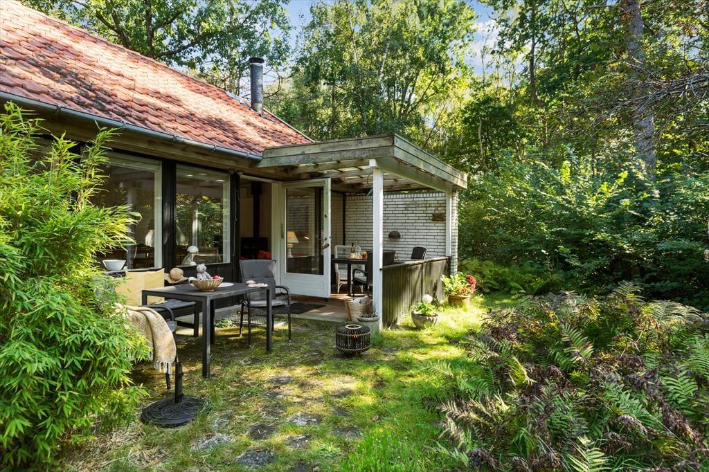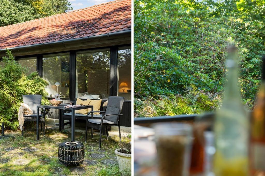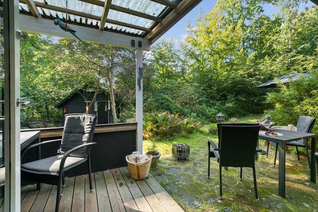 Udenfor venter en fredfyldt oase. Sommerhuset ligger på en privat grund, der er et sandt paradis for naturens dyreliv. Haven besøges flittigt af både rådyr, dompapper, spætmejser og spætten, hvilket skaber en følelse af nærhed til naturen, hvor man kan slappe af og opleve det lokale dyreliv. Den store terrasse er ideel til udendørs spisning og afslapning, hvor man kan nyde roen og naturens lyde.