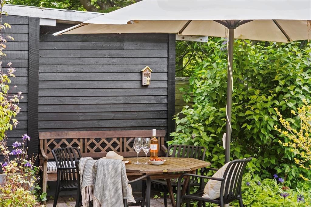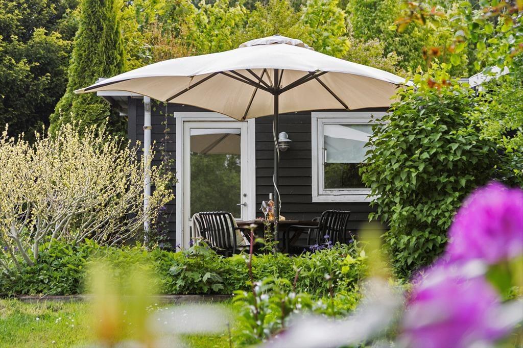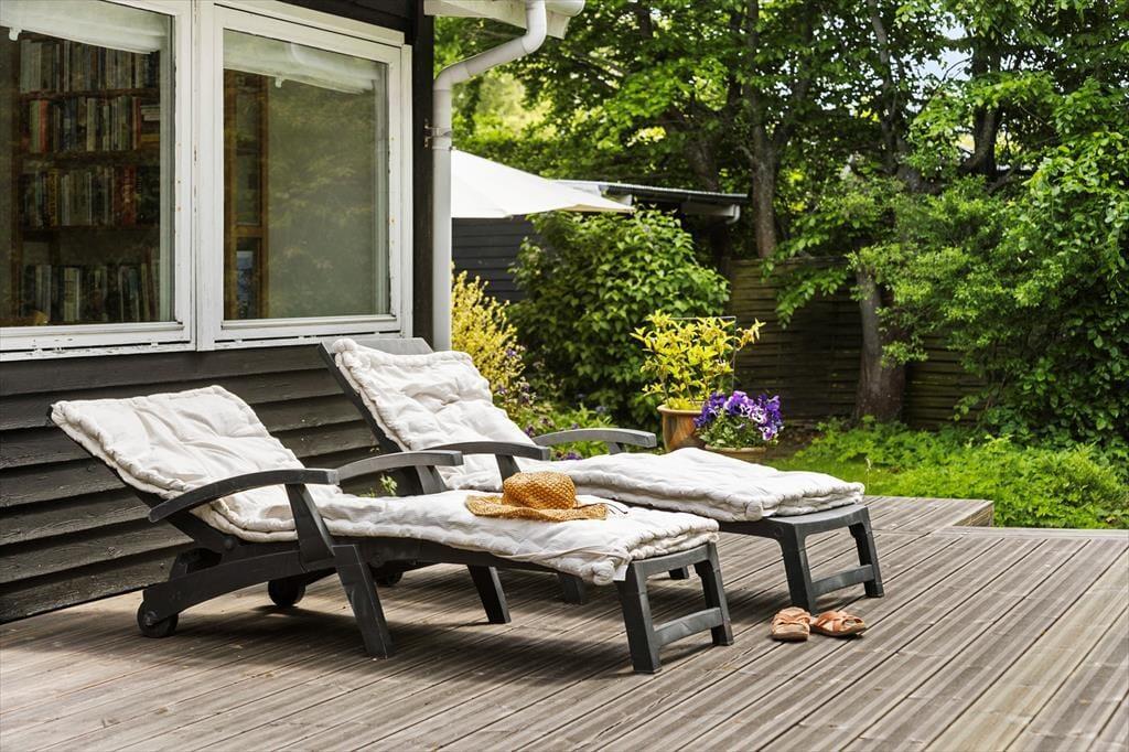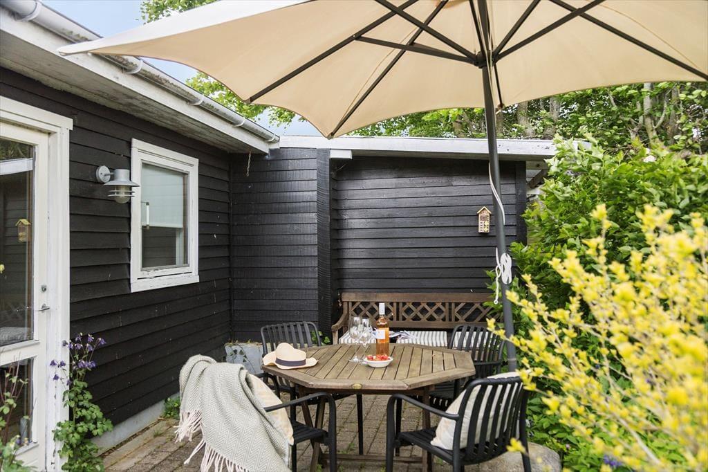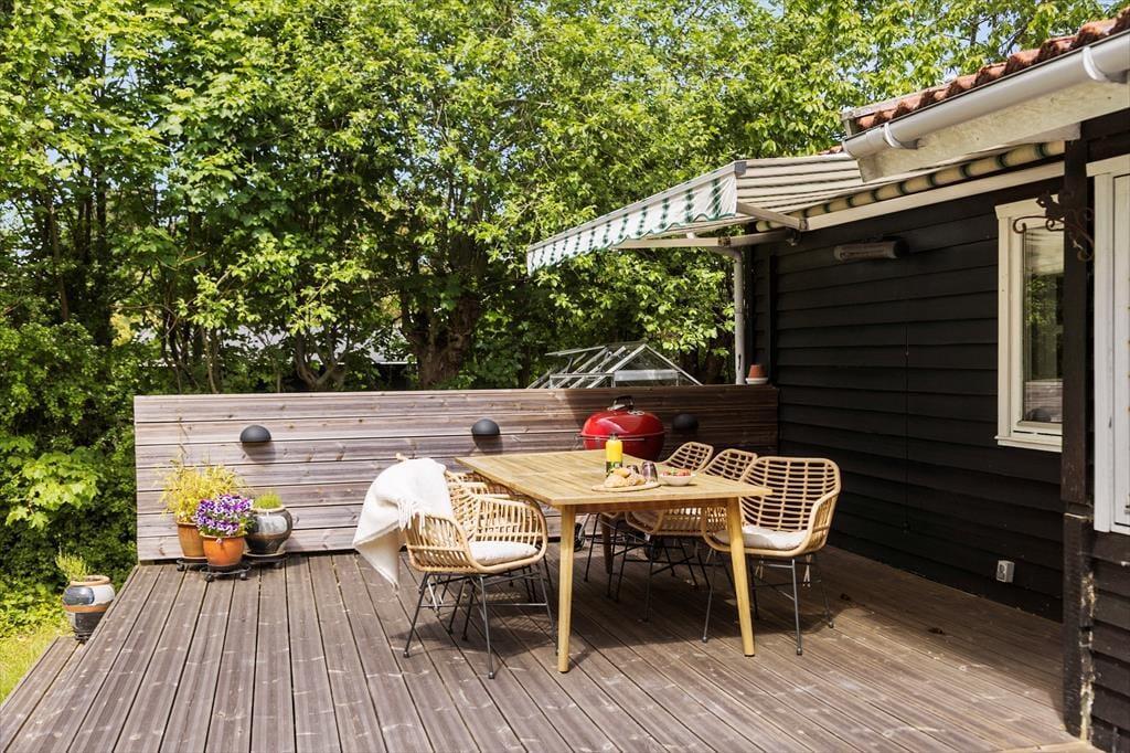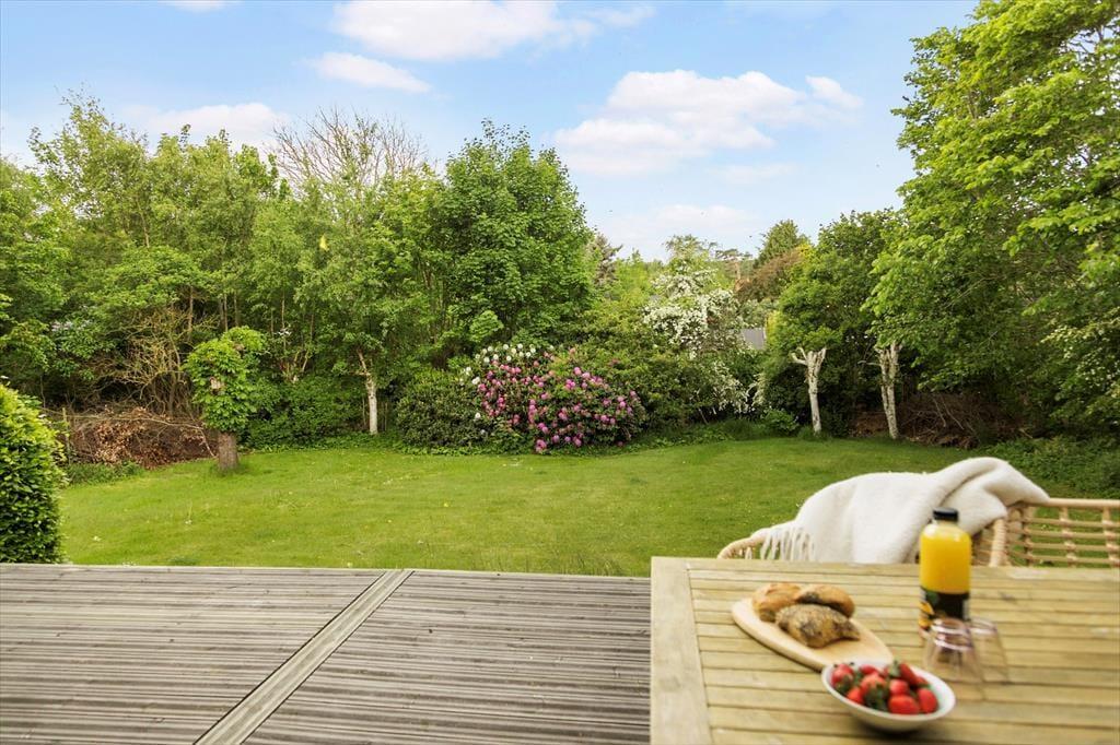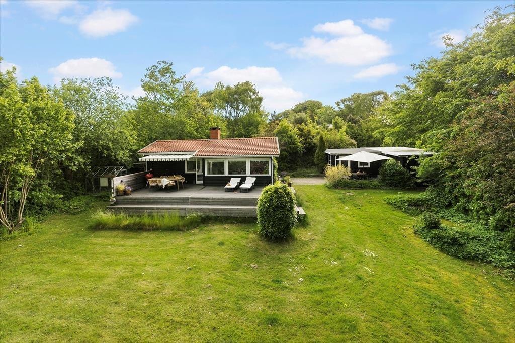 Omgivet af en frodig grund med buske, træer og en grøn græsplæne er sommerhuset en oase af fred og ro. Lad hverdagens stress forsvinde, mens du slentrer rundt i den naturskønne have eller nyder en afslappende i liggestolen på stund på den store træterrasse.