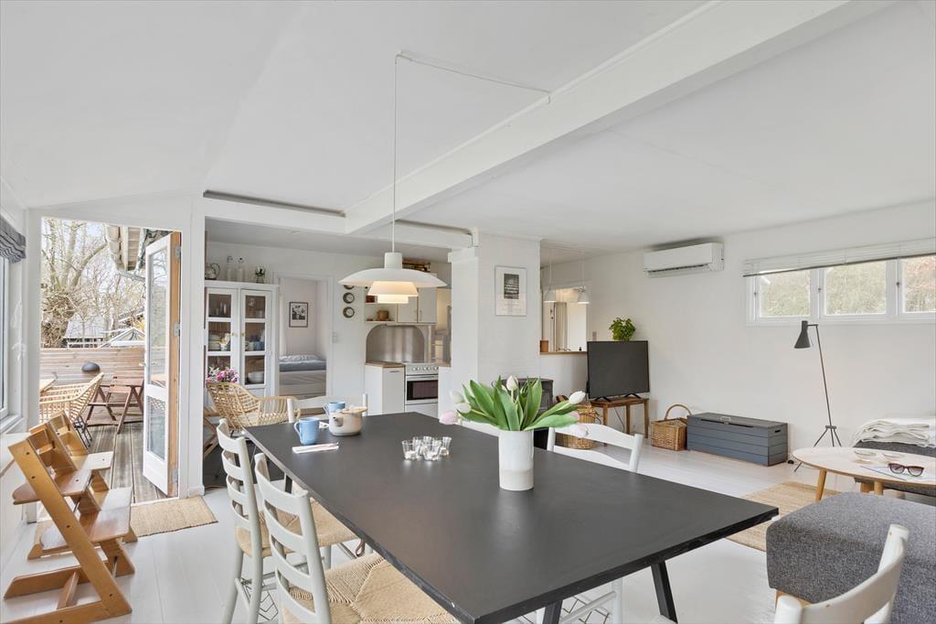 Træd ind i den hyggelige opholdsstue, hvor en knitrende brændeovn spreder varme og stemning, mens du slapper af i komfortable møbler og nyder selskabet af dine nærmeste. Fra opholdsstuen er der direkte adgang til terrassen, hvor du kan nyde solskinnet og den friske luft.