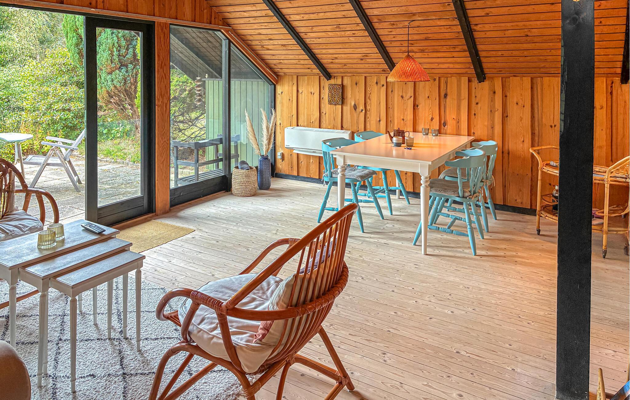 Jeres feriehus har traditionelle indretningsløsninger med masser af træ og varme farver. Huset er funktionelt designet og udstråler en jordnær, afslappet feriestemning. Find jer til rette i sofaen i stuen og nyd udsigten over haven gennem de store vinduer. En brændeovn sørger for hyggelig varme og en behagelig atmosfære på kølige dage. I det tilstødende køkken finder I alt, hvad I behøver for at tilberede jeres feriemåltider, som I derefter kan nyde ved spisebordet.