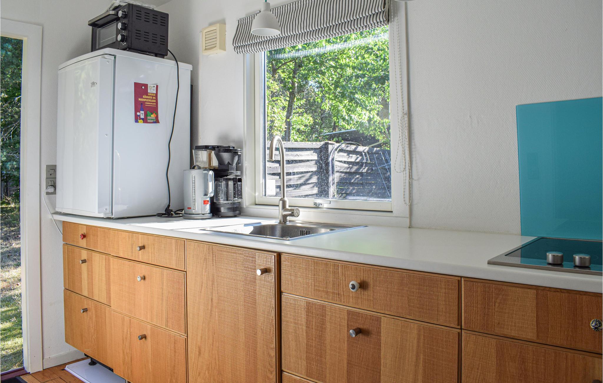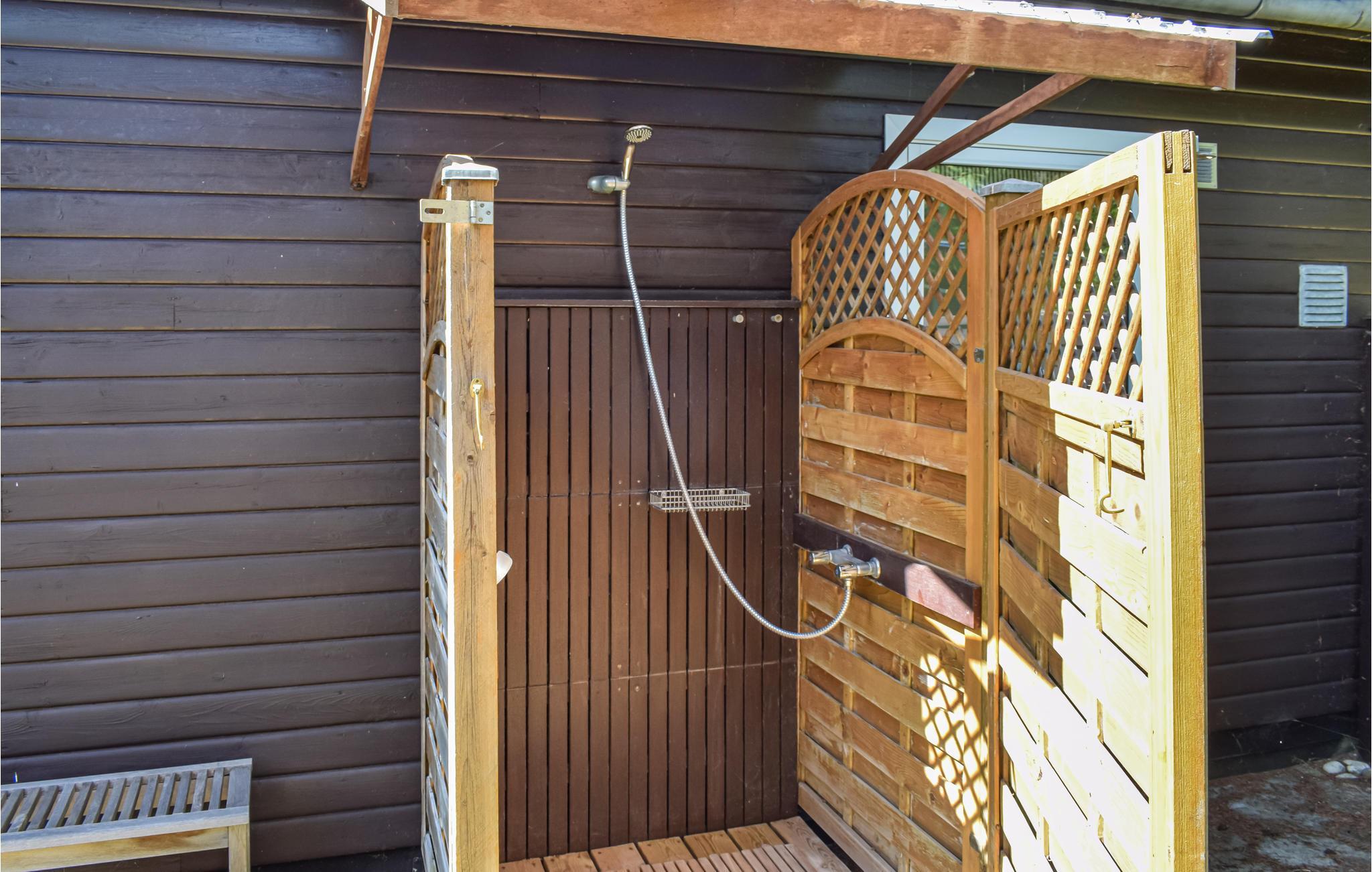 Huset har 2 gode soveværelser og et hvidt badeværelse med håndbruser. Rigtig sødt lille sommerhus med masser af stemning. Der er udebruser med varmt og koldt vand, der virkelig kommer til gavn efter svømmeturen i havet, som ligger ca. 1000 m fra huset. Her ligger også ishus og restaurant til de dage, hvor ferien skal nydes lidt ekstra.