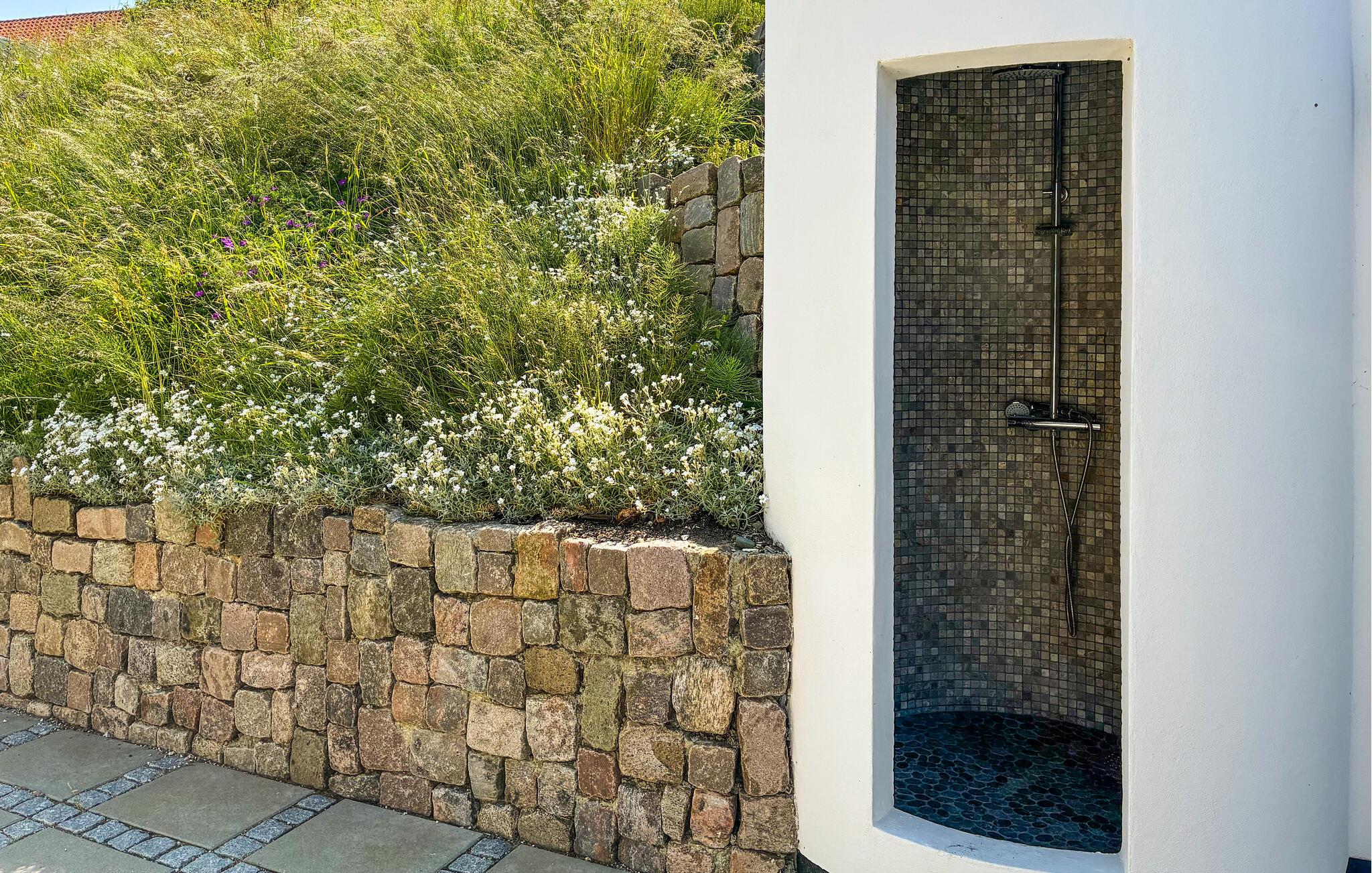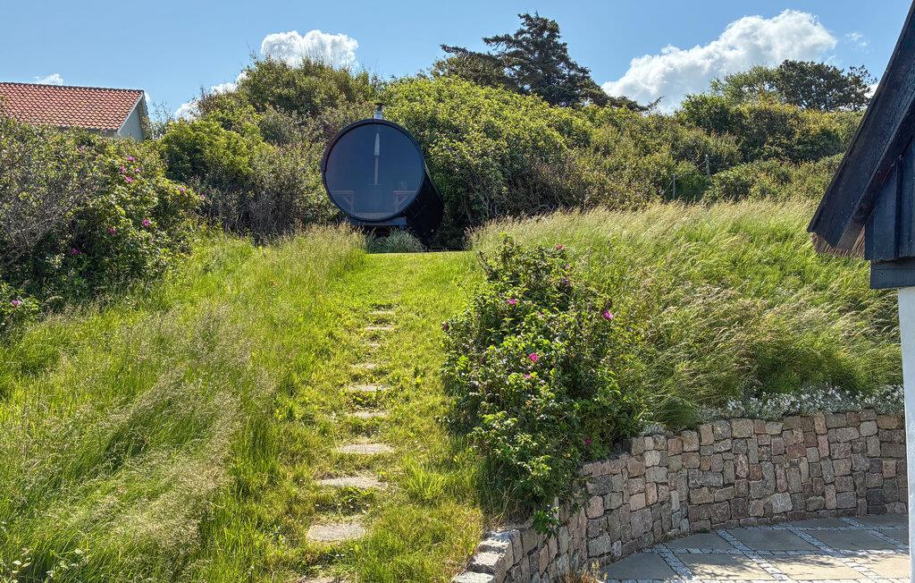 Sæt jer til rette på den overdækkede træterrasse i det komfortable loungehjørne eller nyd måltiderne i det åbne siddeområde med direkte udsigt over vandet. Tøndesaunaen med panoramavindue giver jer en særlig wellnessoplevelse, for her kan I samtidig nyde en smuk havudsigt. Udendørsbruseren er smart, når I skal vaske sandet af efter en strandtur.