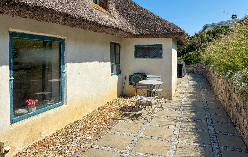 Tilbring en dejlig ferie i dette stråtagshus lige ved stranden. Nyd indretningen med hyggelige siddeområder, trægulve og varme farver. Kig ud af de store vinduer mod havet eller slap af med en bog i en af ??de komfortable lænestole. Tilbered lækre retter i køkkenet og nyd måltiderne sammen ved spisebordet eller på terrassen.
