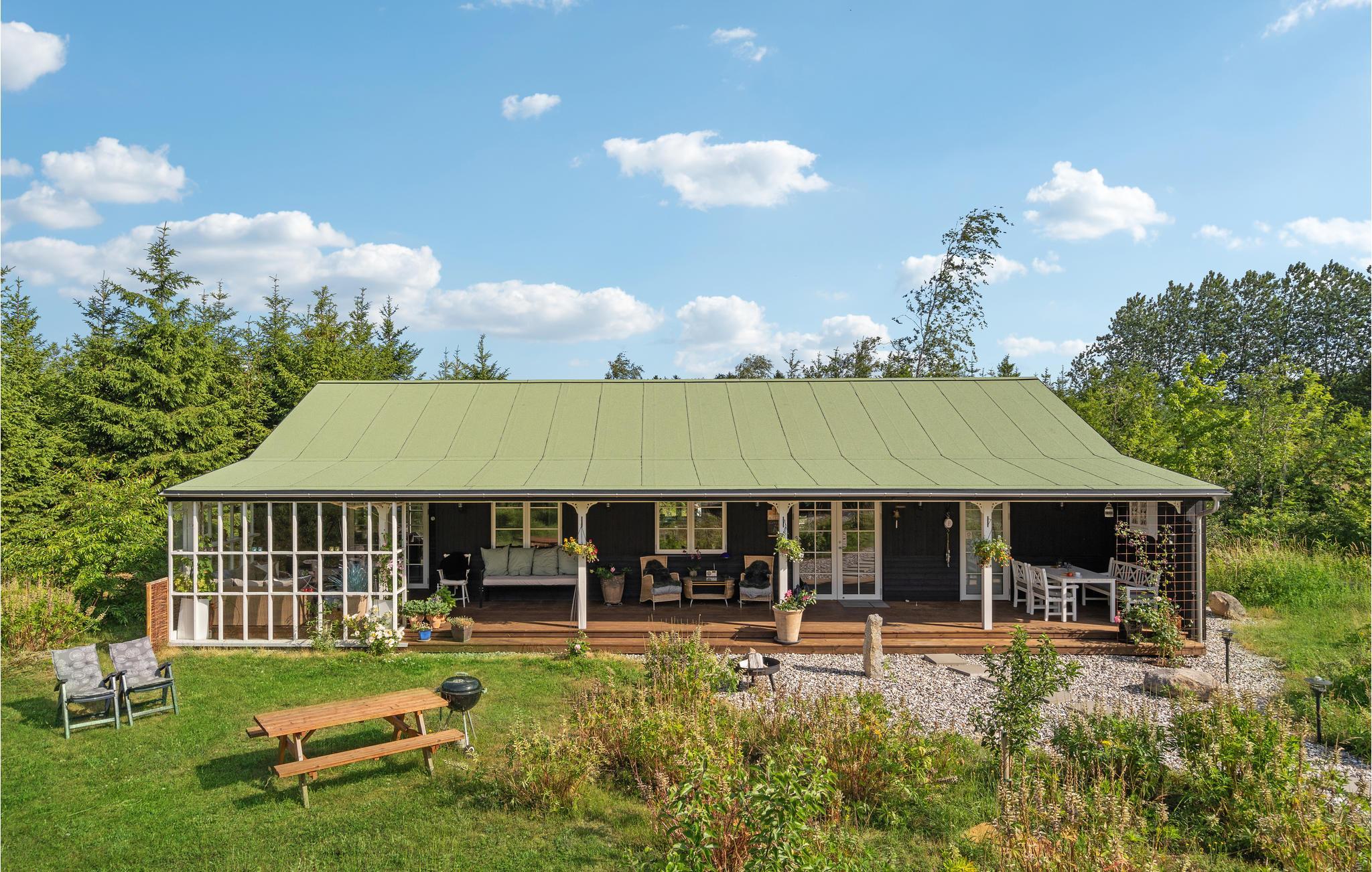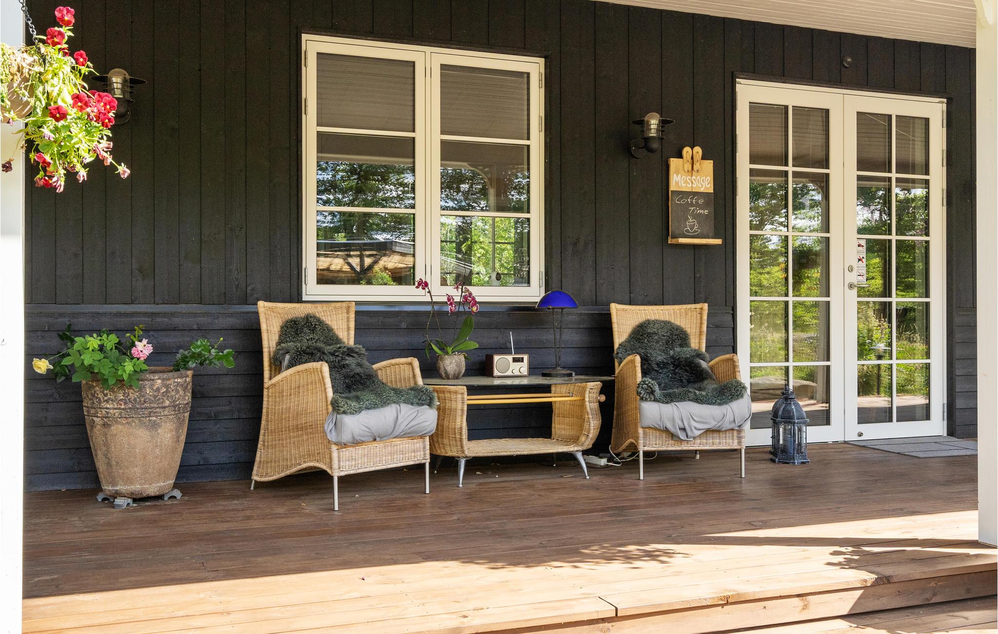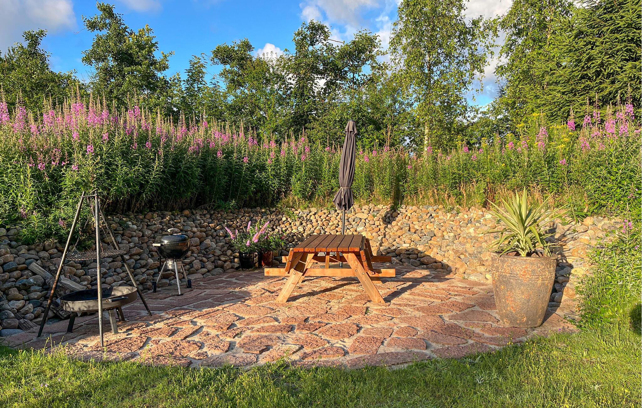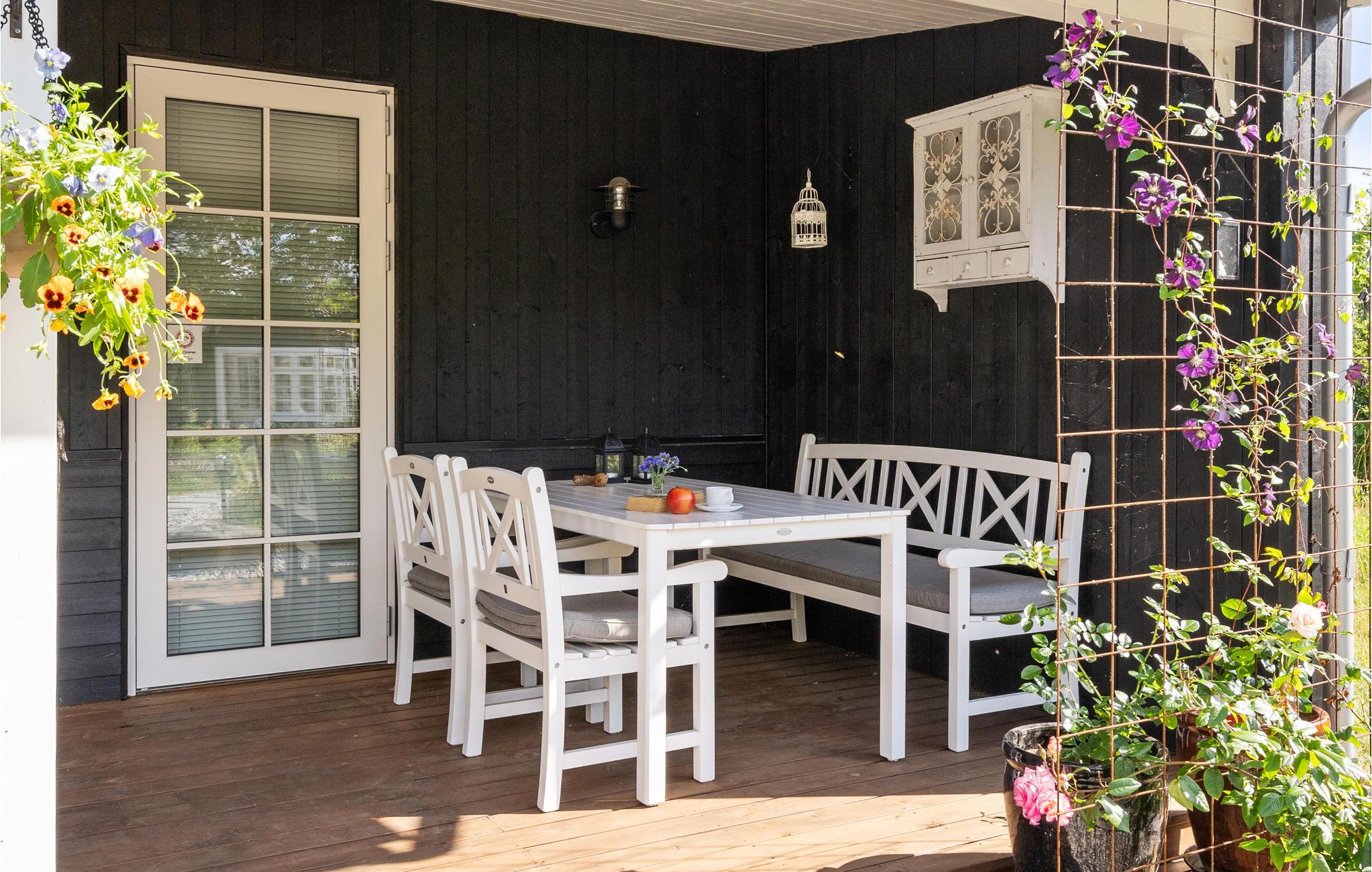 Et højdepunkt i huset er den store overdækkede veranda, hvor I kan sidde beskyttet med udsigt over haven. Her kan I slappe af med en god bog, mens børnene leger i haven.