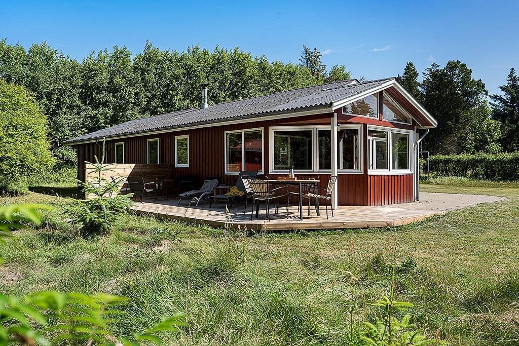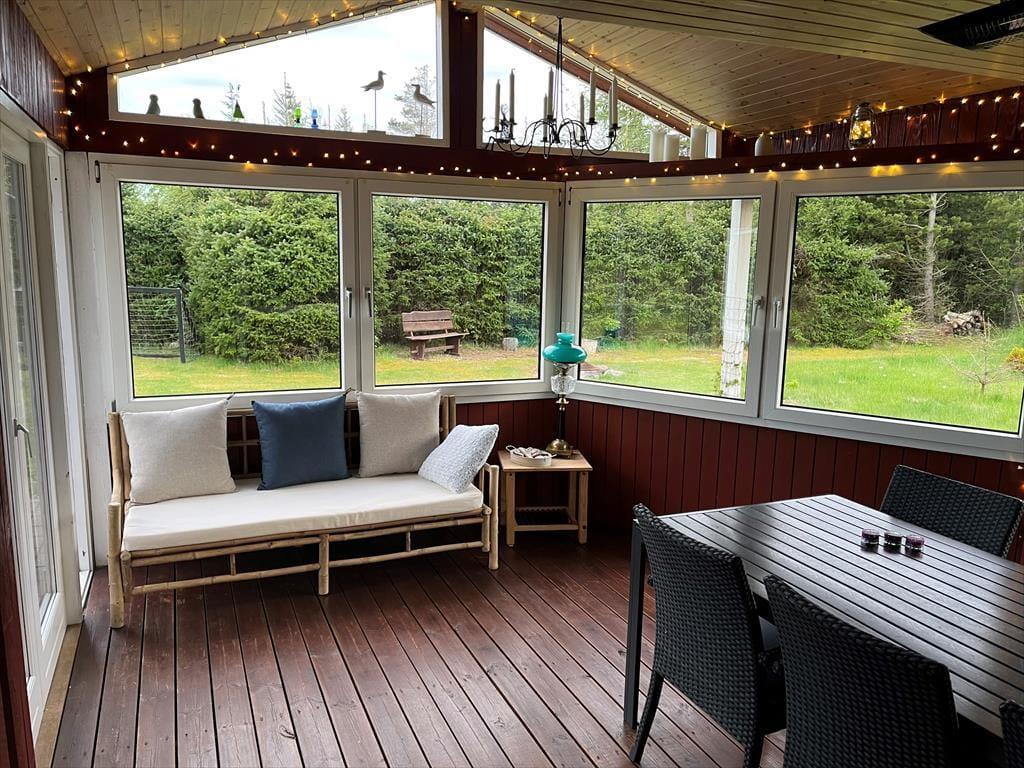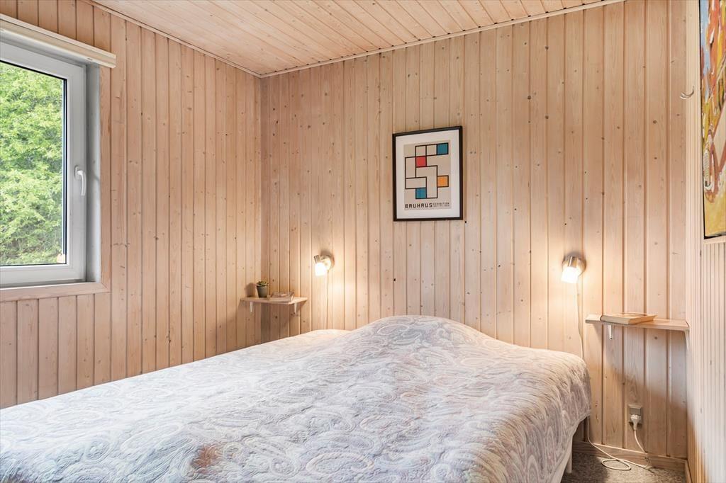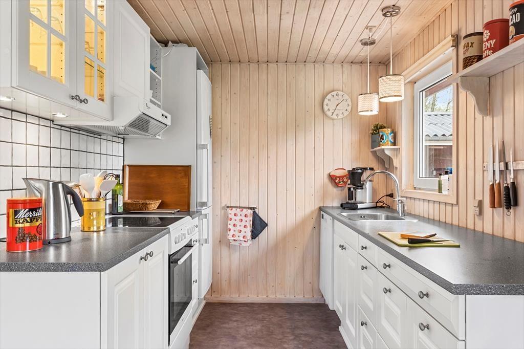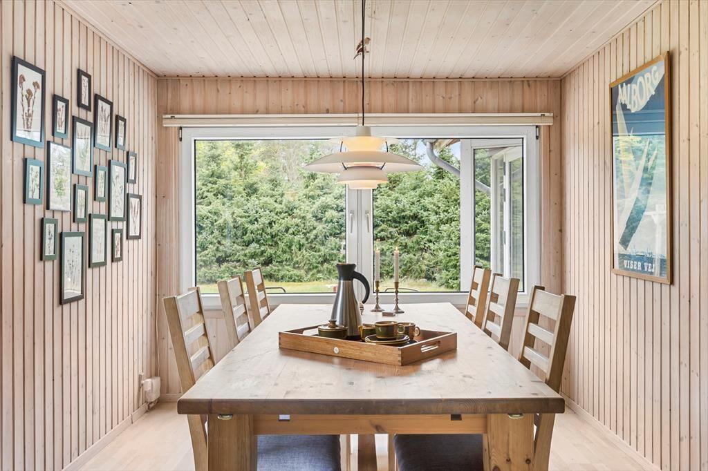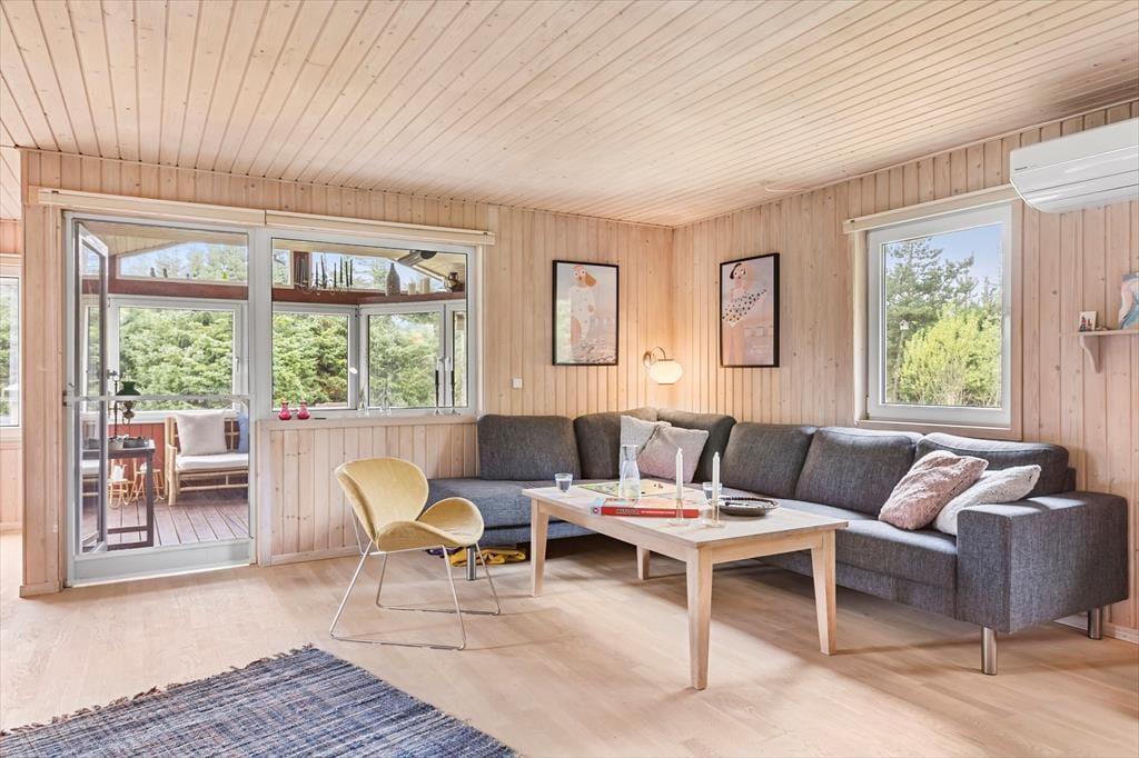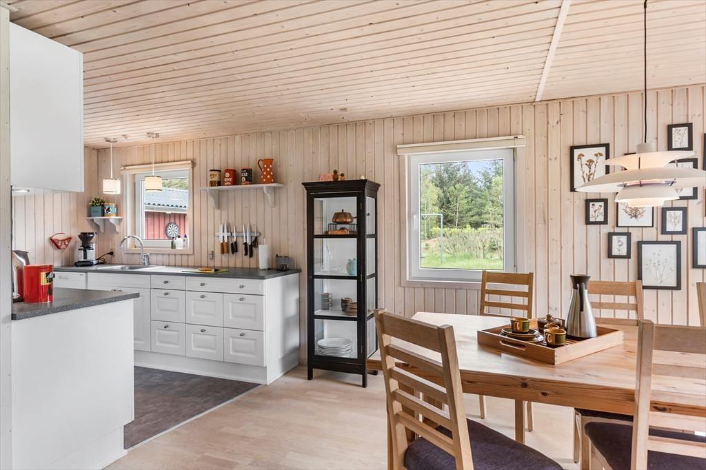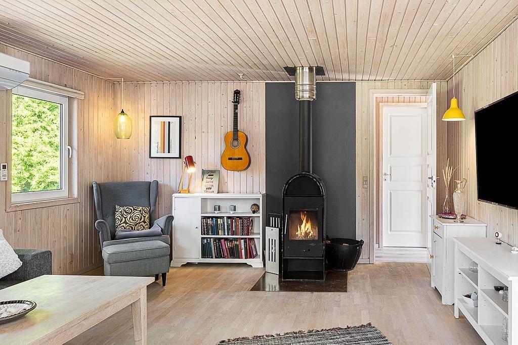 Atmosfæren er helt i top inden døre i sommerhuset, for rummene fremstår venlige og imødekommende. På klassisk vis er der lys træbeklædning på væggene og komfortabelt møblement overalt – og i stuen står en brændeovn, der nok skal hjælpe til med at give en rar temperatur selv på kølige tider af året. Er det lunt i vejret, vil du måske foretrække husets udestue, for her får du fuldt udbytte af det smukke lysindfald og udsigten til den grønne naturgrund. Både sommer og vinter er det åbne køkken et dejligt sted at kræse om madlavningen, og når det er sengetid, kan du og dit selskab fordele jer på husets tre gode soveværelser.
