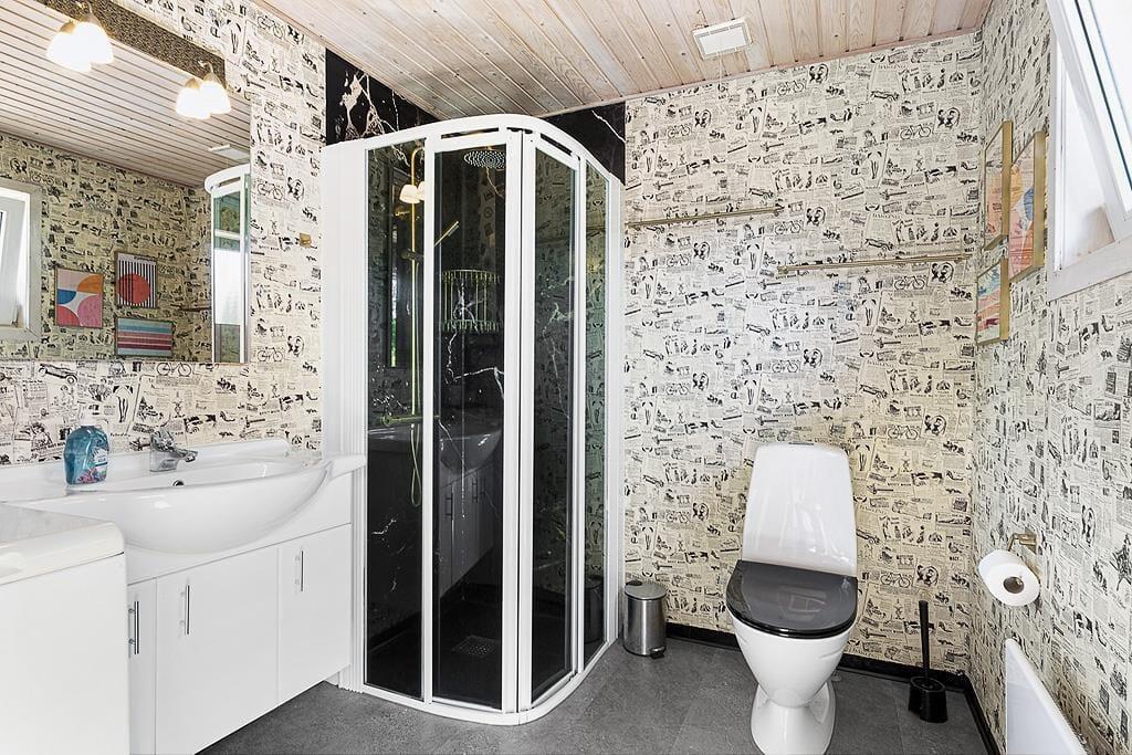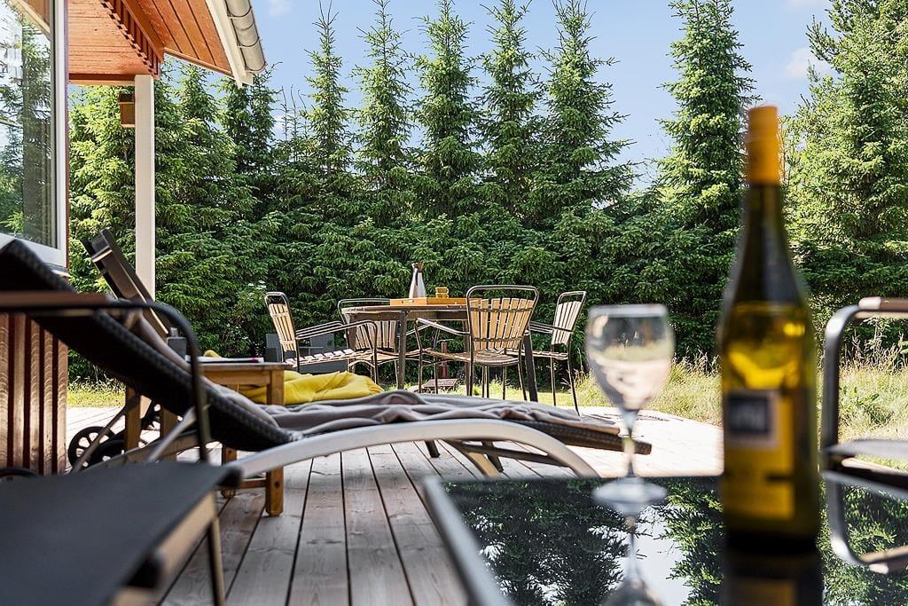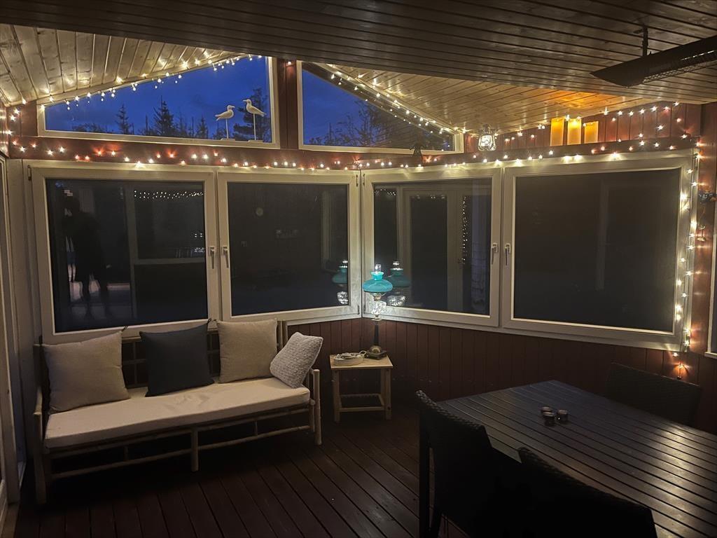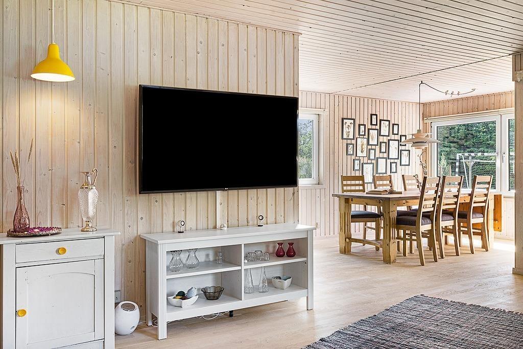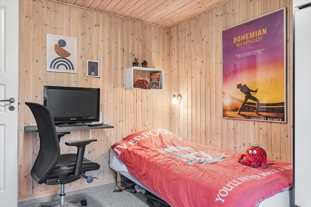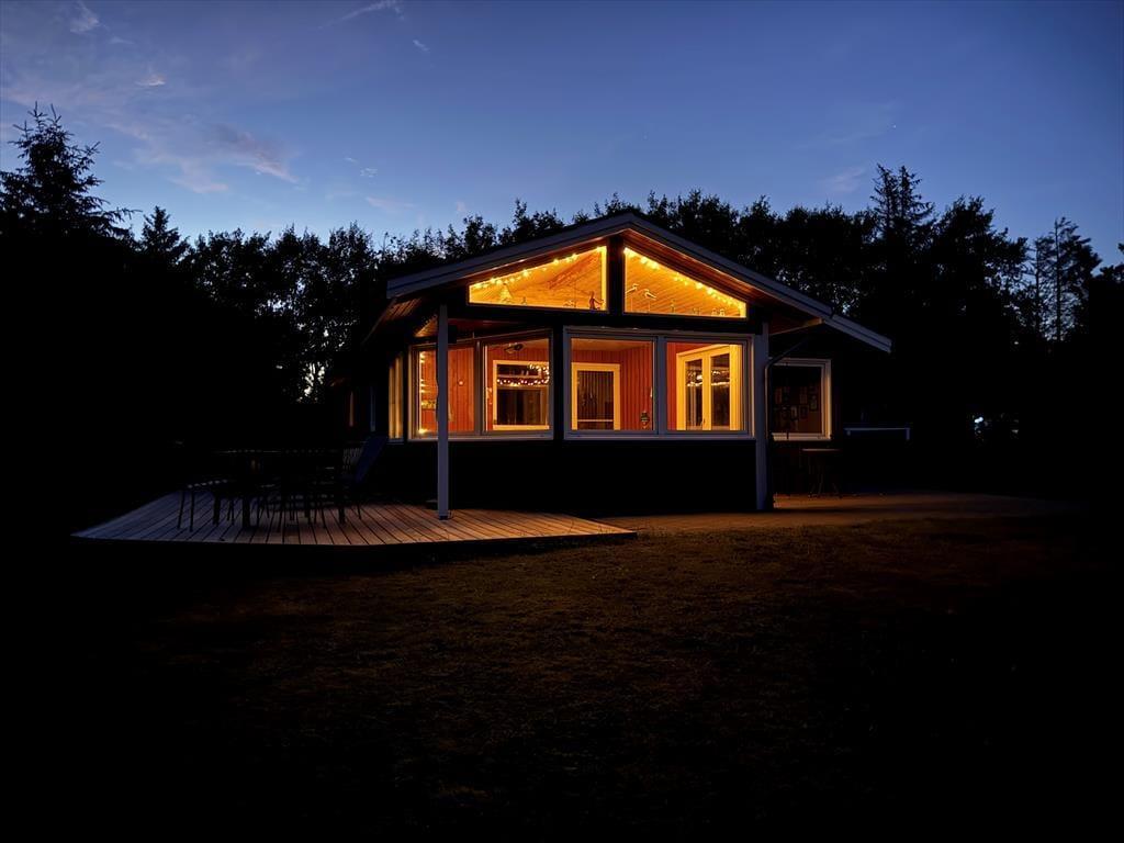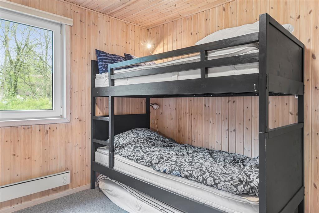 Atmosfæren er helt i top inden døre i sommerhuset, for rummene fremstår venlige og imødekommende. På klassisk vis er der lys træbeklædning på væggene og komfortabelt møblement overalt – og i stuen står en brændeovn, der nok skal hjælpe til med at give en rar temperatur selv på kølige tider af året. Er det lunt i vejret, vil du måske foretrække husets udestue, for her får du fuldt udbytte af det smukke lysindfald og udsigten til den grønne naturgrund. Både sommer og vinter er det åbne køkken et dejligt sted at kræse om madlavningen, og når det er sengetid, kan du og dit selskab fordele jer på husets tre gode soveværelser.
