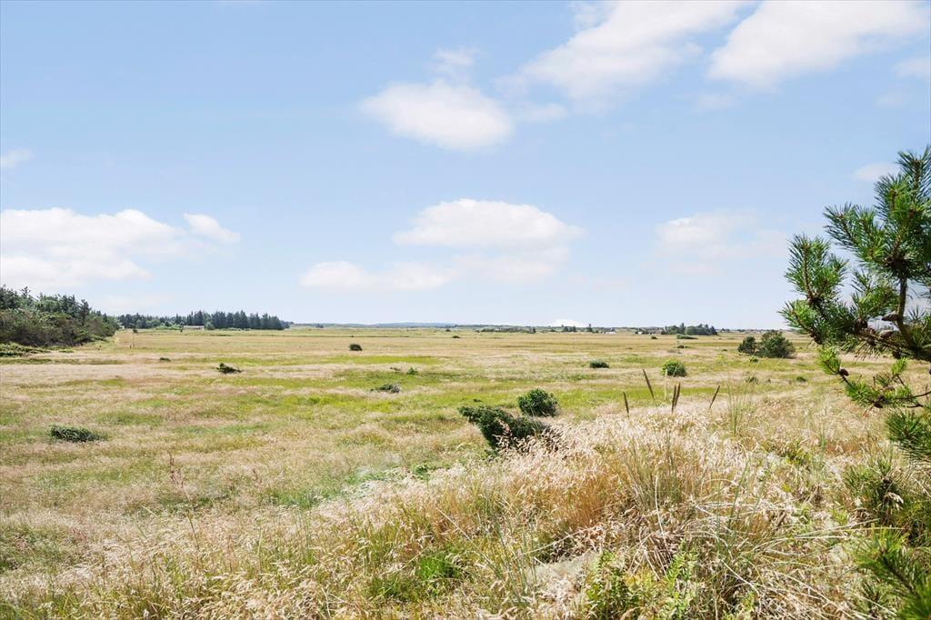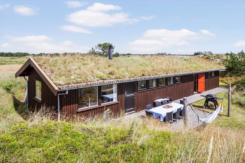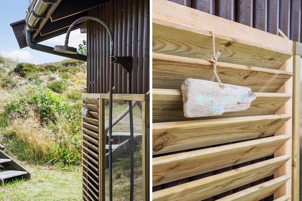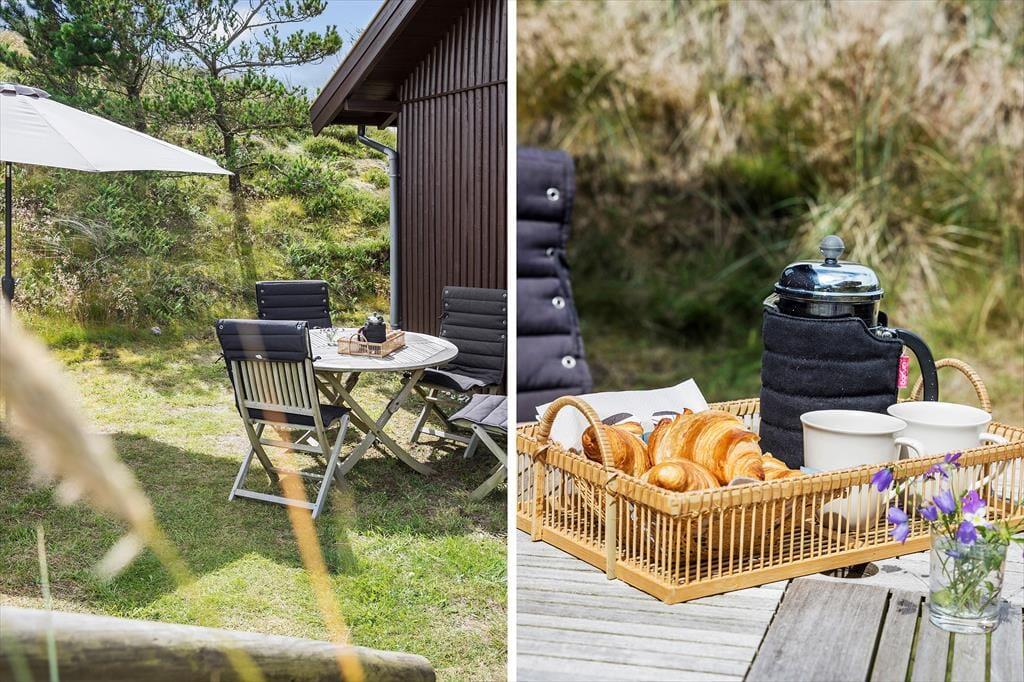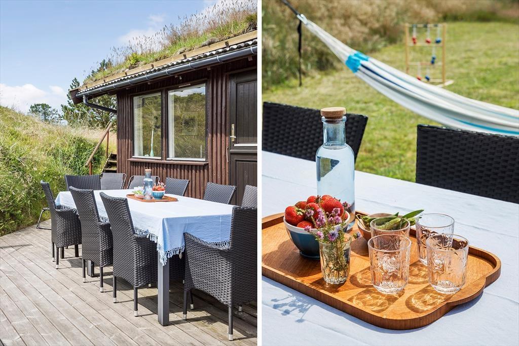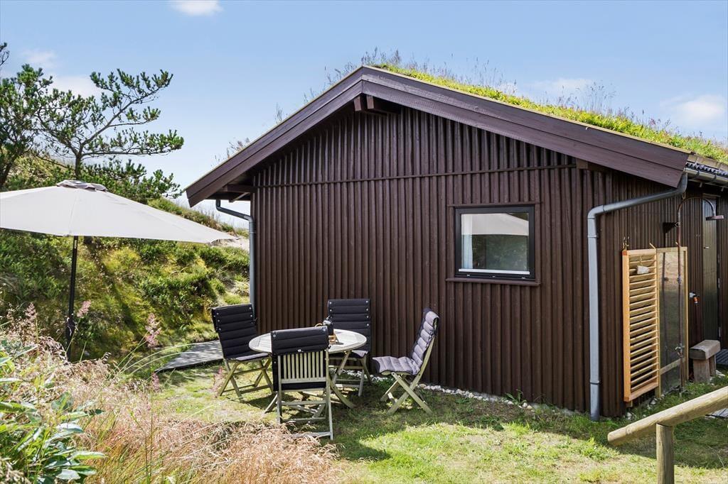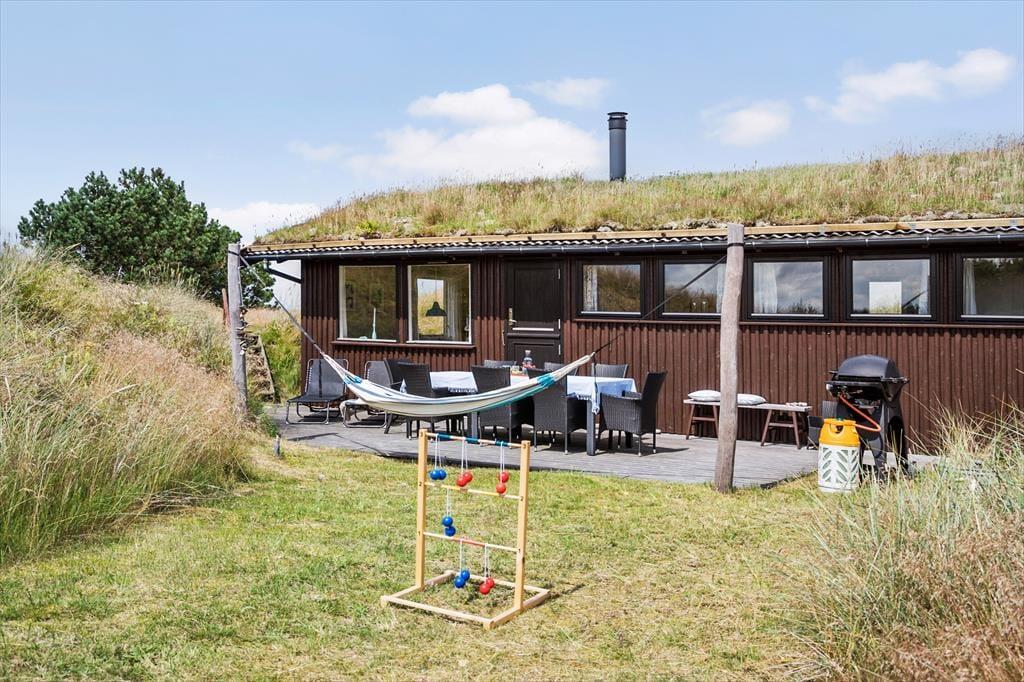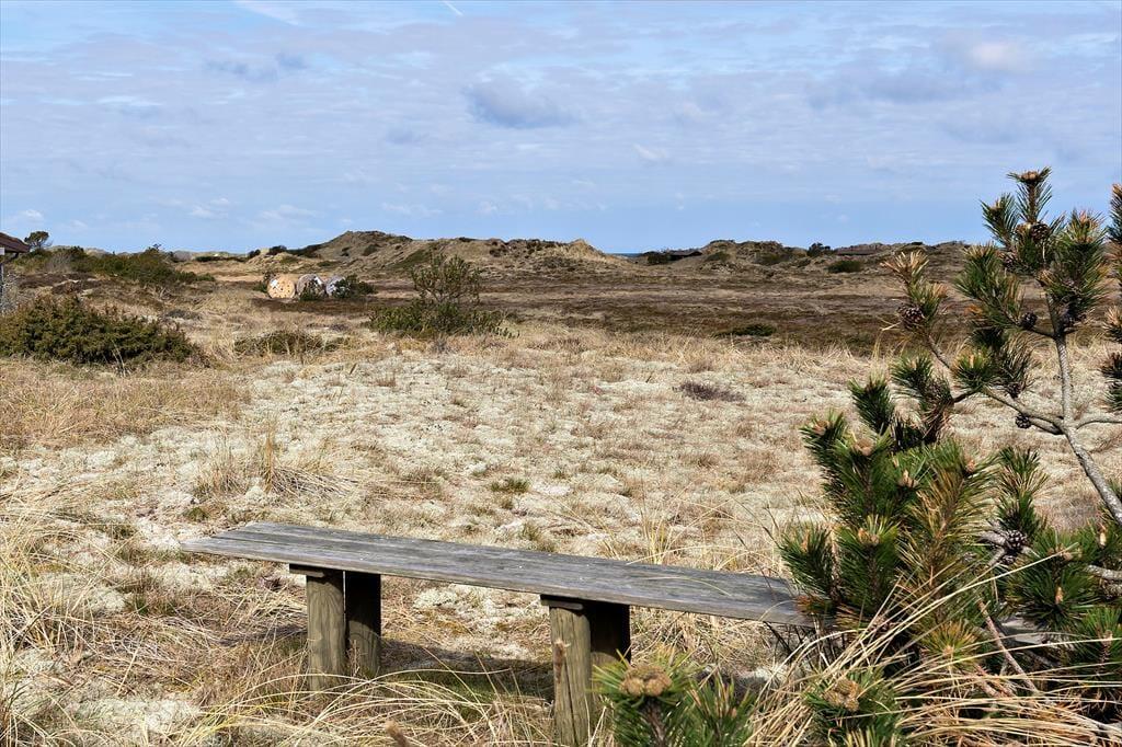 Sommerhusgrunden er en kæmpestor naturgrund med bløde, små klitter, der afskærmer huset på naturlig vis. Lige omkring huset kan I nyde livet i havemøblerne – eventuelt i skyggen under parasollen eller med gang i grillen – og alternativt kan I sætte jer op på udsigtsbænken, hvis I vil se langt ud over landskabet og beundre solnedgangen.
