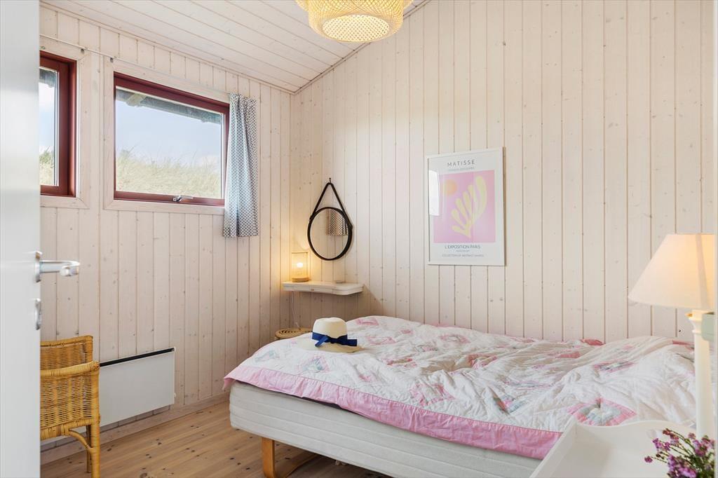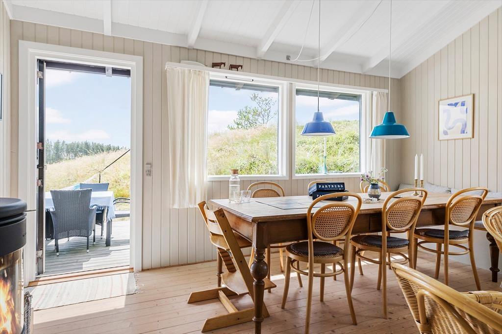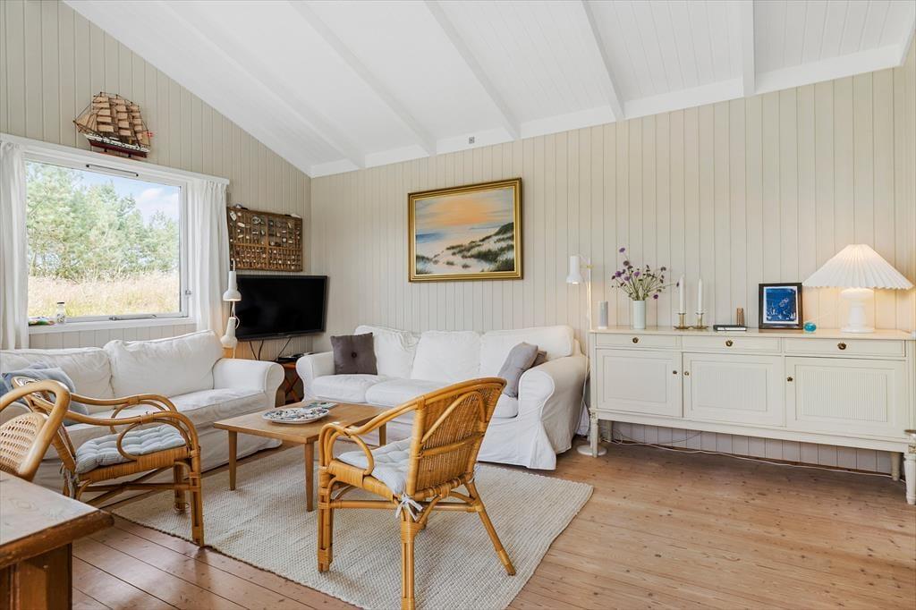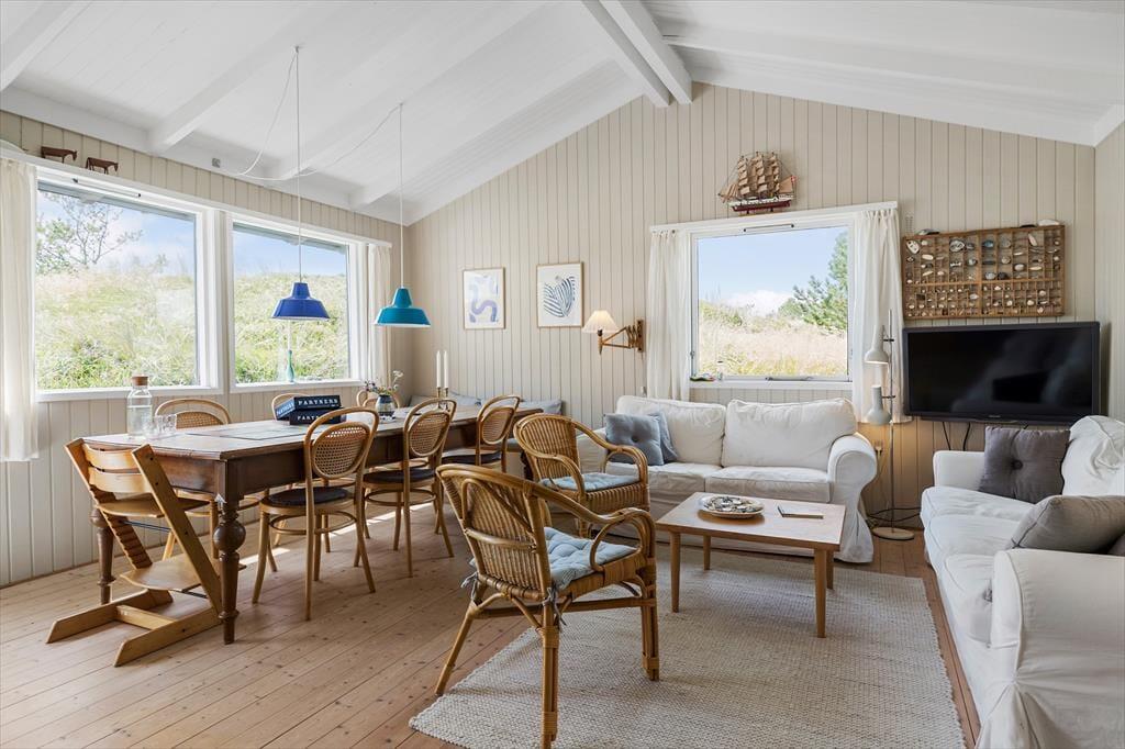 Rødhus er et storslået og vidtstrakt landskab, og inden døre i netop dette sommerhus får man virkelig fornemmelsen af holde ferie i pagt med naturen, når man kigger lige ud på lyng, marehalm og sandhjælme. Sommerhusets klassiske indretning med loft til kip, trævægge og hyggeligt møblement passer godt til naturidyllen, for der er ingen dikkedarer og overflødig luksus – bare en afslappet atmosfære og god plads til at være sammen. I alt er der 100 gode kvadratmeter at brede sig på, der blandt andet byder på en stue, et køkken, et bryggers og to badeværelser. Soveværelser er der fire af, hvoraf tre er indrettet med dobbeltseng og det fjerde byder på to enkeltsenge