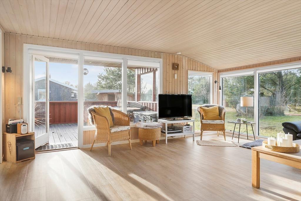 Dette velholdte sommerhus i Rødhus er udstyret med brændeovn i den hyggelige stue, så I kan have det varmt og godt inden døre selv på en kold dag. Er vejret solrigt og sommerligt, kan driverlivet i stedet flyttes ud på terrasserne, der smyger sig om huset på den grønne grund.