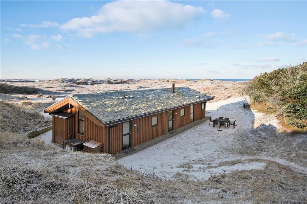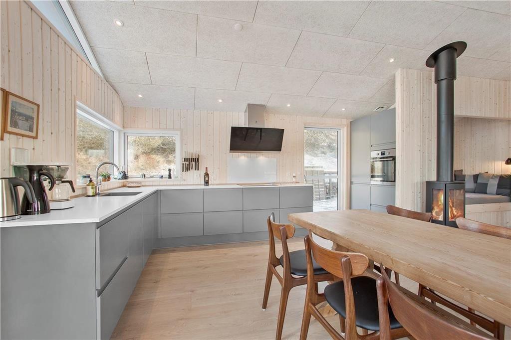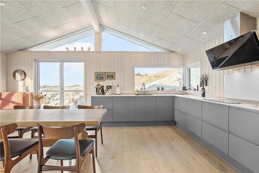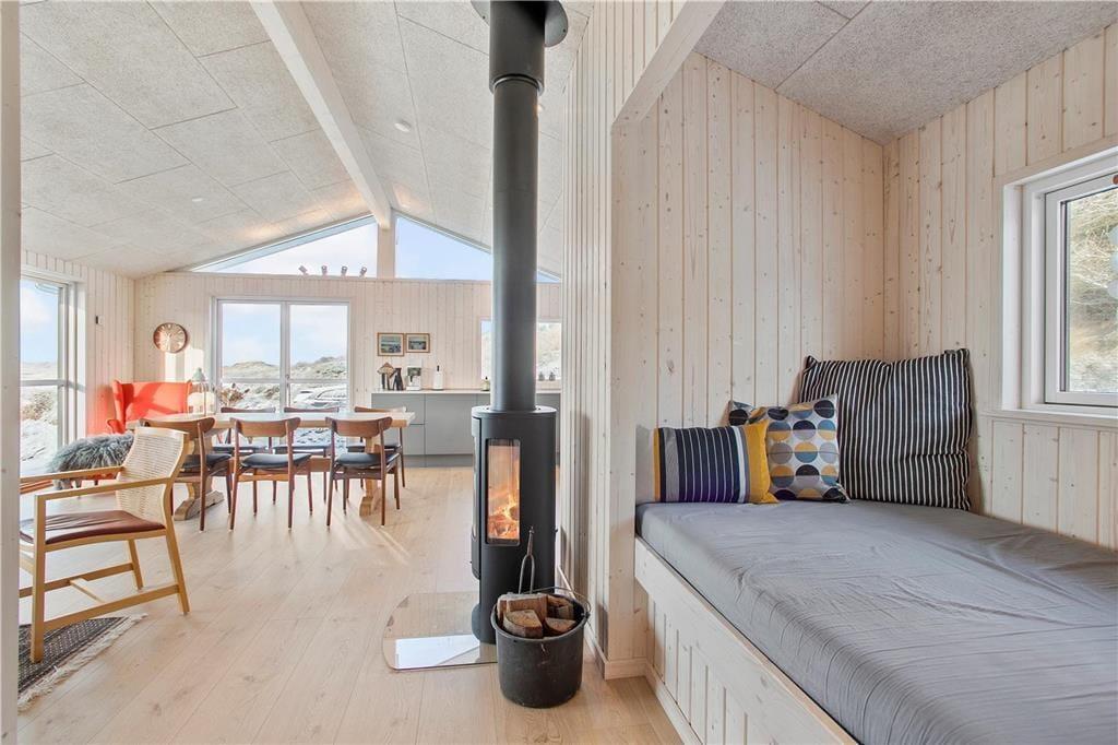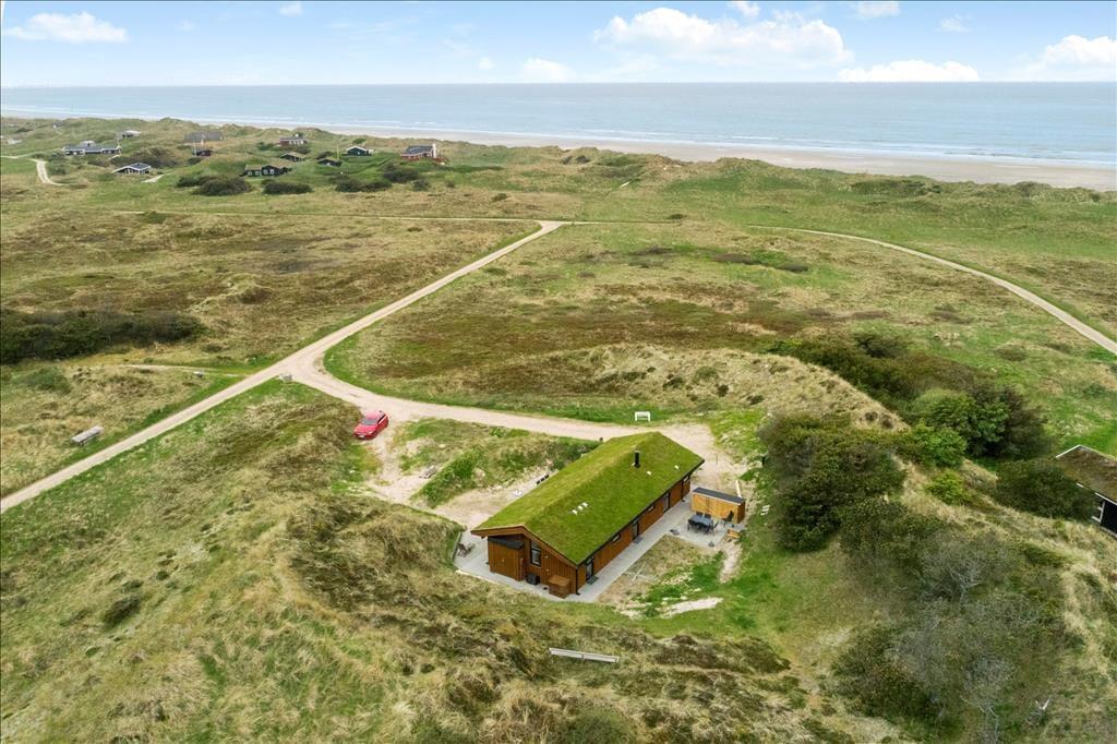 Da sommerhuset blev opført i 2020, sørgede man for at tilpasse arkitekturen til det smukke kystområde: Træfacaden og det levende tag falder godt ind blandt klitternes marehalm og fyrretræer, mens husets indre nyder godt af det flotte lysindfald, der falder gennem de mange store vinduer. Netop vinduerne giver jer samtidig en fri og uforstyrret udsigt over det åbne, kuperede landskab, hvilket må siges at være et helt perfekt bagtæppe, når der skal slappes af. Ferien kan foregå hele året rundt, for det moderne hus er udstyret med en energivenlig luft til vand-varmepumpe. Derudover er der gulvvarme i alle rum, inklusiv i bryggerset, på badeværelset og på de tre dejlige soveværelser, og i stuen står en brændeovn derudover klar til at sprede varme og hyggestemning. En alkove er et af stuens andre hyggeelementer, mens det lækre åbne køkken er endnu et eksempel på den høje kvalitet, der præger hele sommerhuset.