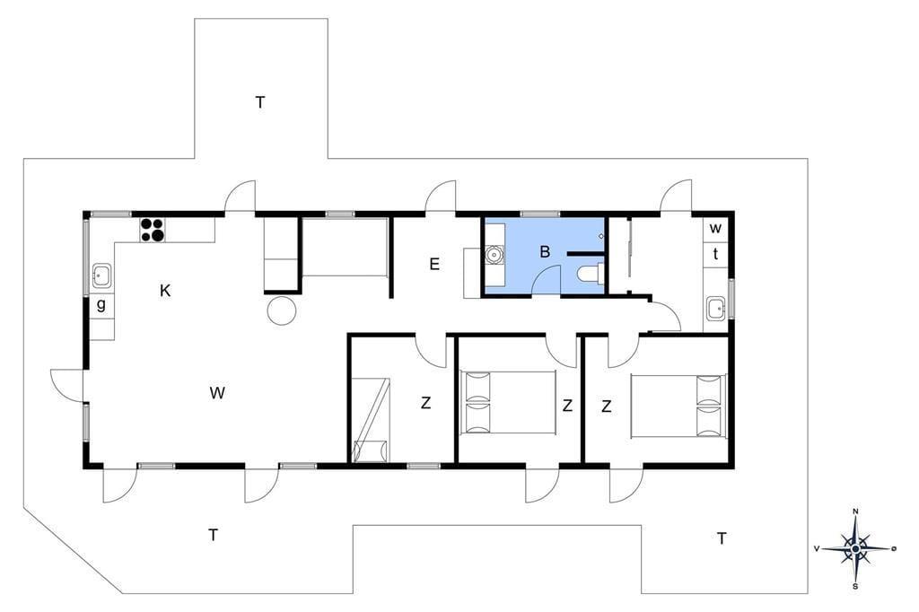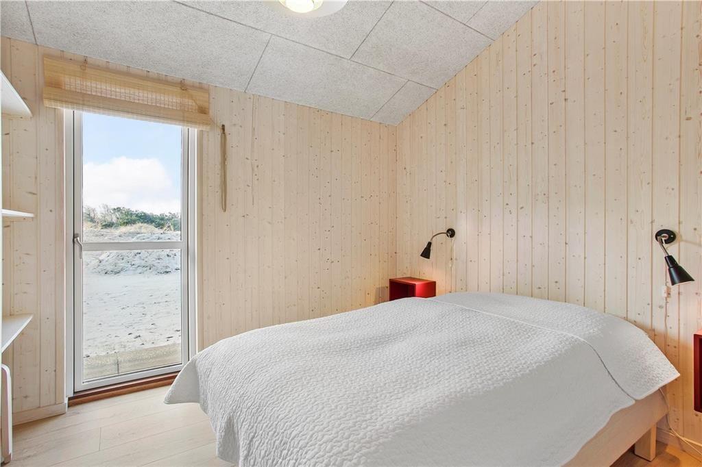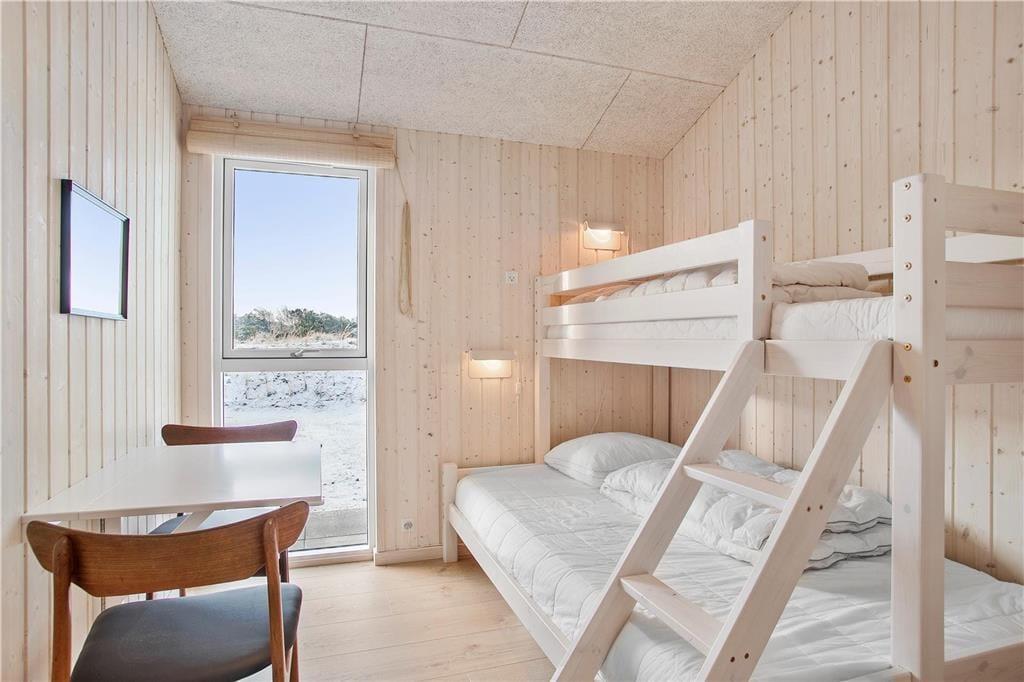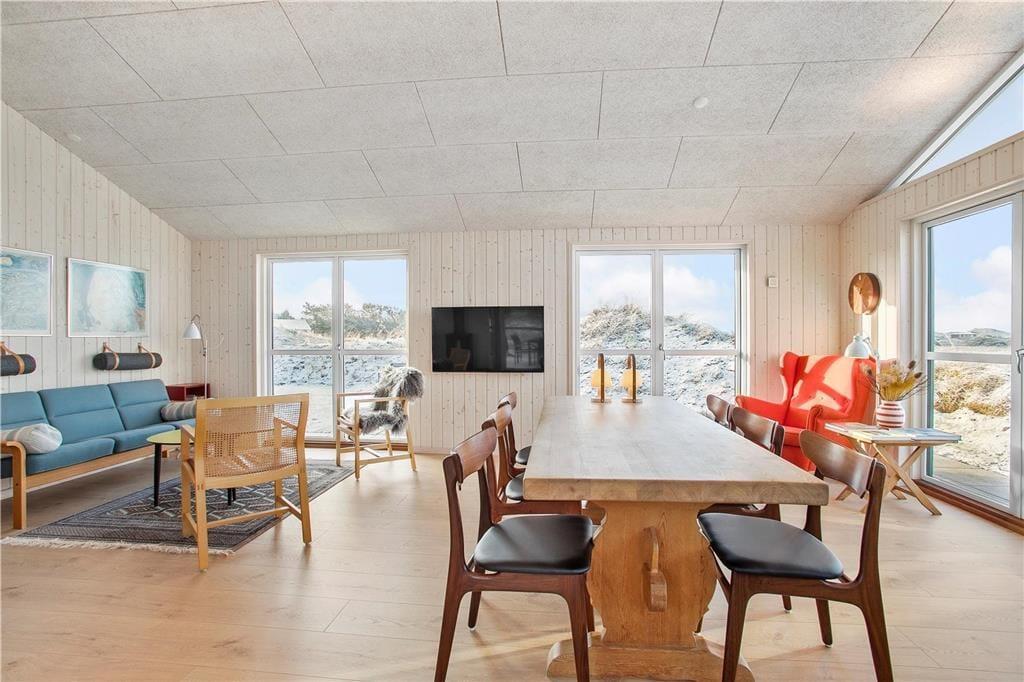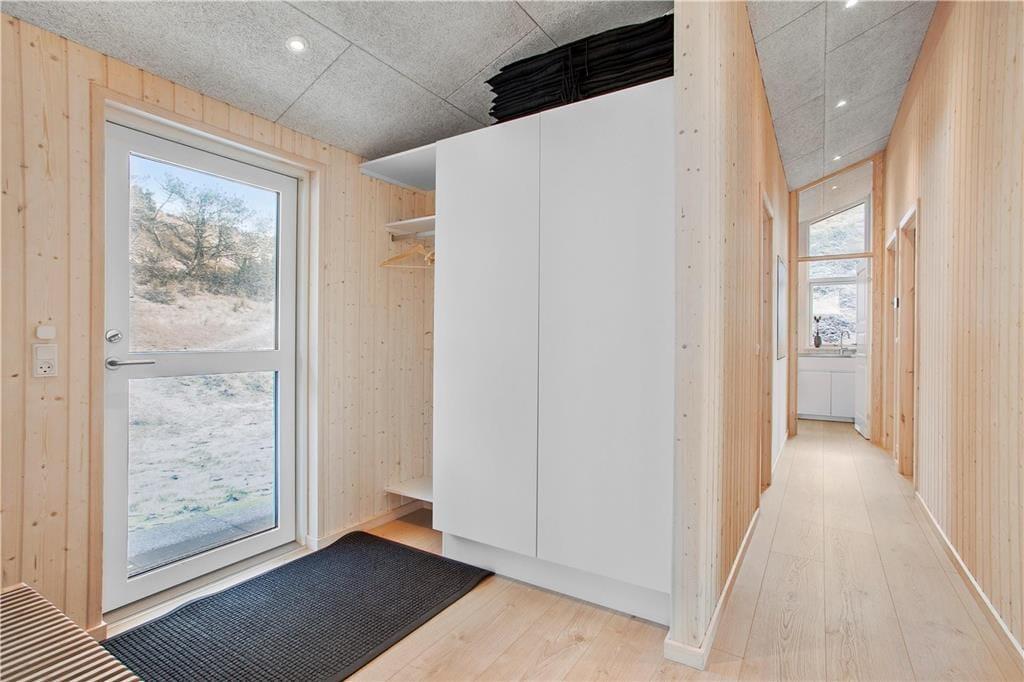 Da sommerhuset blev opført i 2020, sørgede man for at tilpasse arkitekturen til det smukke kystområde: Træfacaden og det levende tag falder godt ind blandt klitternes marehalm og fyrretræer, mens husets indre nyder godt af det flotte lysindfald, der falder gennem de mange store vinduer. Netop vinduerne giver jer samtidig en fri og uforstyrret udsigt over det åbne, kuperede landskab, hvilket må siges at være et helt perfekt bagtæppe, når der skal slappes af. Ferien kan foregå hele året rundt, for det moderne hus er udstyret med en energivenlig luft til vand-varmepumpe. Derudover er der gulvvarme i alle rum, inklusiv i bryggerset, på badeværelset og på de tre dejlige soveværelser, og i stuen står en brændeovn derudover klar til at sprede varme og hyggestemning. En alkove er et af stuens andre hyggeelementer, mens det lækre åbne køkken er endnu et eksempel på den høje kvalitet, der præger hele sommerhuset.