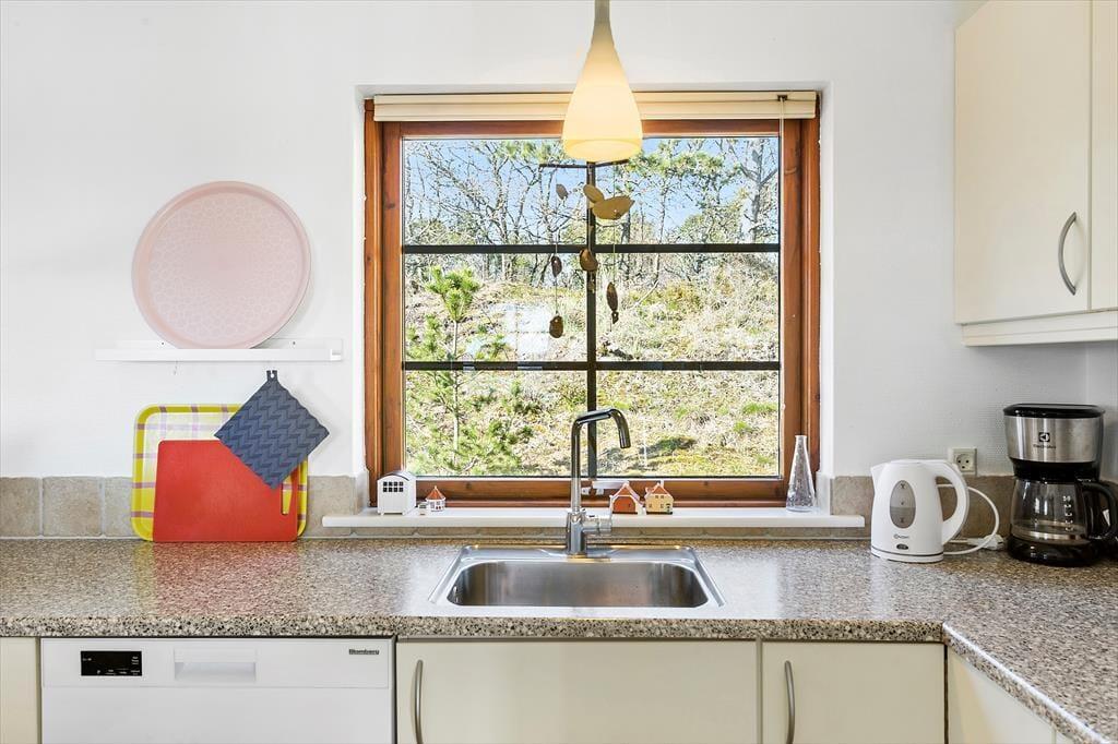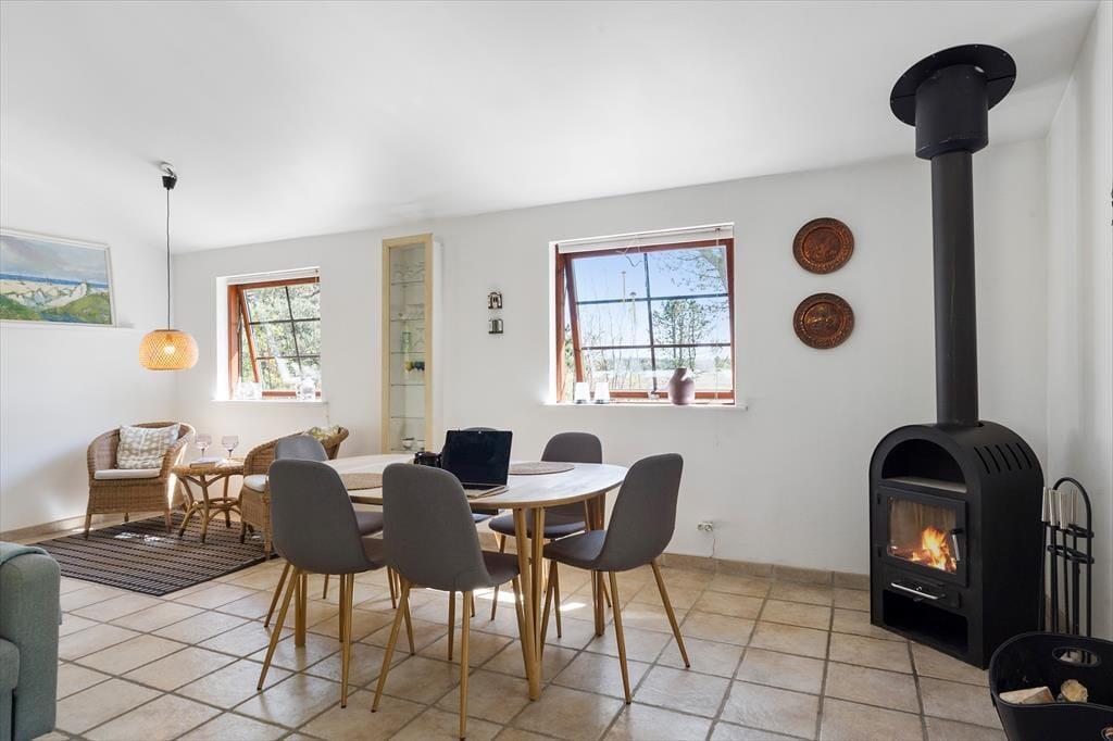 Sommerhuset er flot og godt vedligeholdt og indrettet i en gennemført stil med gode kvalitetsmøbler, et flot klinkegulv og en sikker sans for at skabe en hyggelig og varm atmosfære. Til højre for entreen er husets tre værelser og badeværelset med bruser placeret, mens det store og åbne køkken-alrum med spiseplads og stue ligger til venstre. En meget praktisk fordeling af rummene, hvis man har børn med på ferien, som stadig har brug for at komme lidt tidligt i seng. I stuen kan man slappe af i sofaen eller lænestolene foran brændeovnen, og overalt kan man gå på det gratis og trådløse internet, hvis man har brug for at tjekke mails eller børnene gerne vil se en film på en regnvejrsdag. Virkeligt gode rammer for en dejlig ferie med hele familien.